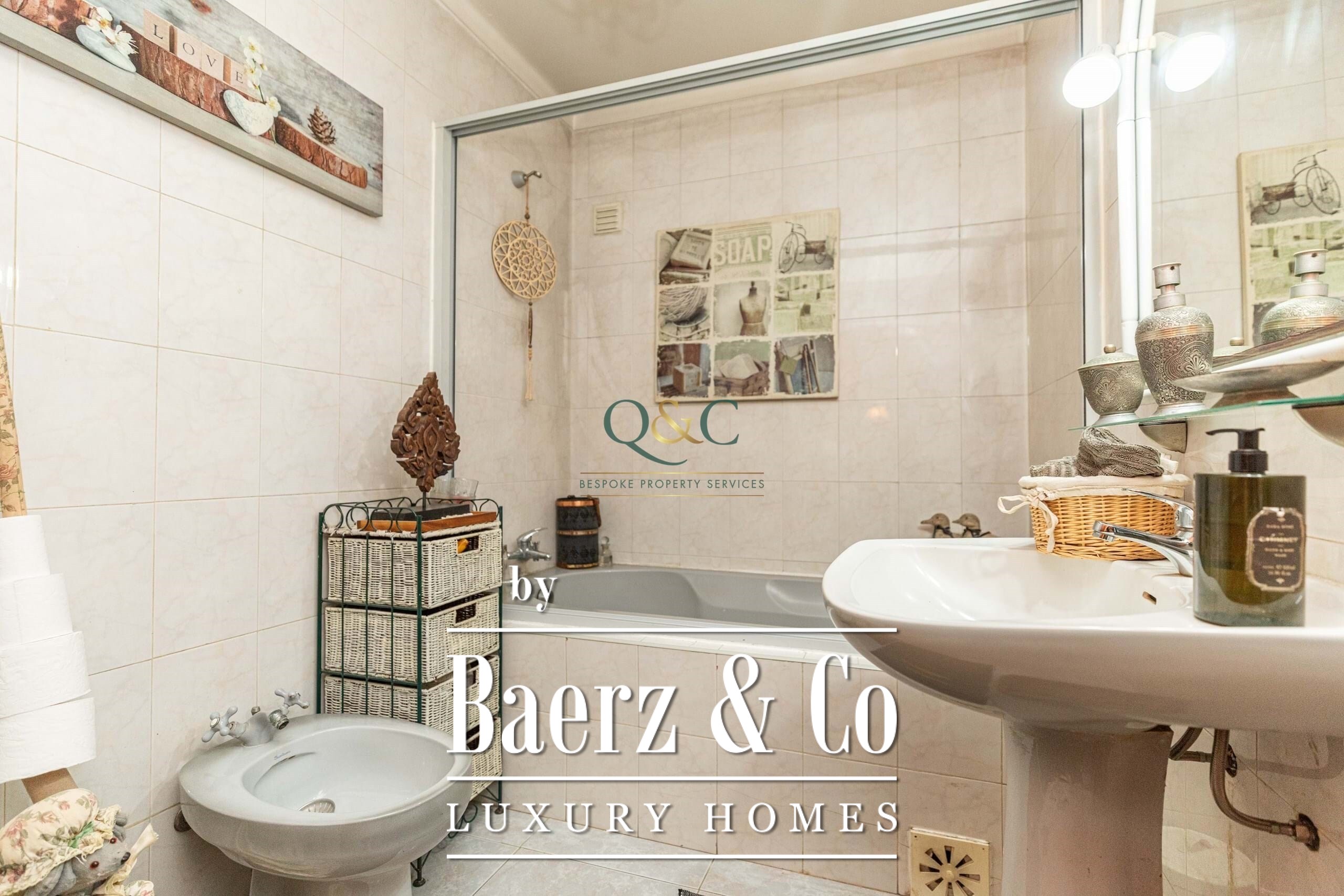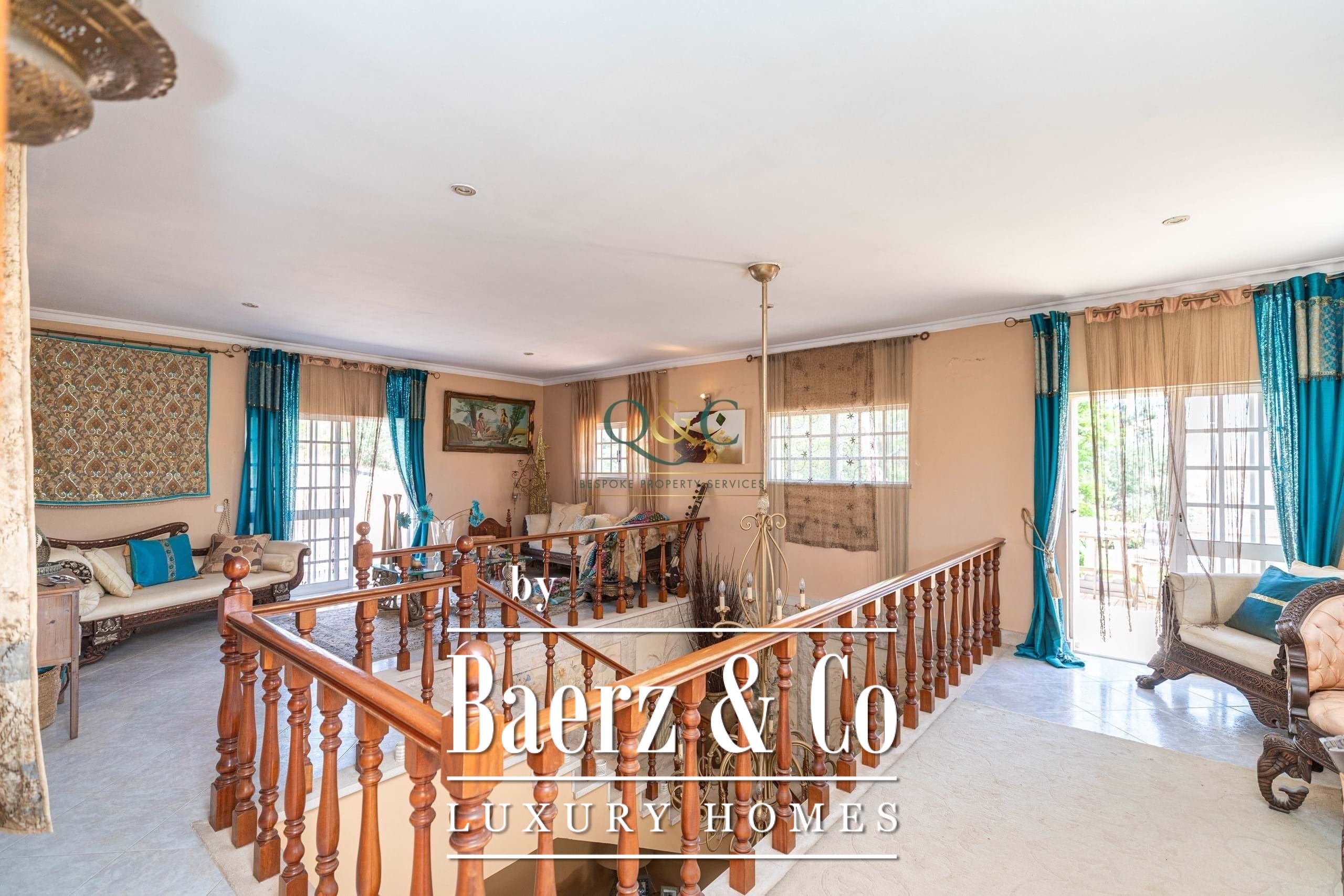 Set behind electric gates, the fully enclosed gardens provide a variety of inviting spaces for both relaxation and entertaining. From the driveway with ample parking, steps lead up to a covered main terrace and double doors opening into a grand entrance hall. This flows into a bright sitting room with fireplace and sliding doors back onto the terrace, as well as a semi-open dining room. A sweeping staircase adds a touch of grandeur, leading to the upper floor.