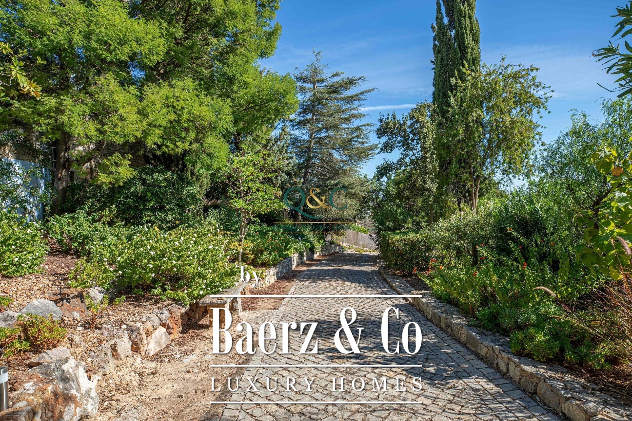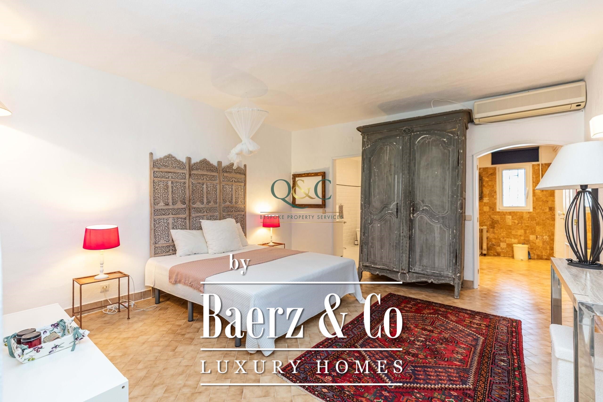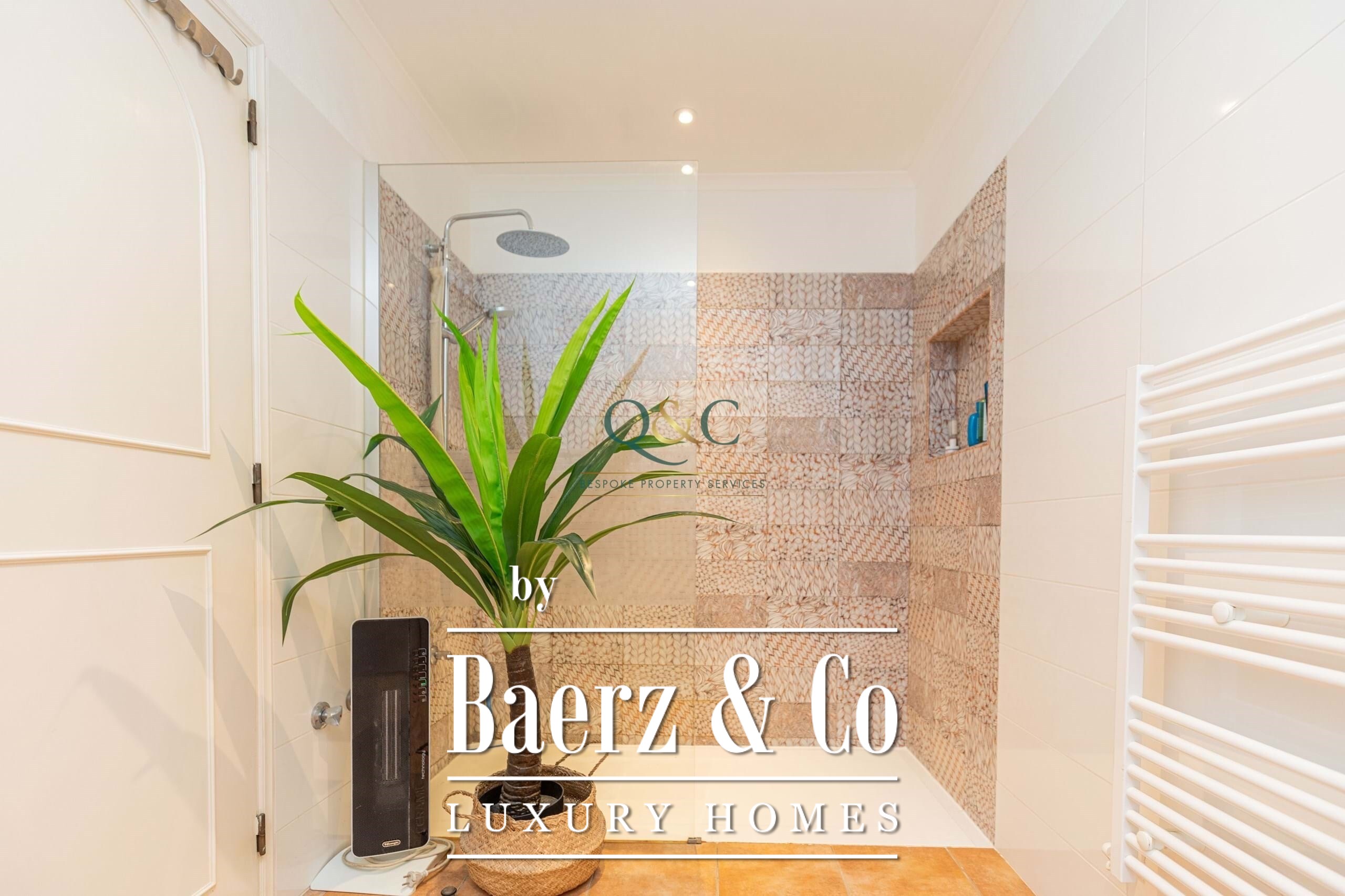De hoofdwoning omvat 292 m² verdeeld over twee verdiepingen, waarbij traditioneel karakter is gecombineerd met verfijnde, hedendaagse updates. De royale living met open haard en panoramisch uitzicht sluit naadloos aan op de volledig uitgeruste keuken en loopt door naar een overdekt terras. Deze buitenruimte, ideaal bij zonsopkomst en zonsondergang, kijkt uit op fraai aangelegde tuinen met droogteresistente beplanting en een sereen zwembadgedeelte onder volwassen bomen.