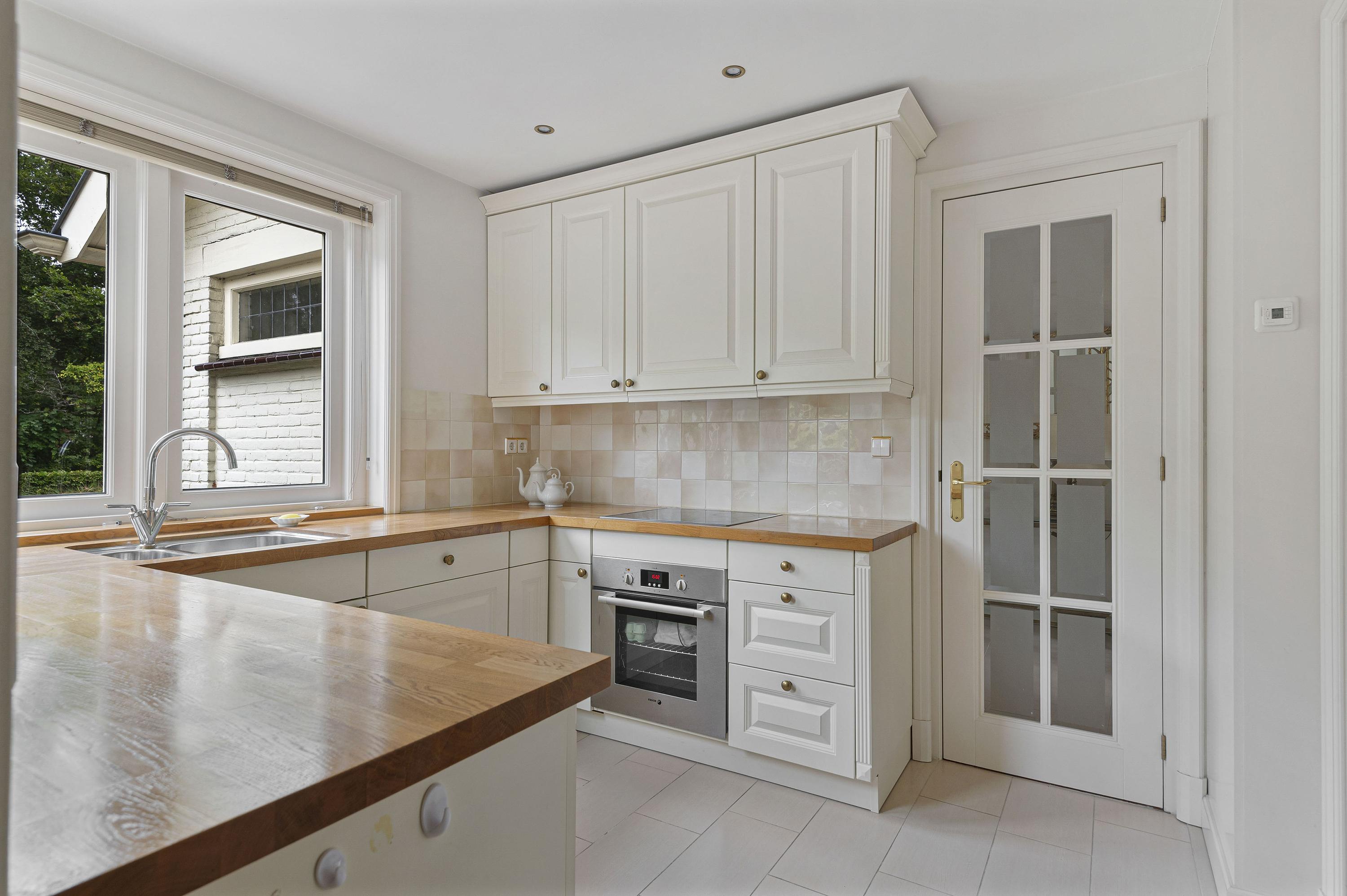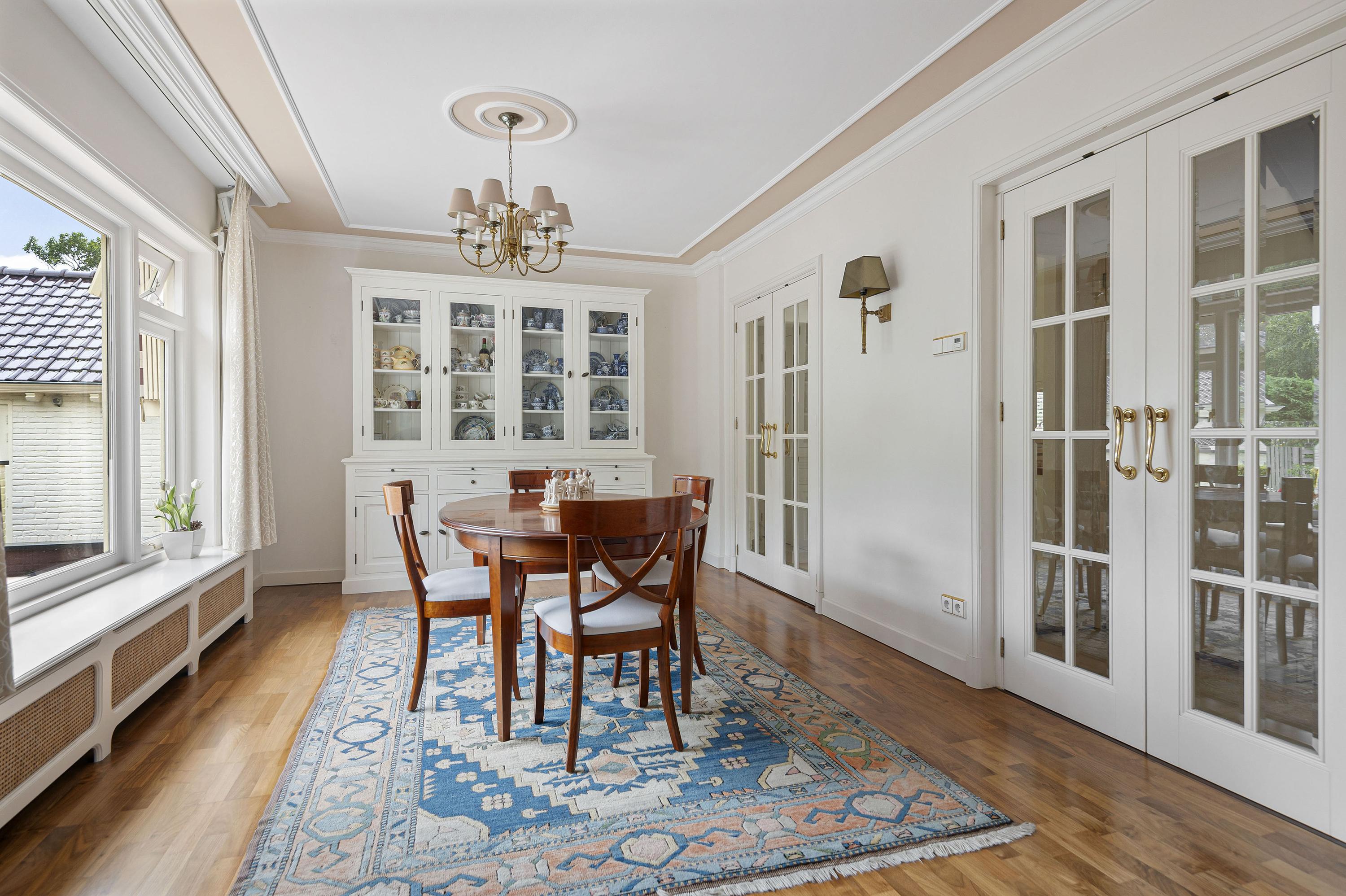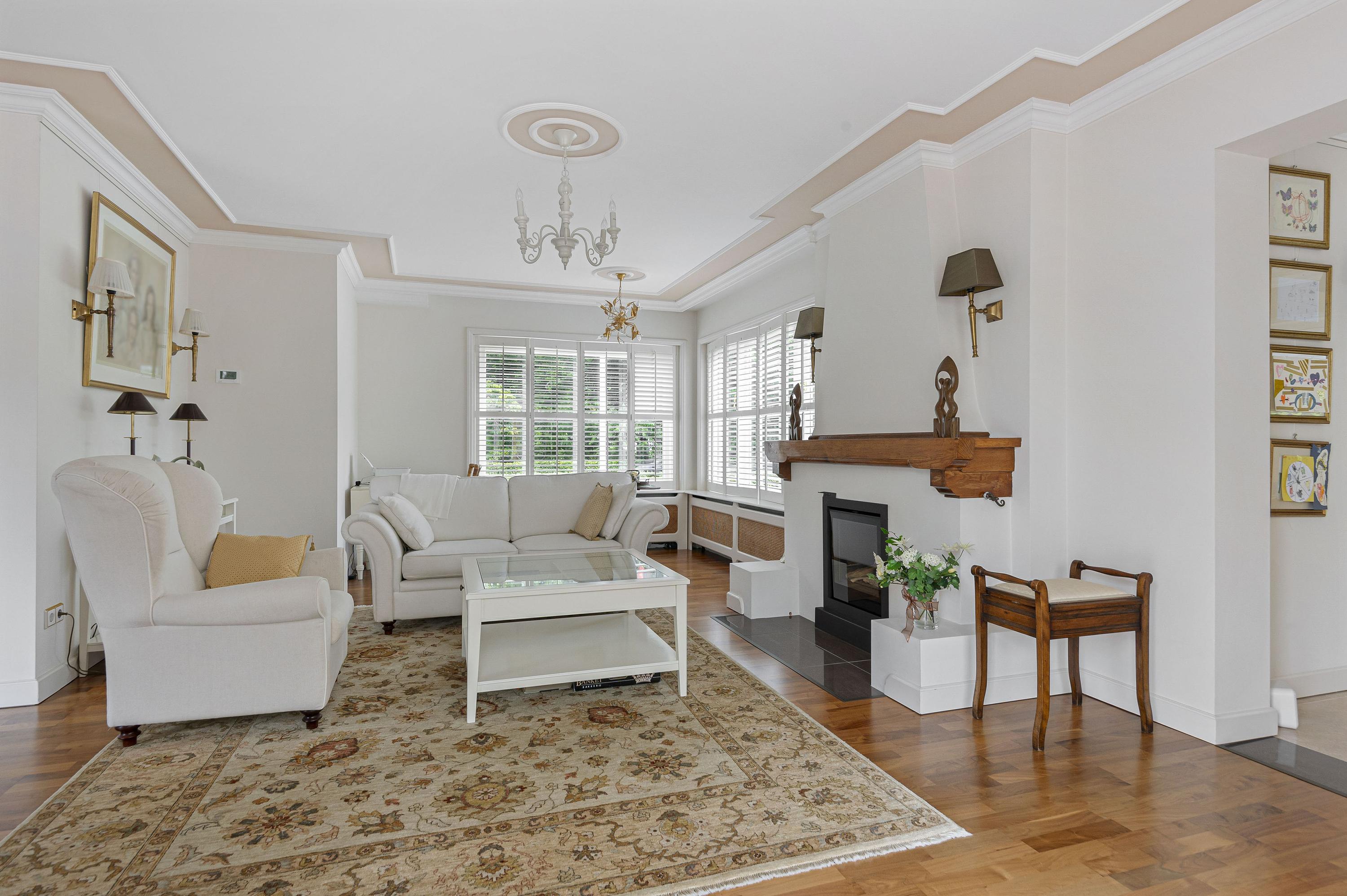 Entree in zeer ruime hal, sfeervolle glas in lood ramen, toilet en verdiepte garderobe. De woonkamer is opgesteld in L-vorm, heeft veel lichtinval, sfeervolle gashaard en is voorzien van een houten parketvloer. De serre en tweede woonkamer zijn later aangebouwd waardoor er veel extra ruimte is gecreëerd welke meerdere mogelijkheden geven. De serre en tweede woonkamer zijn voorzien van een nette tegelvloer met vloerverwarming. De keuken is gelegen aan de voorzijde van de woning welke tevens toegang biedt tot de ruime bijkeuken.