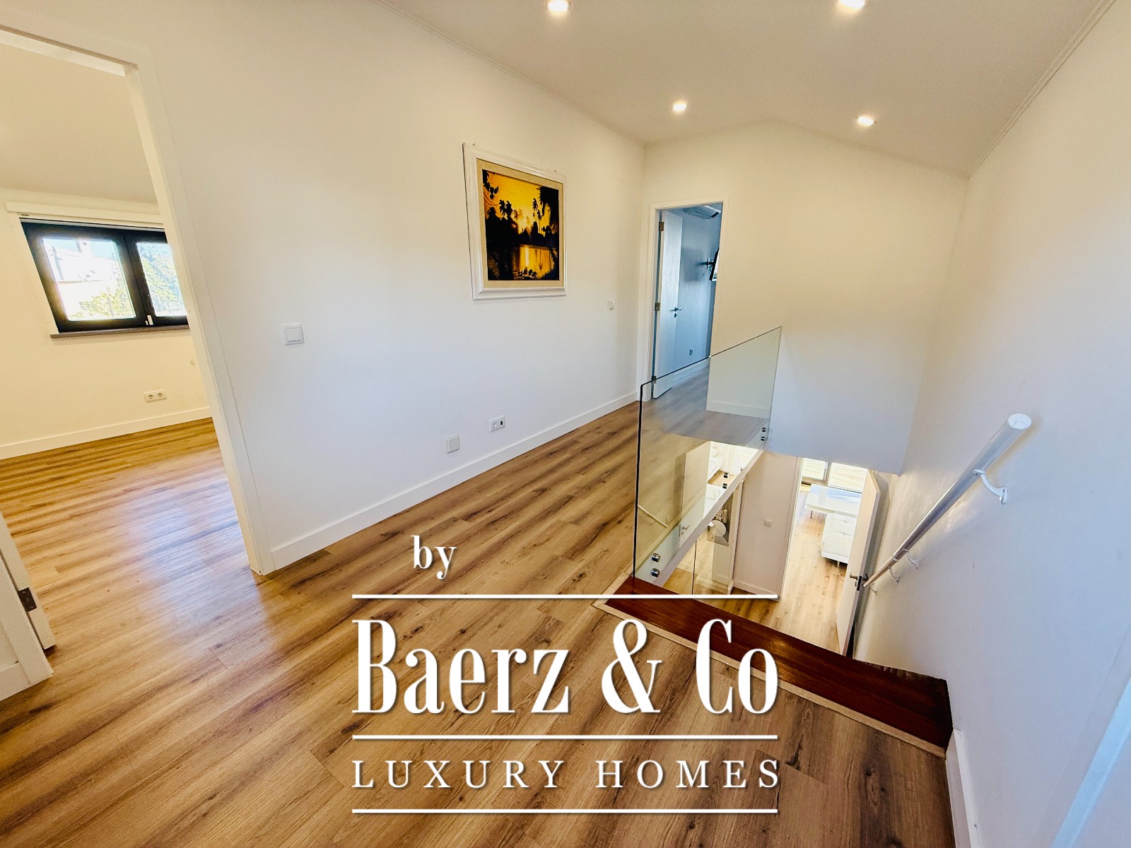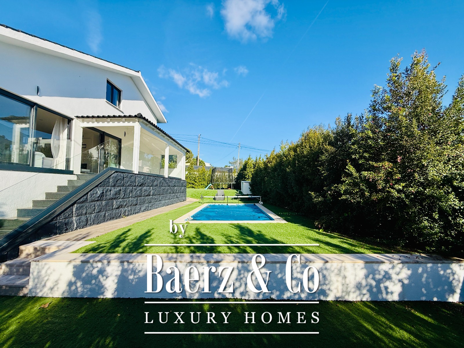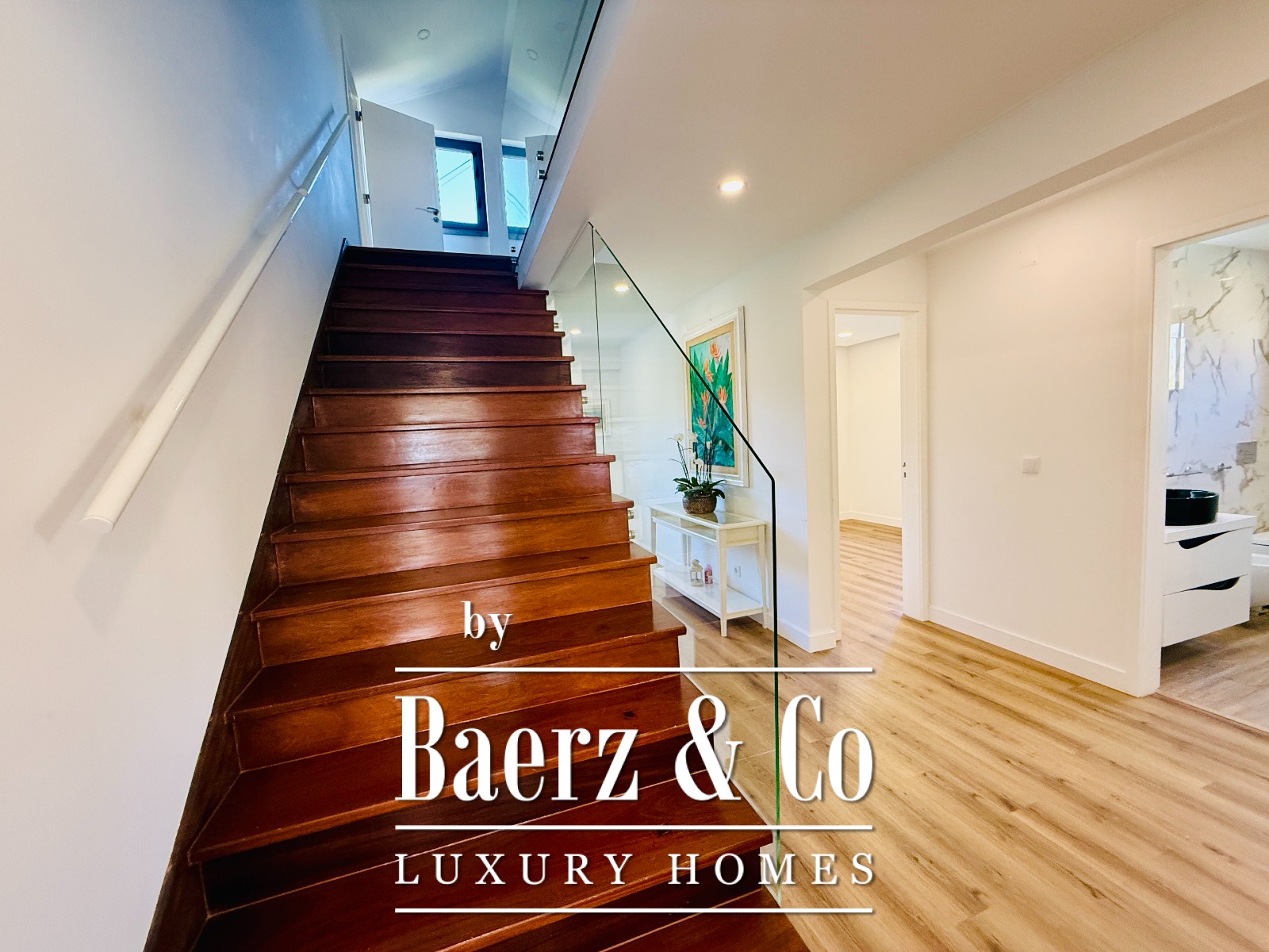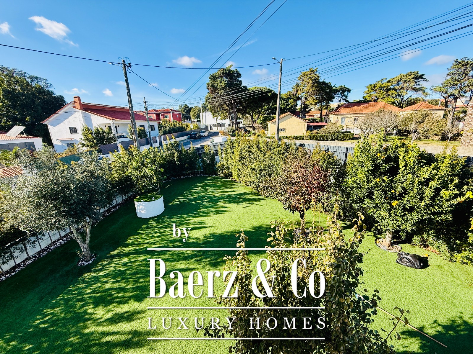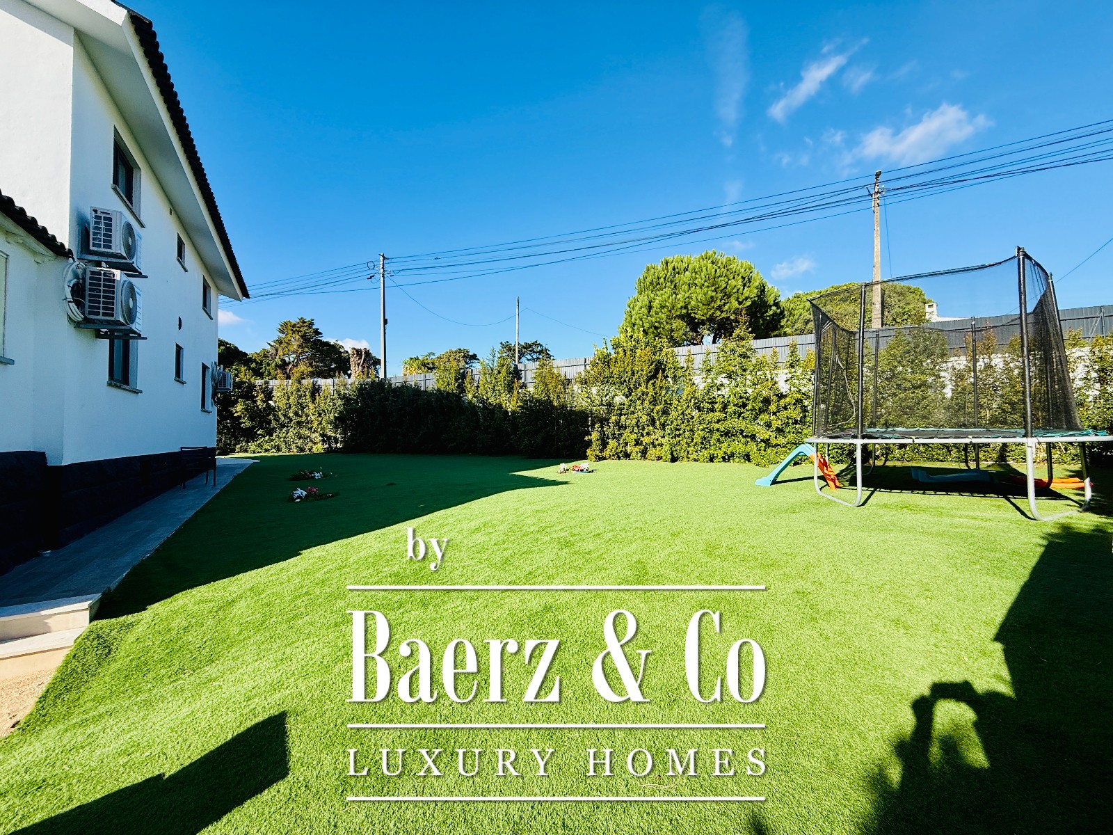 Deze woning in Sintra combineert een eigentijdse renovatie met een gevoel van privacy en rust, en neemt 357 m² in beslag op een perceel van 868 m². Natuurlijk licht stroomt van oost naar west door de drie verdiepingen, die elk zorgvuldig zijn ingedeeld voor zowel gezinsleven als teruggetrokkenheid. De begane grond biedt een logeerkamer, een extra slaapkamer, een berging met raam, een wasruimte en een inpandige garage voor één auto. Op de eerste verdieping ondersteunt een open keuken in Amerikaanse stijl met dubbele koelkast het dagelijkse ritme én gezellige ontmoetingen. De aangrenzende woon- en eetkamer met open haard biedt toegang tot het terras, dat direct doorloopt naar het verwarmde zwembad en de tuin. Op deze verdieping zijn er twee slaapkamers met inbouwkasten en een fraai afgewerkte badkamer. De bovenste etage herbergt een hoofdsuite met inloopkast en eigen badkamer, een tweede suite met kasten, en een extra kamer voor flexibele invulling. In het hele huis zorgt airconditioning voor comfort in elk seizoen, terwijl de leefruimtes rustig zijn gelegen aan een rustige straat. De Tasis School ligt op tien minuten, de Caisl School op twaalf minuten, en het centrum van Lissabon bevindt zich binnen vijfentwintig kilometer, waarmee wonen in Sintra perfect wordt verbonden met de hoofdstad. Deze woning te koop in Sintra verenigt verfijnde functionaliteit met ingetogen elegantie.