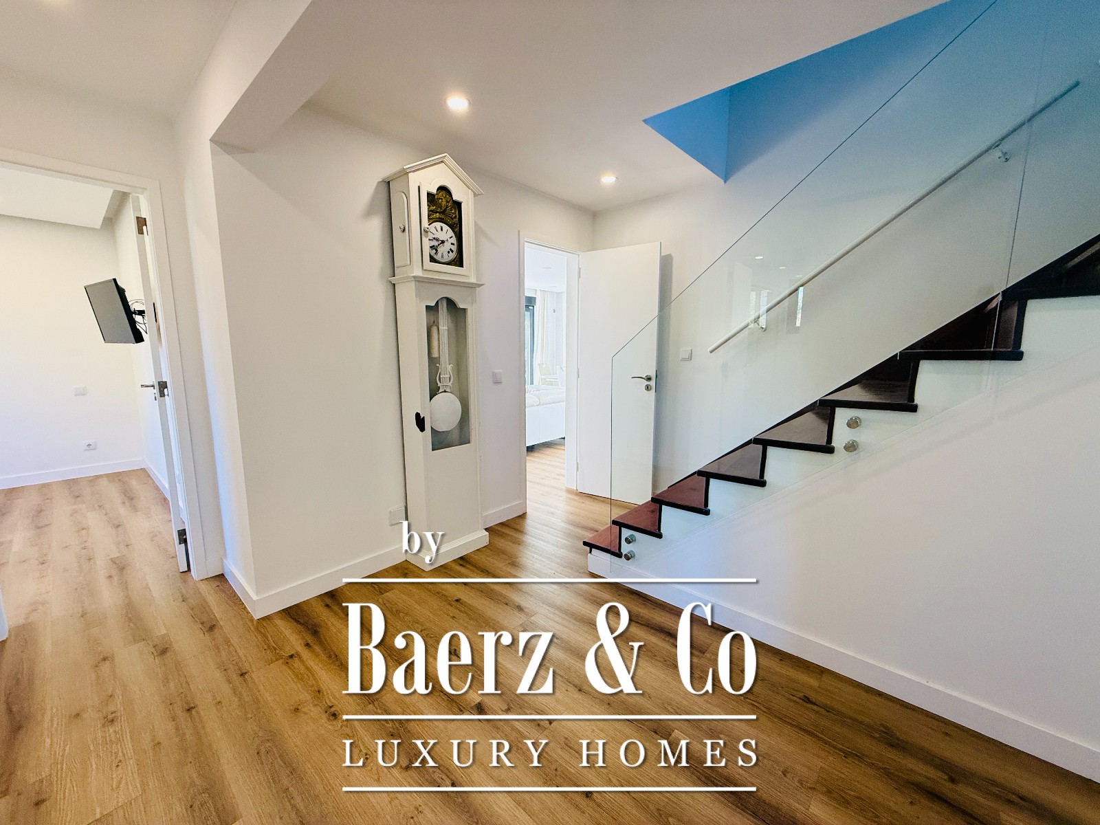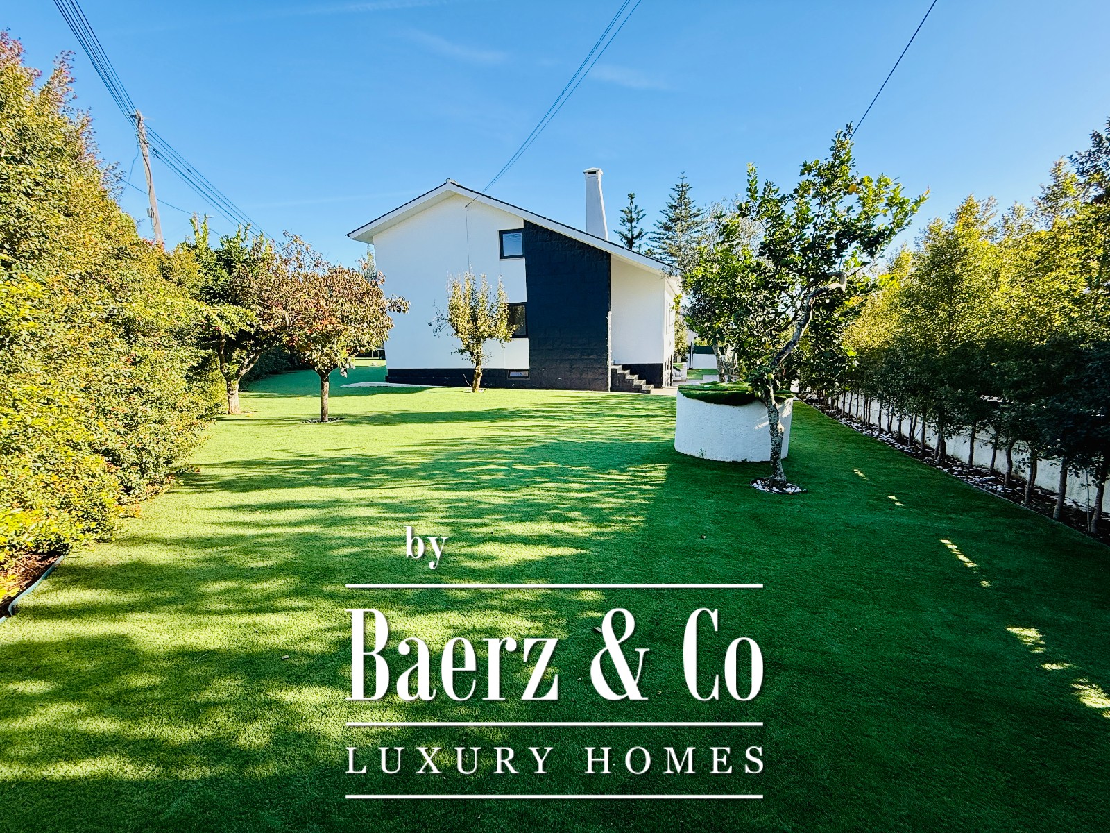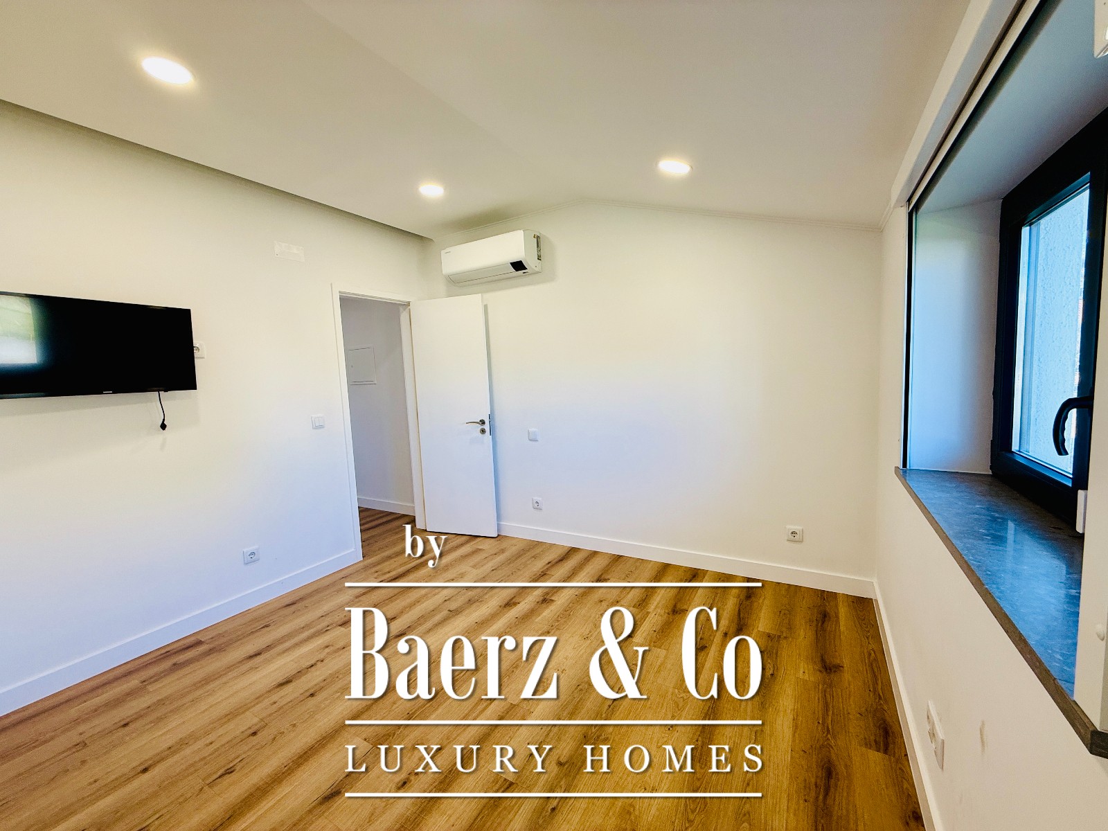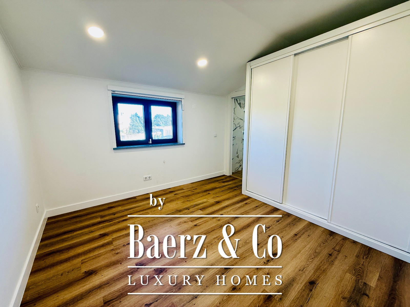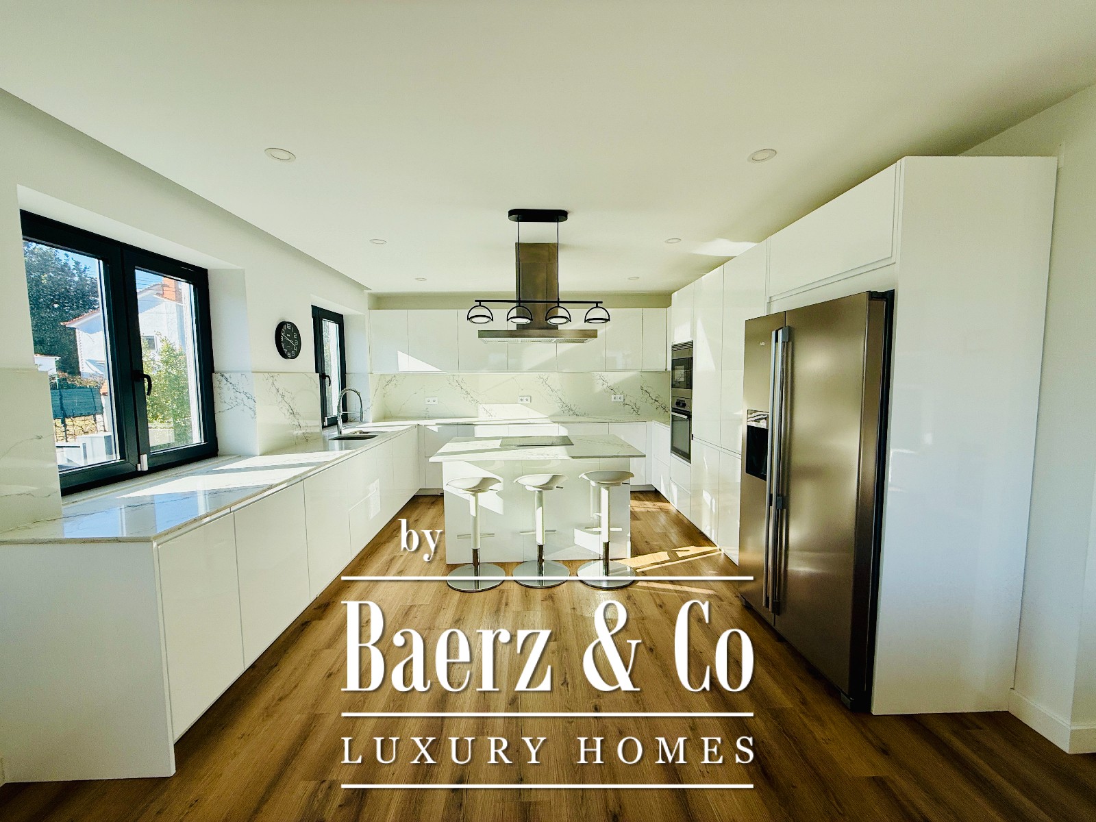 Deze woning in Sintra combineert een eigentijdse renovatie met een gevoel van privacy en rust, en neemt 357 m² in beslag op een perceel van 868 m². Natuurlijk licht stroomt van oost naar west door de drie verdiepingen, die elk zorgvuldig zijn ingedeeld voor zowel gezinsleven als teruggetrokkenheid. De begane grond biedt een logeerkamer, een extra slaapkamer, een berging met raam, een wasruimte en een inpandige garage voor één auto. Op de eerste verdieping ondersteunt een open keuken in Amerikaanse stijl met dubbele koelkast het dagelijkse ritme én gezellige ontmoetingen. De aangrenzende woon- en eetkamer met open haard biedt toegang tot het terras, dat direct doorloopt naar het verwarmde zwembad en de tuin. Op deze verdieping zijn er twee slaapkamers met inbouwkasten en een fraai afgewerkte badkamer. De bovenste etage herbergt een hoofdsuite met inloopkast en eigen badkamer, een tweede suite met kasten, en een extra kamer voor flexibele invulling. In het hele huis zorgt airconditioning voor comfort in elk seizoen, terwijl de leefruimtes rustig zijn gelegen aan een rustige straat. De Tasis School ligt op tien minuten, de Caisl School op twaalf minuten, en het centrum van Lissabon bevindt zich binnen vijfentwintig kilometer, waarmee wonen in Sintra perfect wordt verbonden met de hoofdstad. Deze woning te koop in Sintra verenigt verfijnde functionaliteit met ingetogen elegantie.