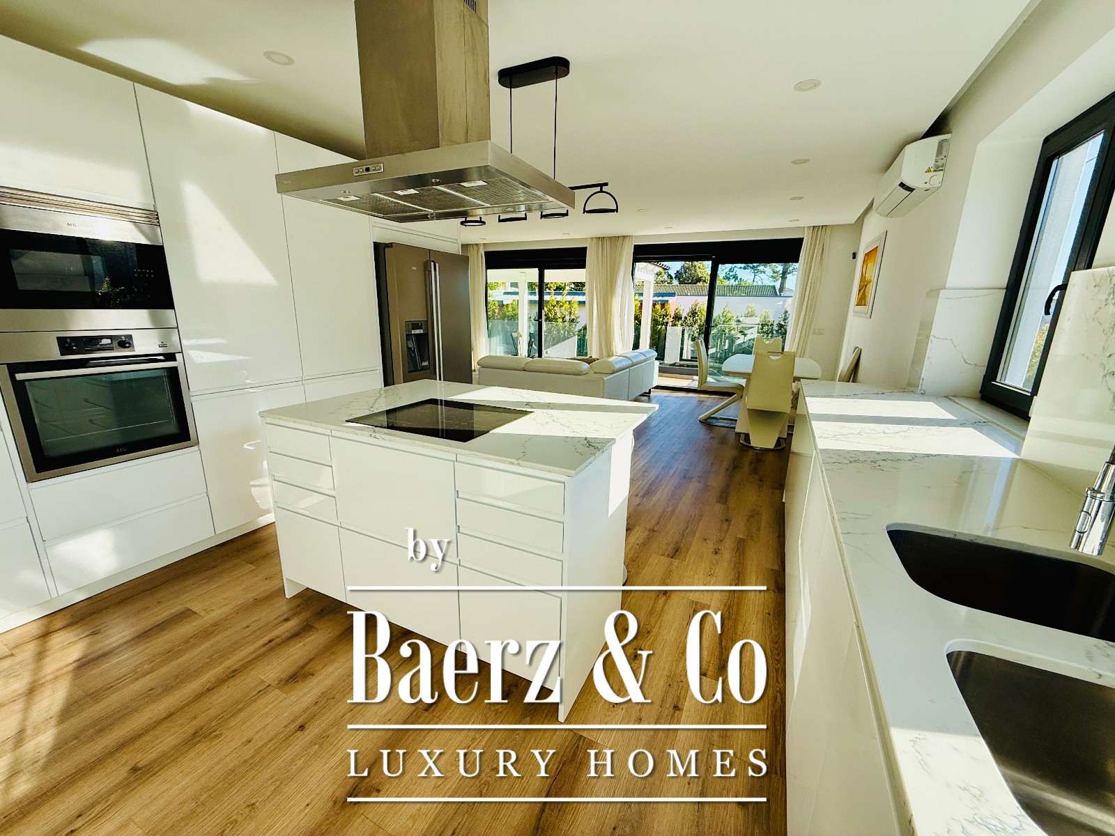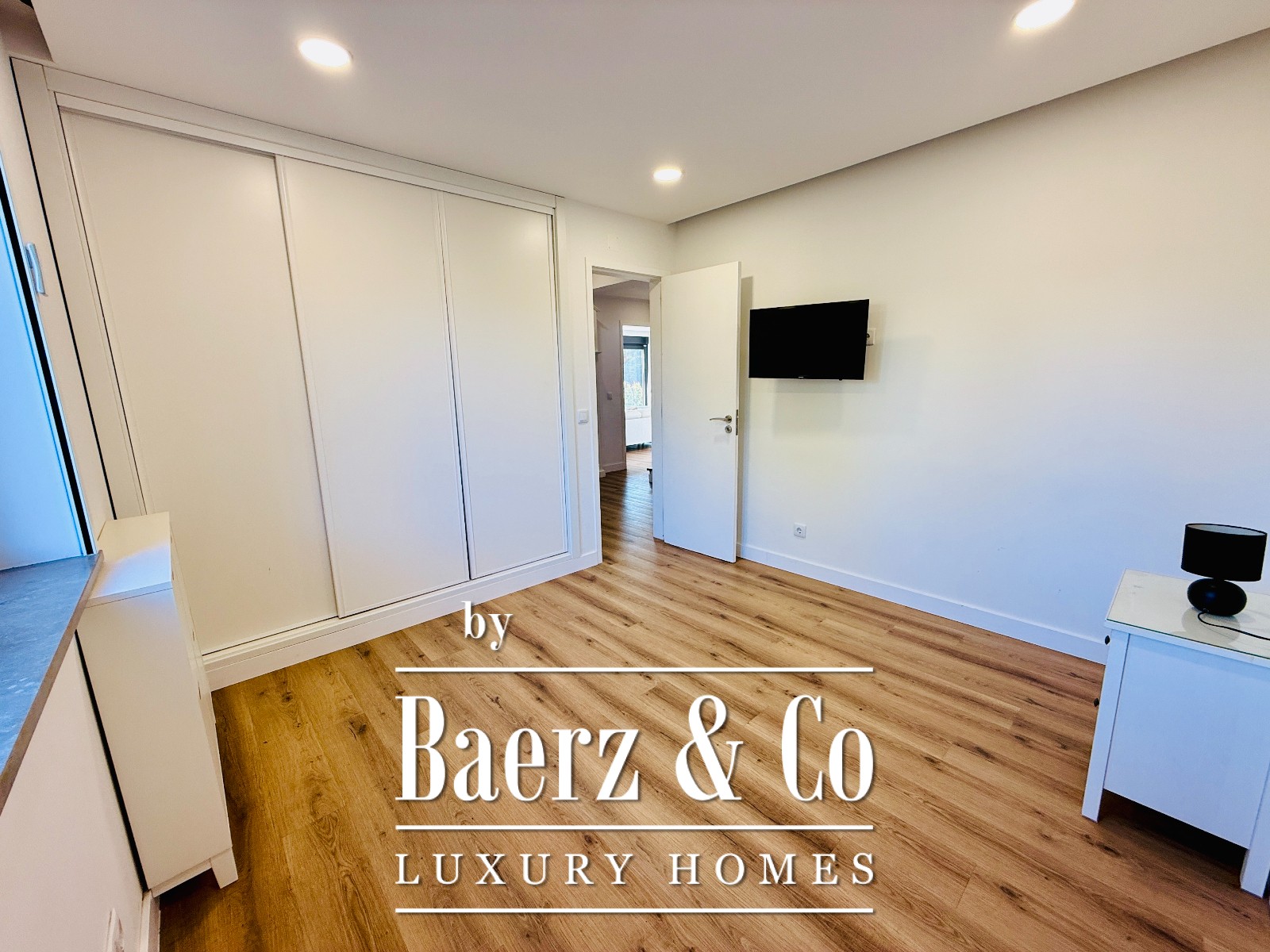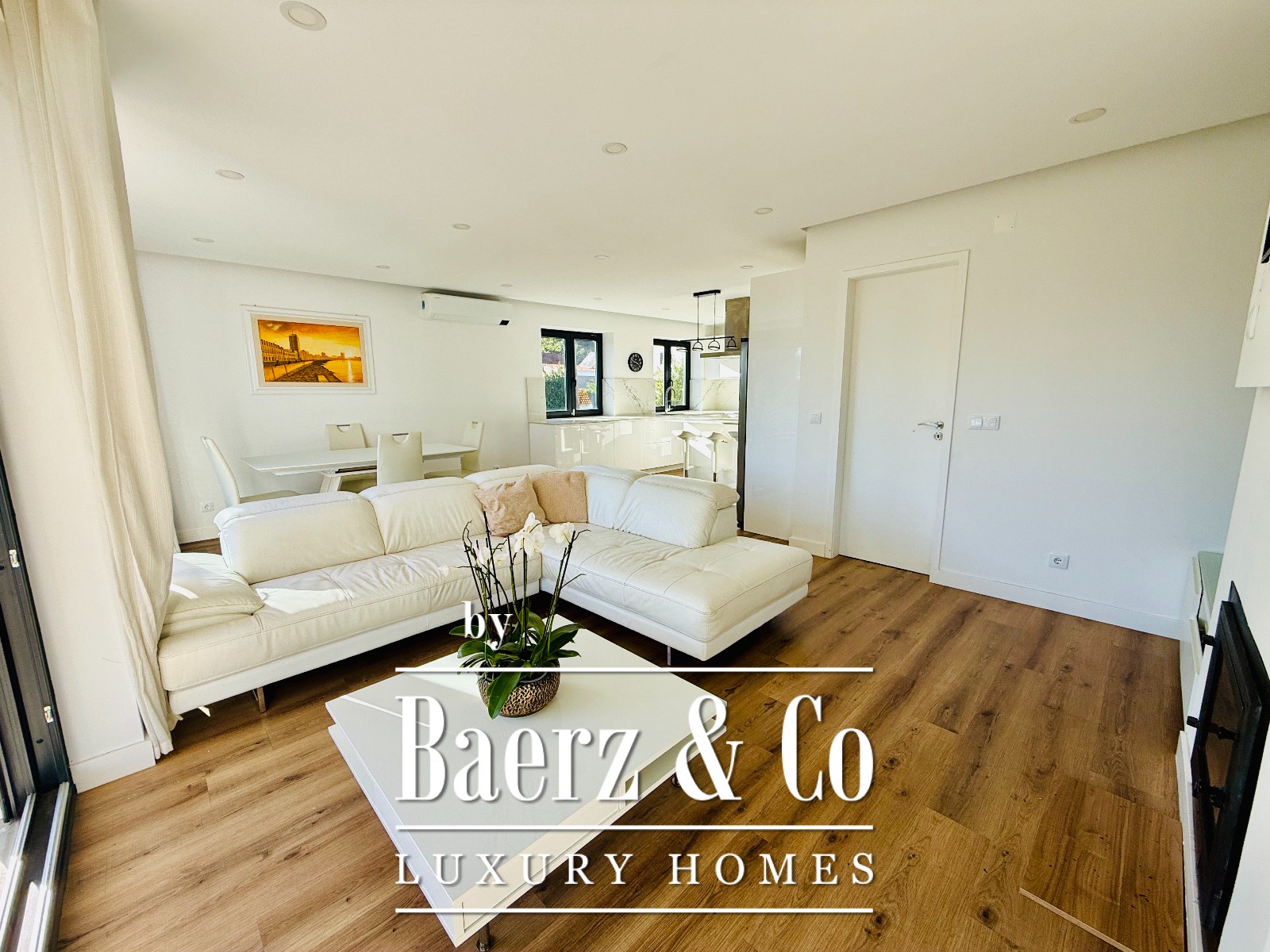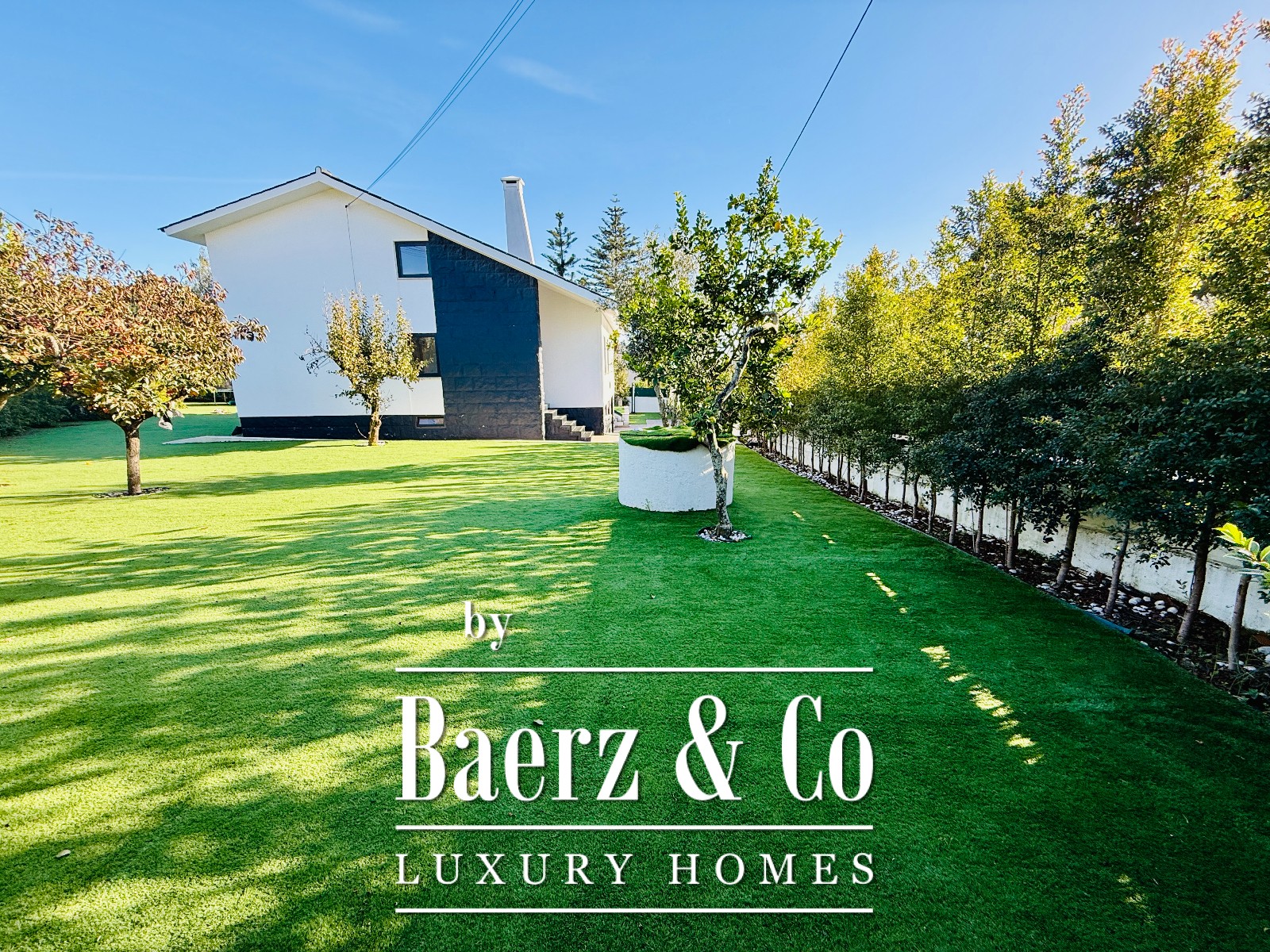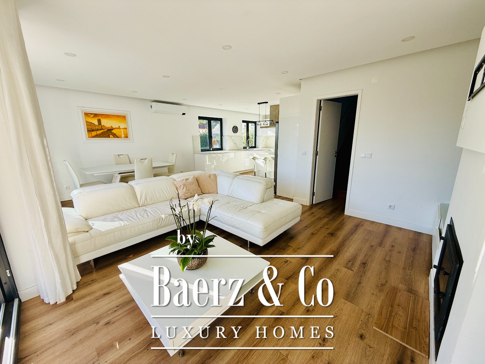 Deze woning in Sintra combineert een eigentijdse renovatie met een gevoel van privacy en rust, en neemt 357 m² in beslag op een perceel van 868 m². Natuurlijk licht stroomt van oost naar west door de drie verdiepingen, die elk zorgvuldig zijn ingedeeld voor zowel gezinsleven als teruggetrokkenheid. De begane grond biedt een logeerkamer, een extra slaapkamer, een berging met raam, een wasruimte en een inpandige garage voor één auto. Op de eerste verdieping ondersteunt een open keuken in Amerikaanse stijl met dubbele koelkast het dagelijkse ritme én gezellige ontmoetingen. De aangrenzende woon- en eetkamer met open haard biedt toegang tot het terras, dat direct doorloopt naar het verwarmde zwembad en de tuin. Op deze verdieping zijn er twee slaapkamers met inbouwkasten en een fraai afgewerkte badkamer. De bovenste etage herbergt een hoofdsuite met inloopkast en eigen badkamer, een tweede suite met kasten, en een extra kamer voor flexibele invulling. In het hele huis zorgt airconditioning voor comfort in elk seizoen, terwijl de leefruimtes rustig zijn gelegen aan een rustige straat. De Tasis School ligt op tien minuten, de Caisl School op twaalf minuten, en het centrum van Lissabon bevindt zich binnen vijfentwintig kilometer, waarmee wonen in Sintra perfect wordt verbonden met de hoofdstad. Deze woning te koop in Sintra verenigt verfijnde functionaliteit met ingetogen elegantie.