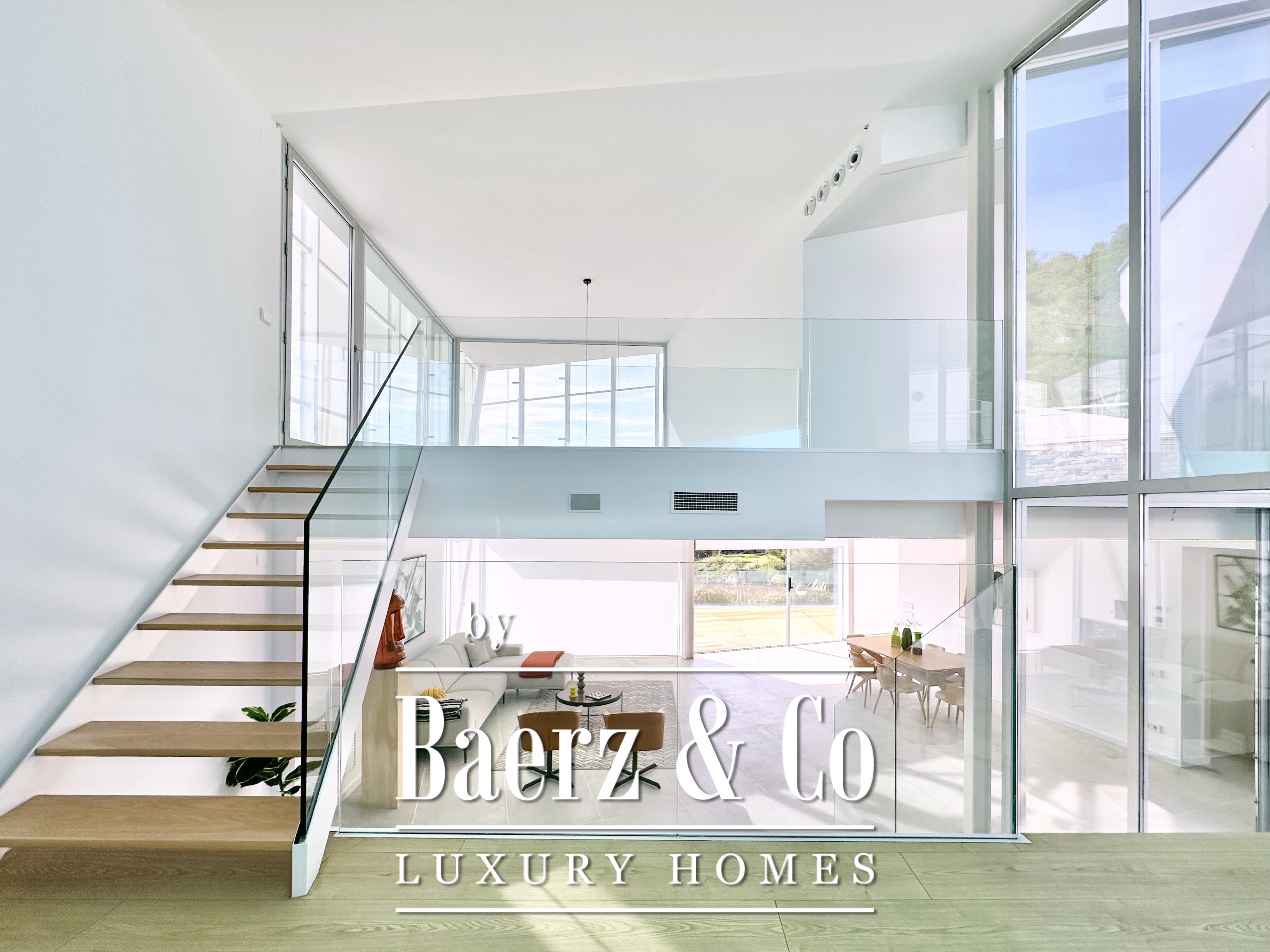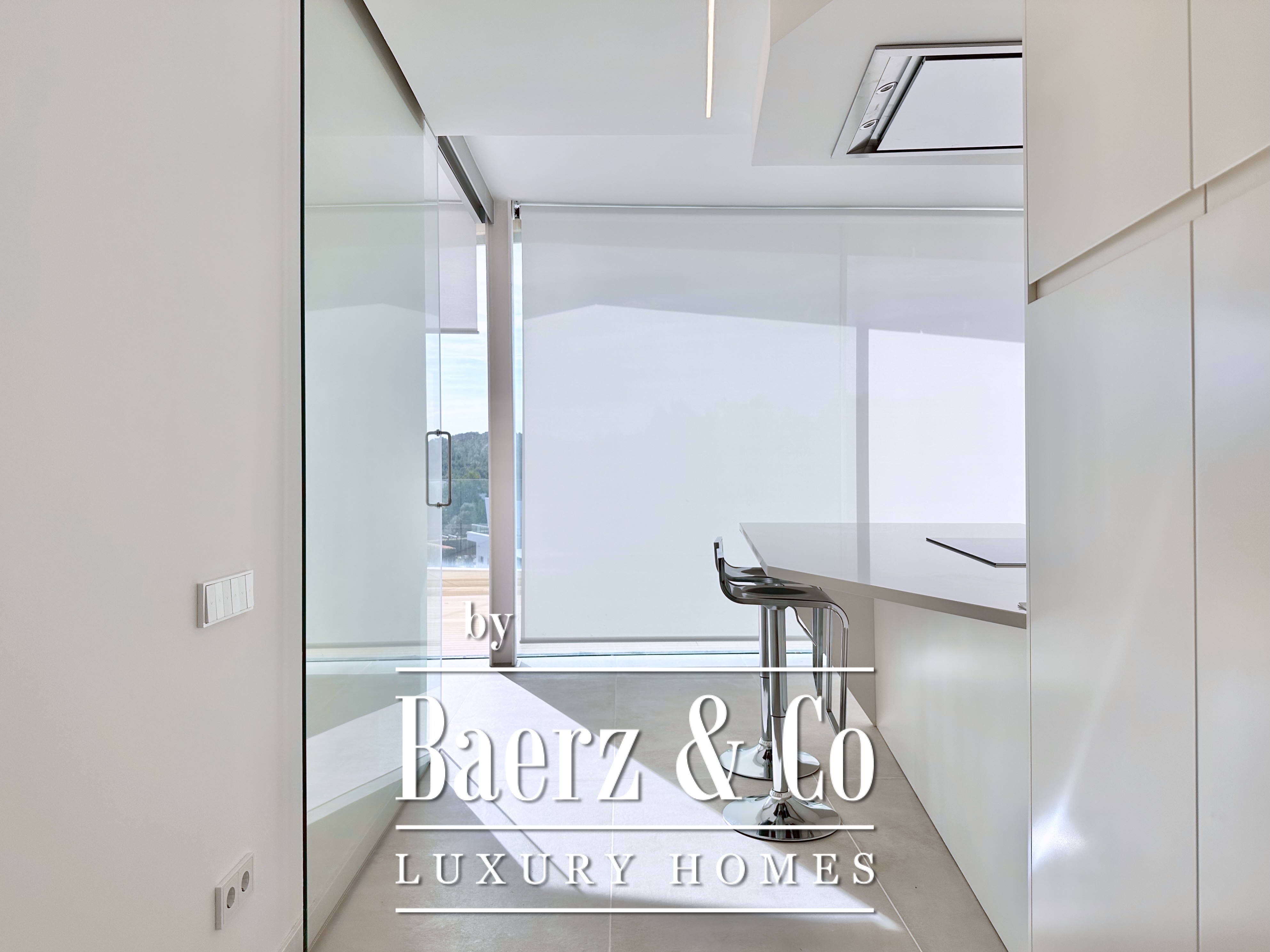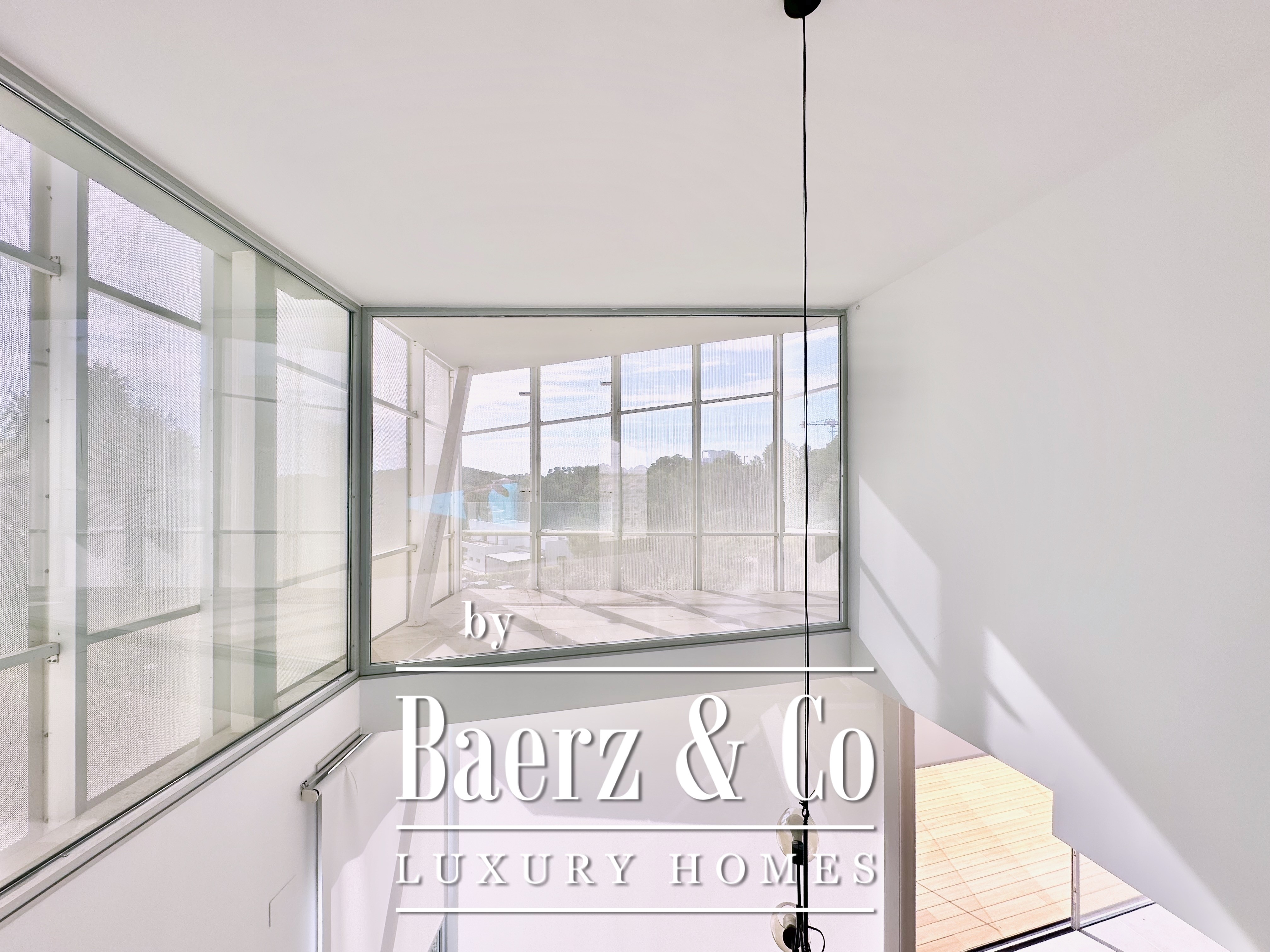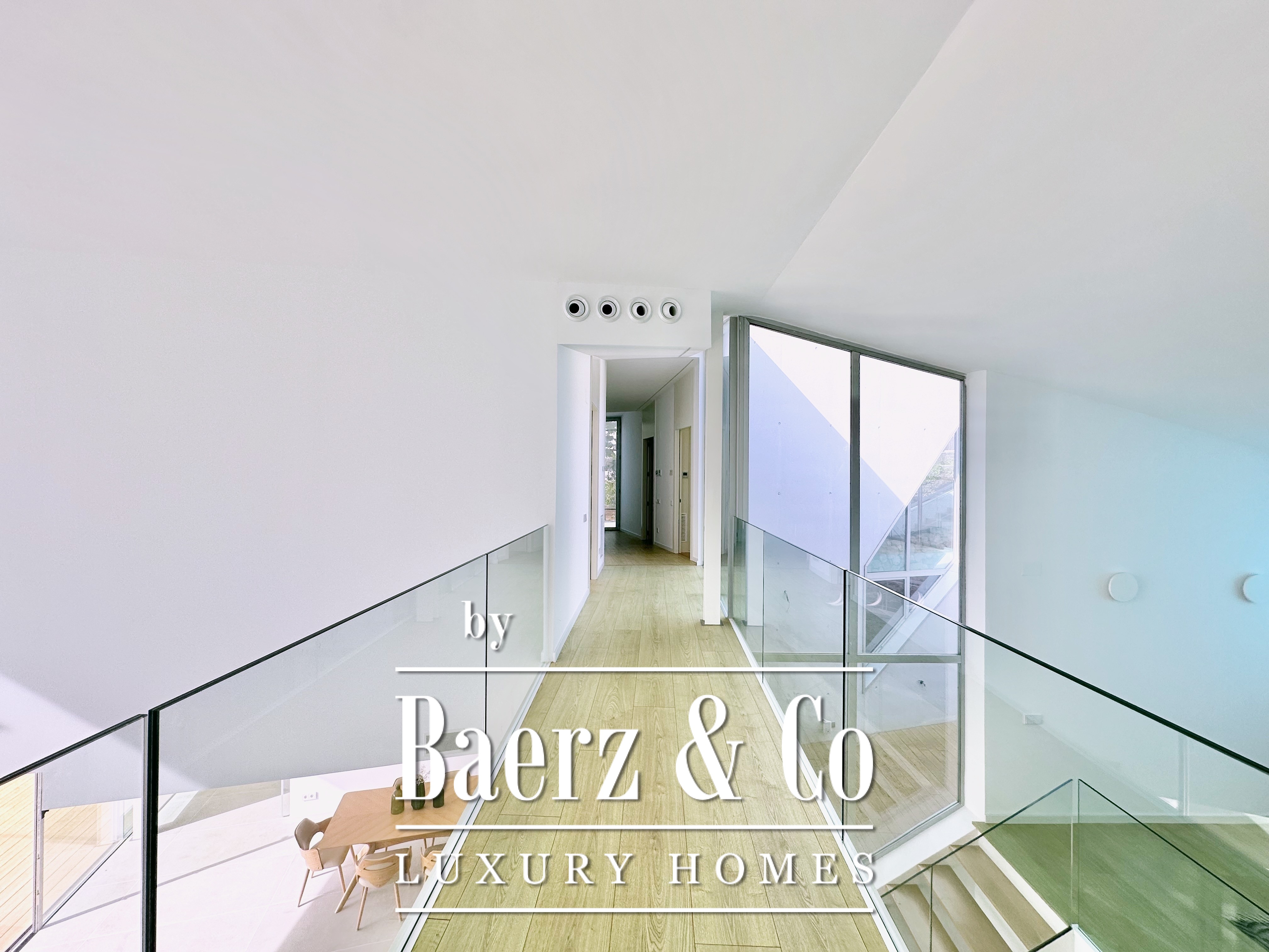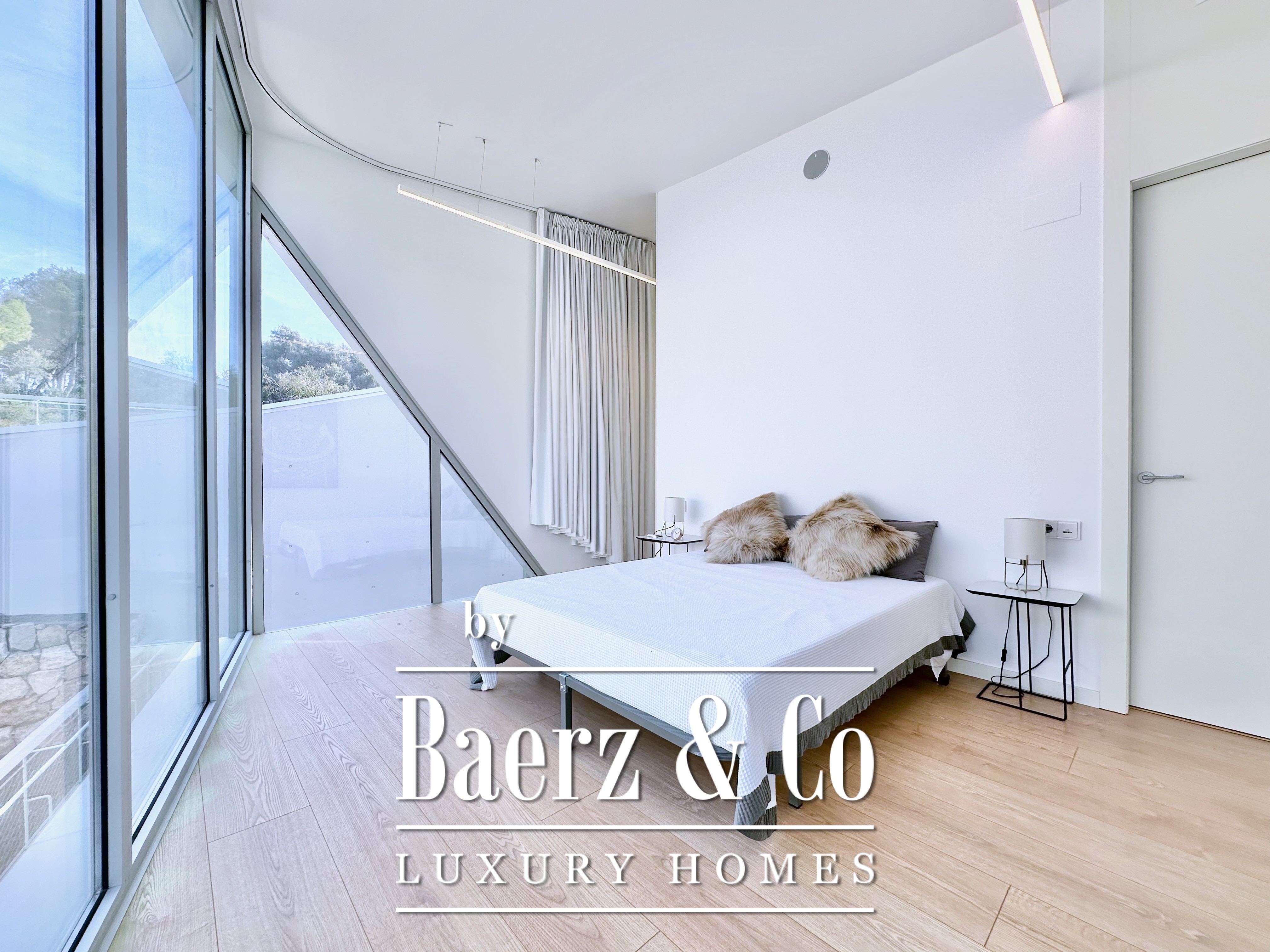 Boven de leefruimte leidt een zwevende loopbrug naar drie tweepersoonsslaapkamers, waarvan twee met eigen badkamer. Elke kamer grenst aan een terras gefilterd door metalen lamellen, wat openheid en privacy in balans brengt. Deze eigentijdse villa te koop in Sitges combineert architectonische precisie met een exclusieve kustbeleving.