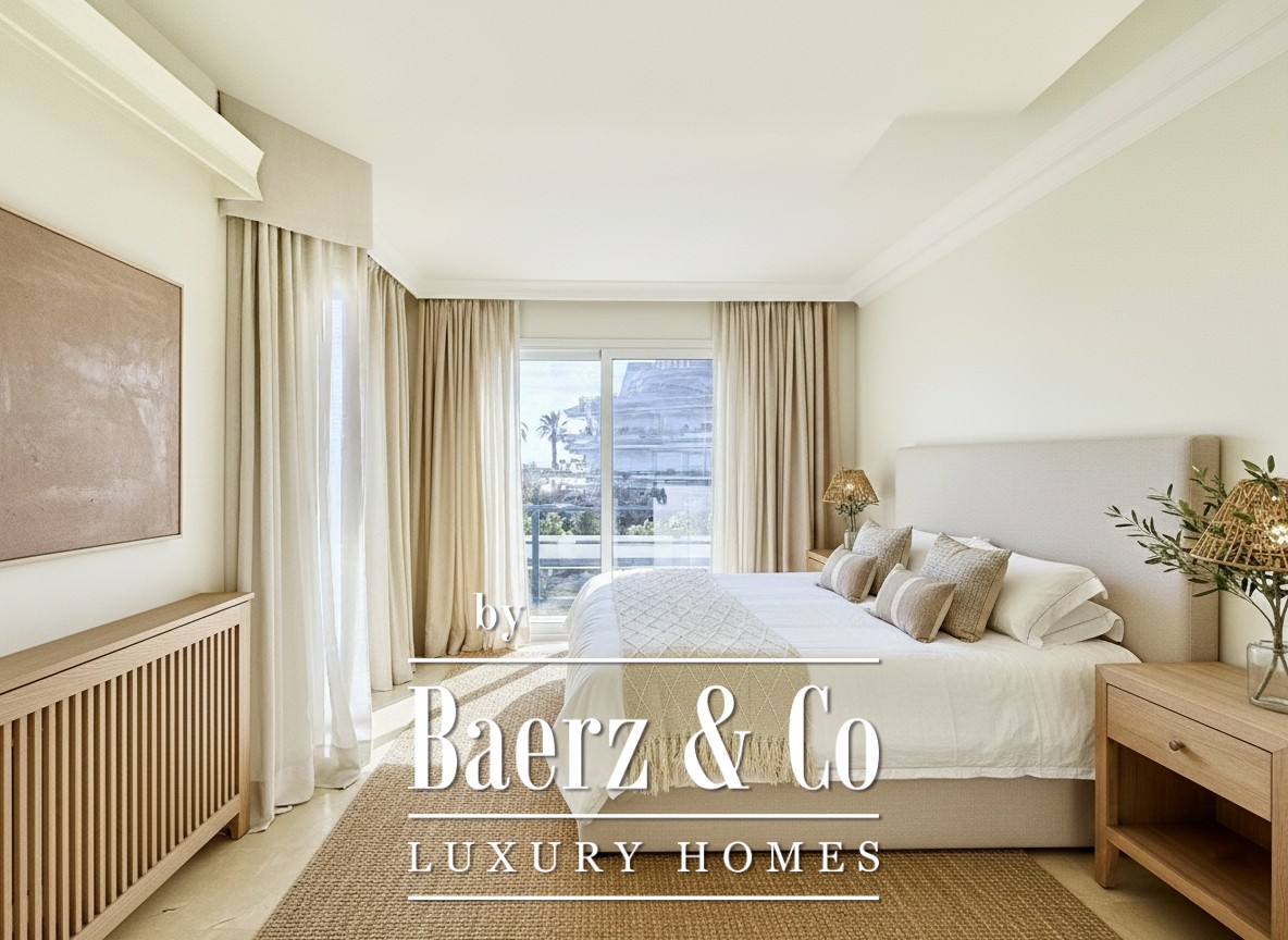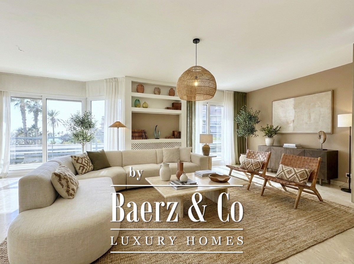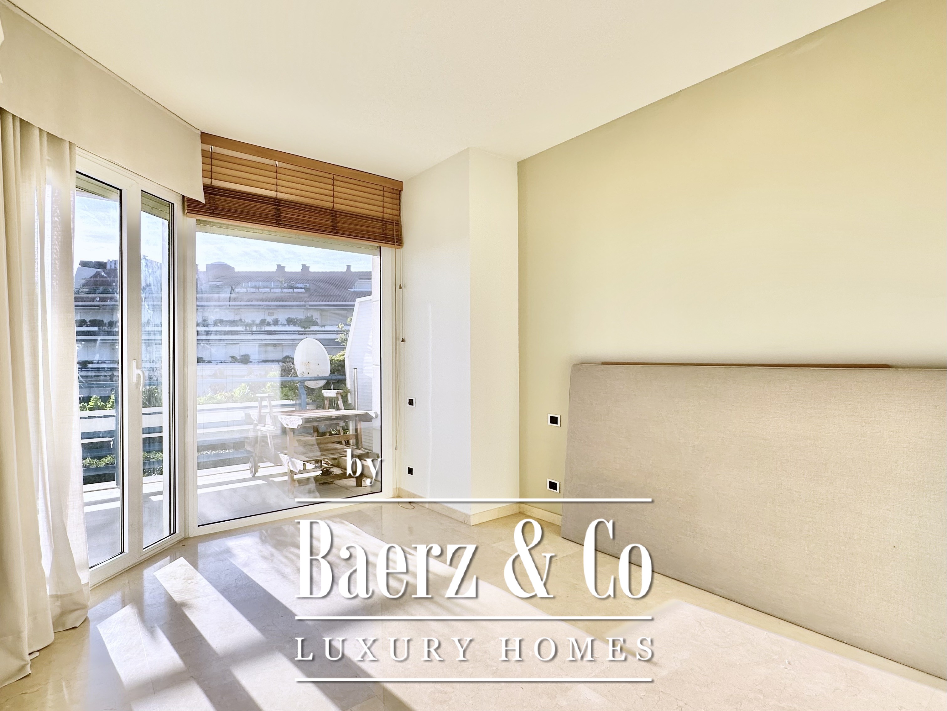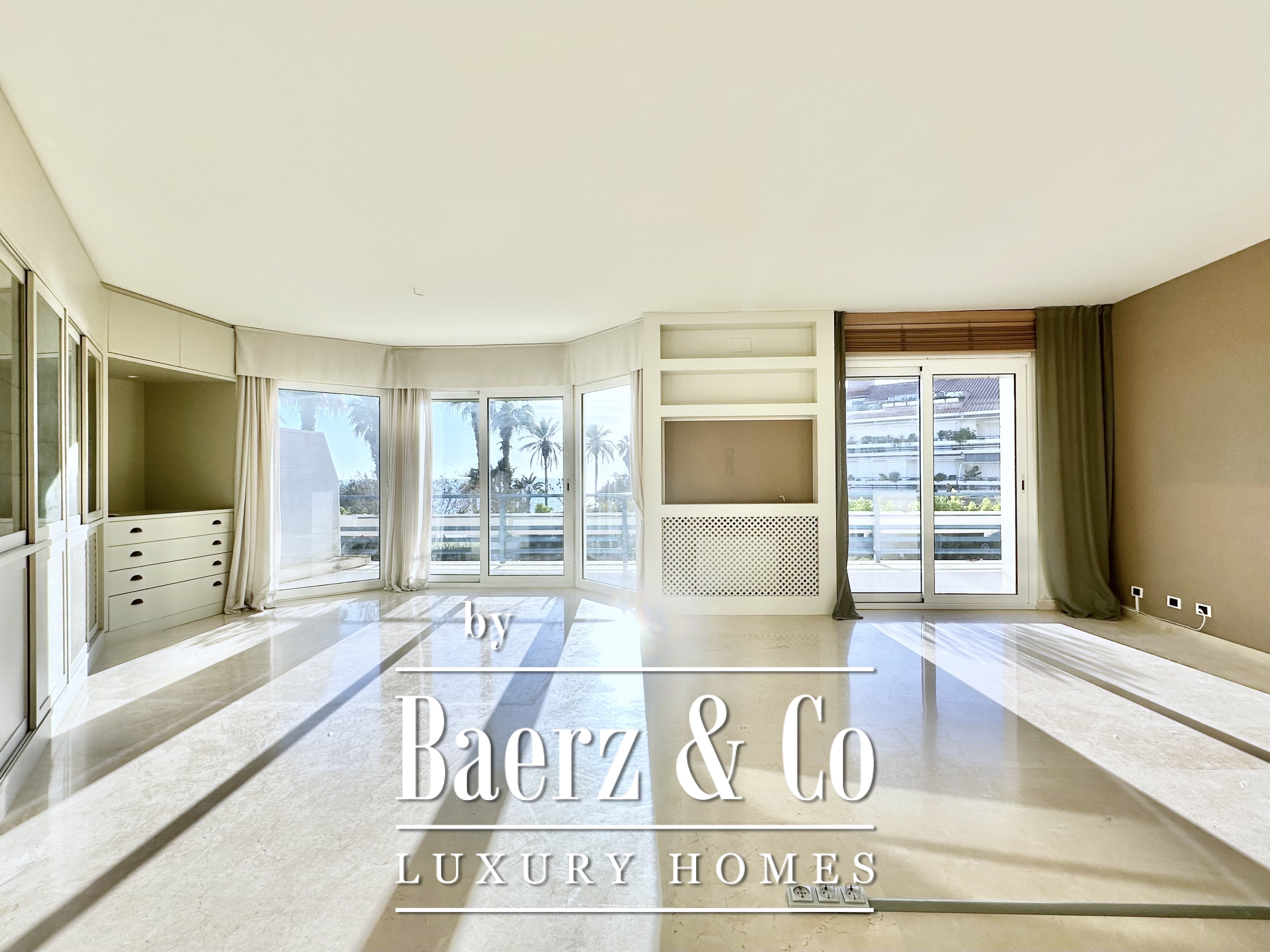 Het appartement is ontworpen en gerenoveerd volgens hoge standaarden en diende ooit als modelwoning van het project. Elke van de vier slaapkamers beschikt over een eigen badkamer, waarbij de master suite direct op zee is gericht. Elegante marmeren afwerkingen versterken het ingetogen interieur en ingebouwde kasten zorgen voor een discrete functionaliteit. Twee terrassen, waarvan één zicht biedt op de levendige zee en de ander uitkijkt over rustige tuinen en het zwembad, nodigen uit tot een leven in harmonie met zowel de zee als het groen.
