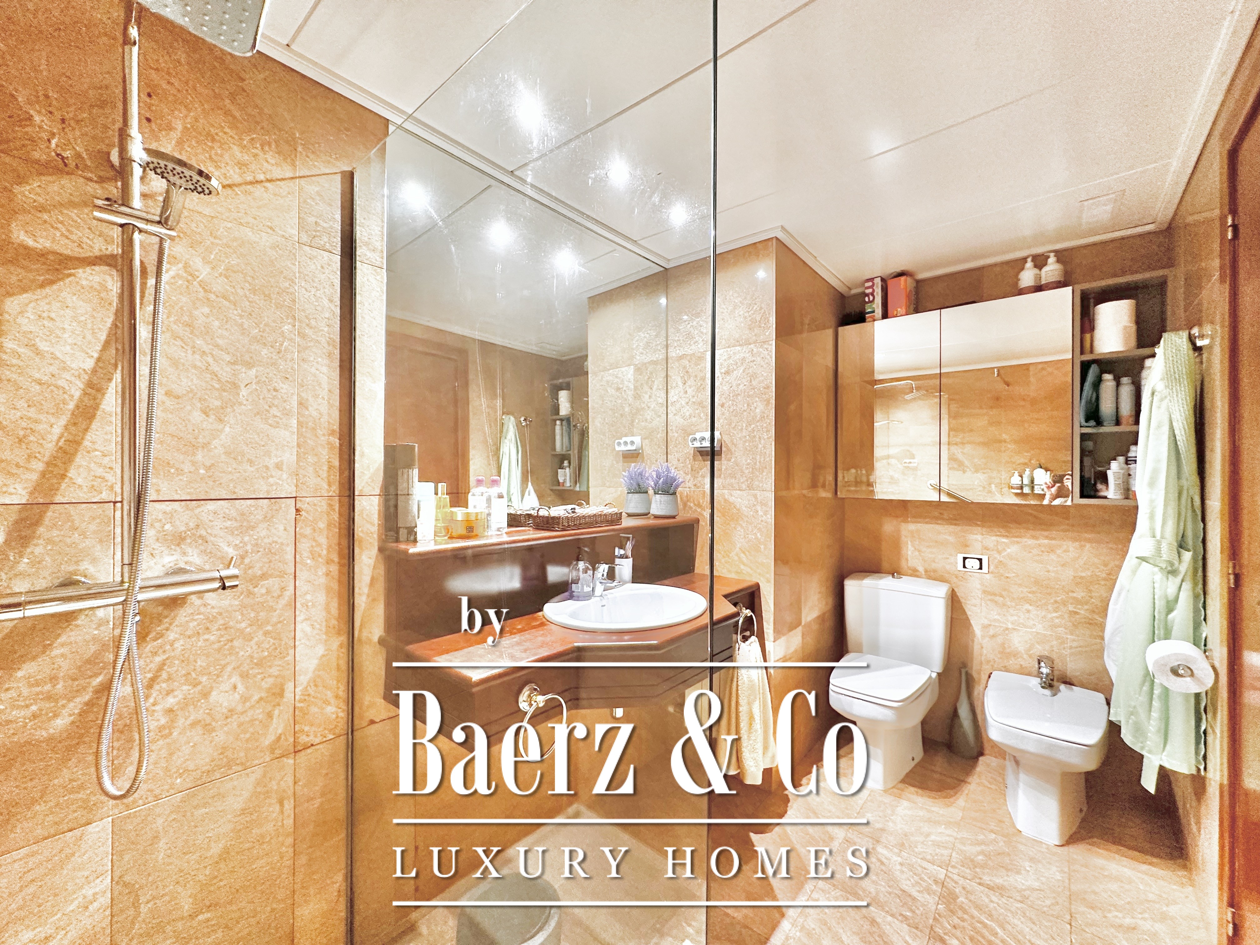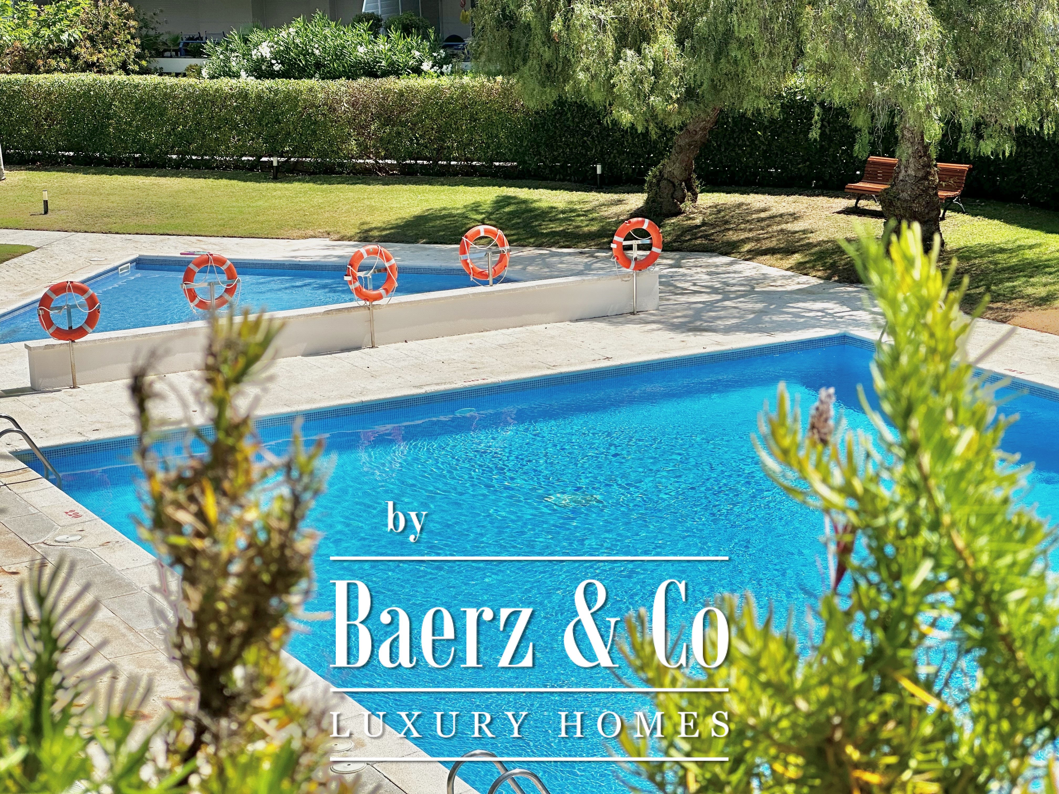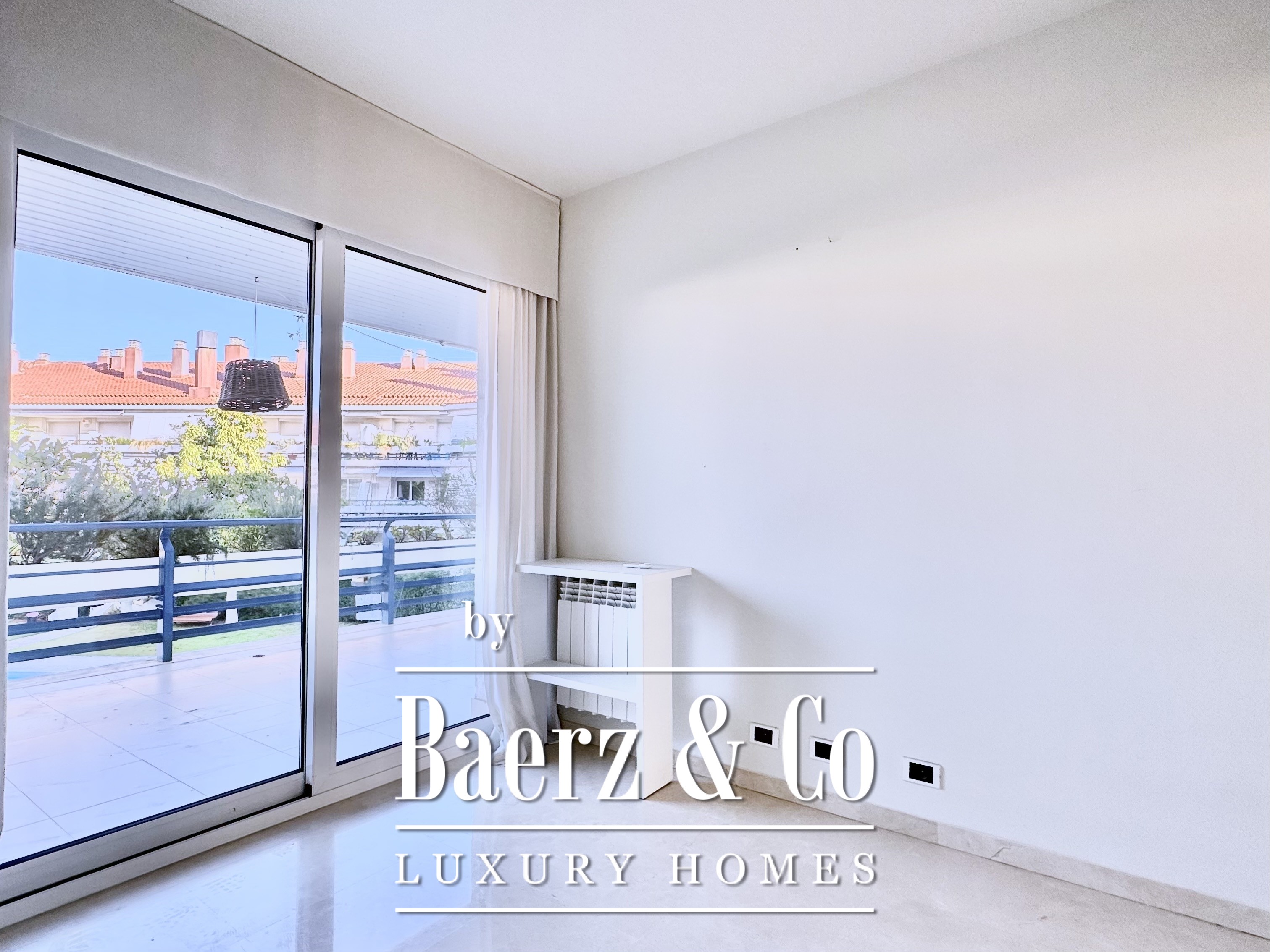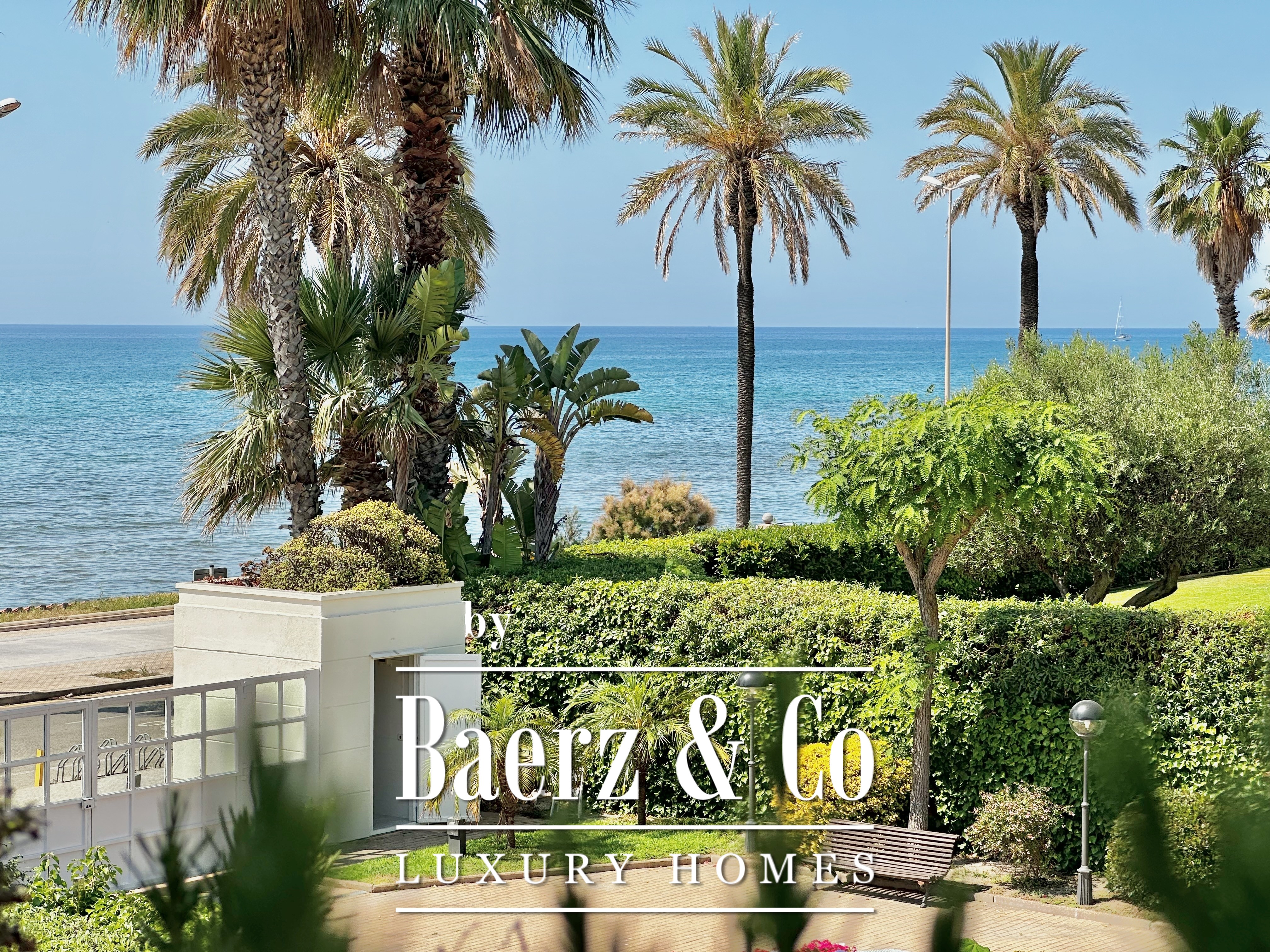 Het appartement is ontworpen en gerenoveerd volgens hoge standaarden en diende ooit als modelwoning van het project. Elke van de vier slaapkamers beschikt over een eigen badkamer, waarbij de master suite direct op zee is gericht. Elegante marmeren afwerkingen versterken het ingetogen interieur en ingebouwde kasten zorgen voor een discrete functionaliteit. Twee terrassen, waarvan één zicht biedt op de levendige zee en de ander uitkijkt over rustige tuinen en het zwembad, nodigen uit tot een leven in harmonie met zowel de zee als het groen.