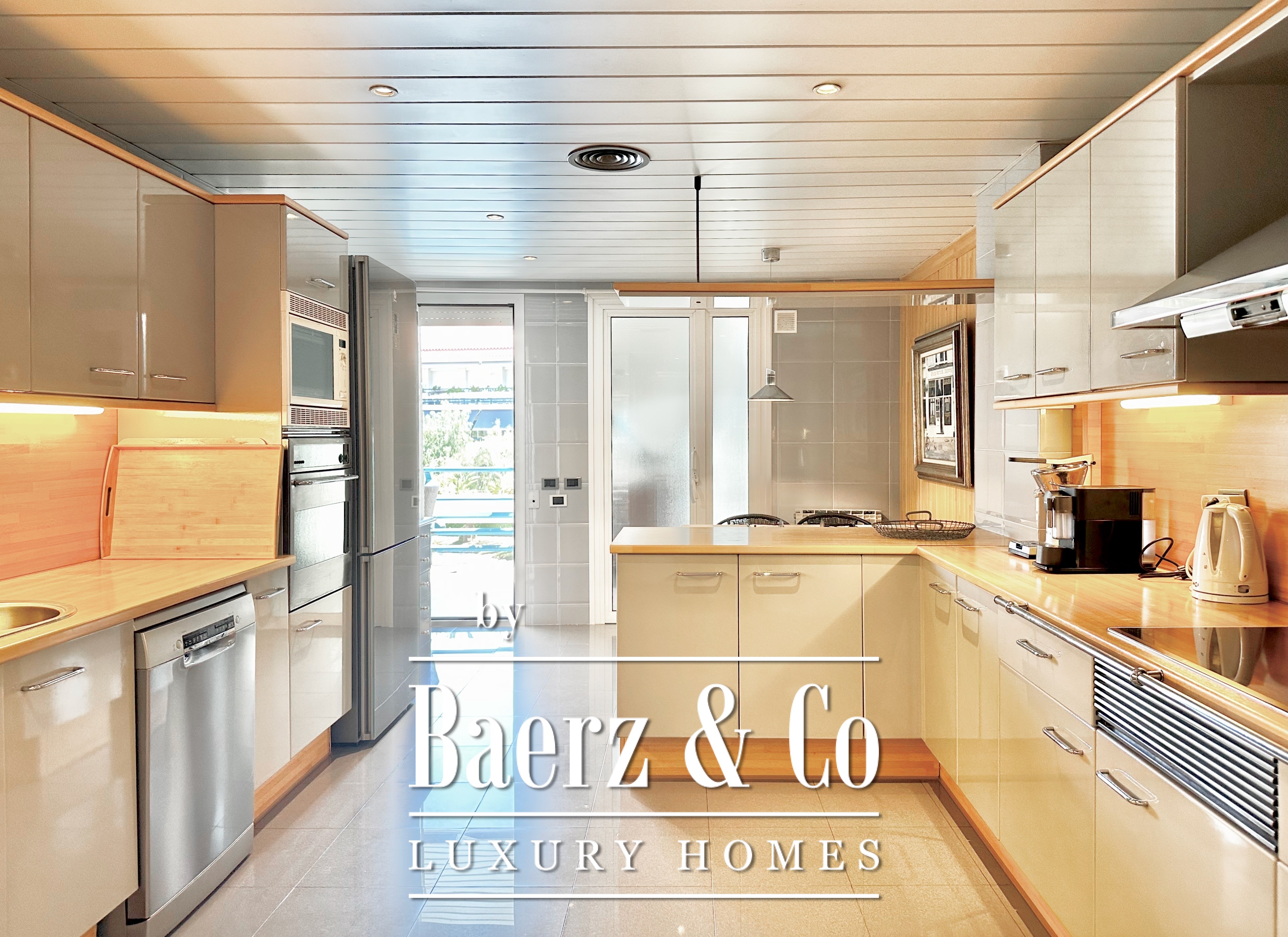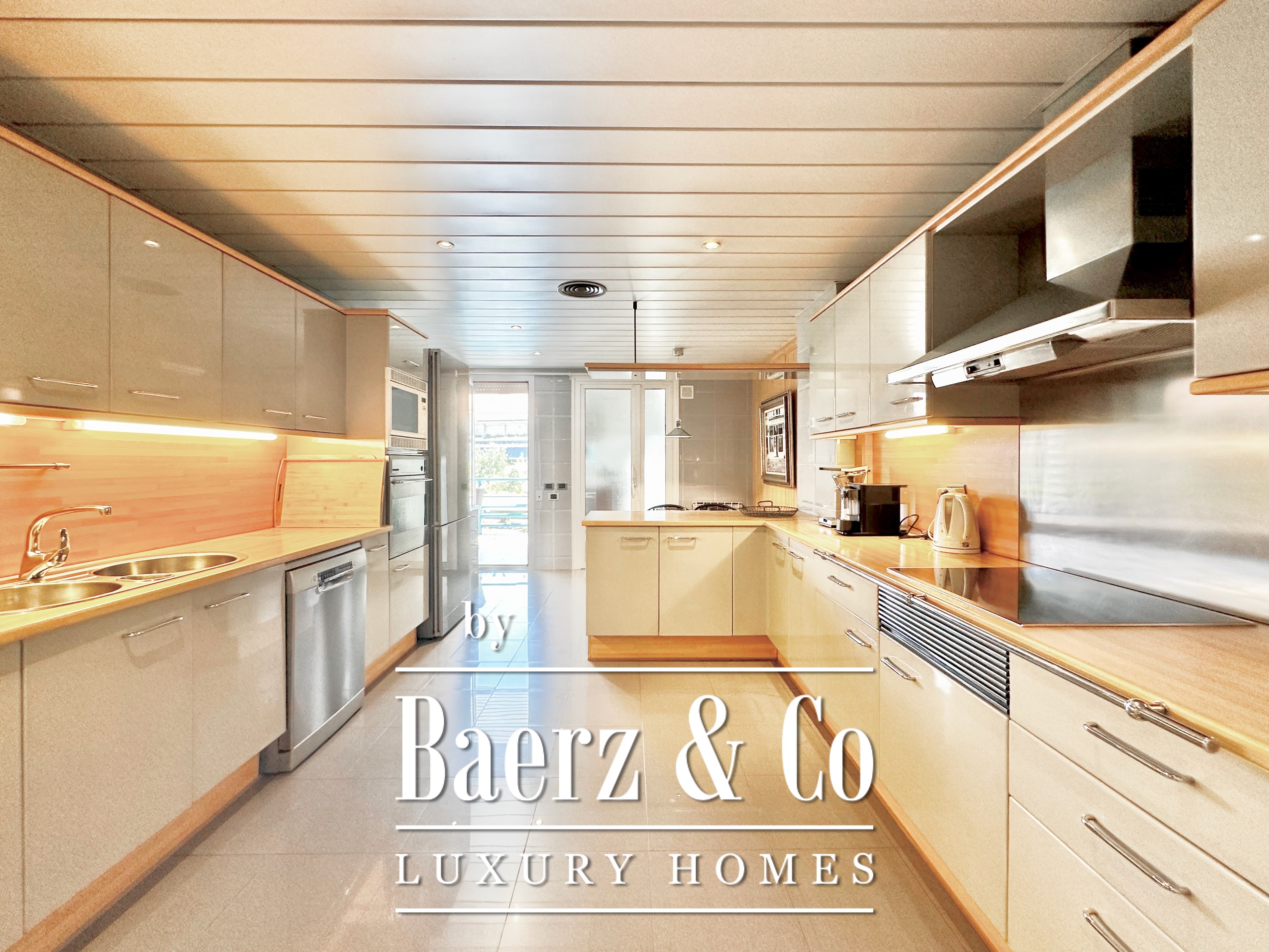 De functionele woonkeuken profiteert van een vrij uitzicht over de fraai aangelegde gemeenschappelijke ruimtes. Moderne voorzieningen zijn onder meer airconditioning, verwarming op gas, twee riante parkeerplaatsen, een berging van 14 m², lift en 24-uurs beveiliging. De woning wordt ongemeubileerd aangeboden, waarmee u volledige vrijheid heeft om het interieur naar eigen wens vorm te geven.