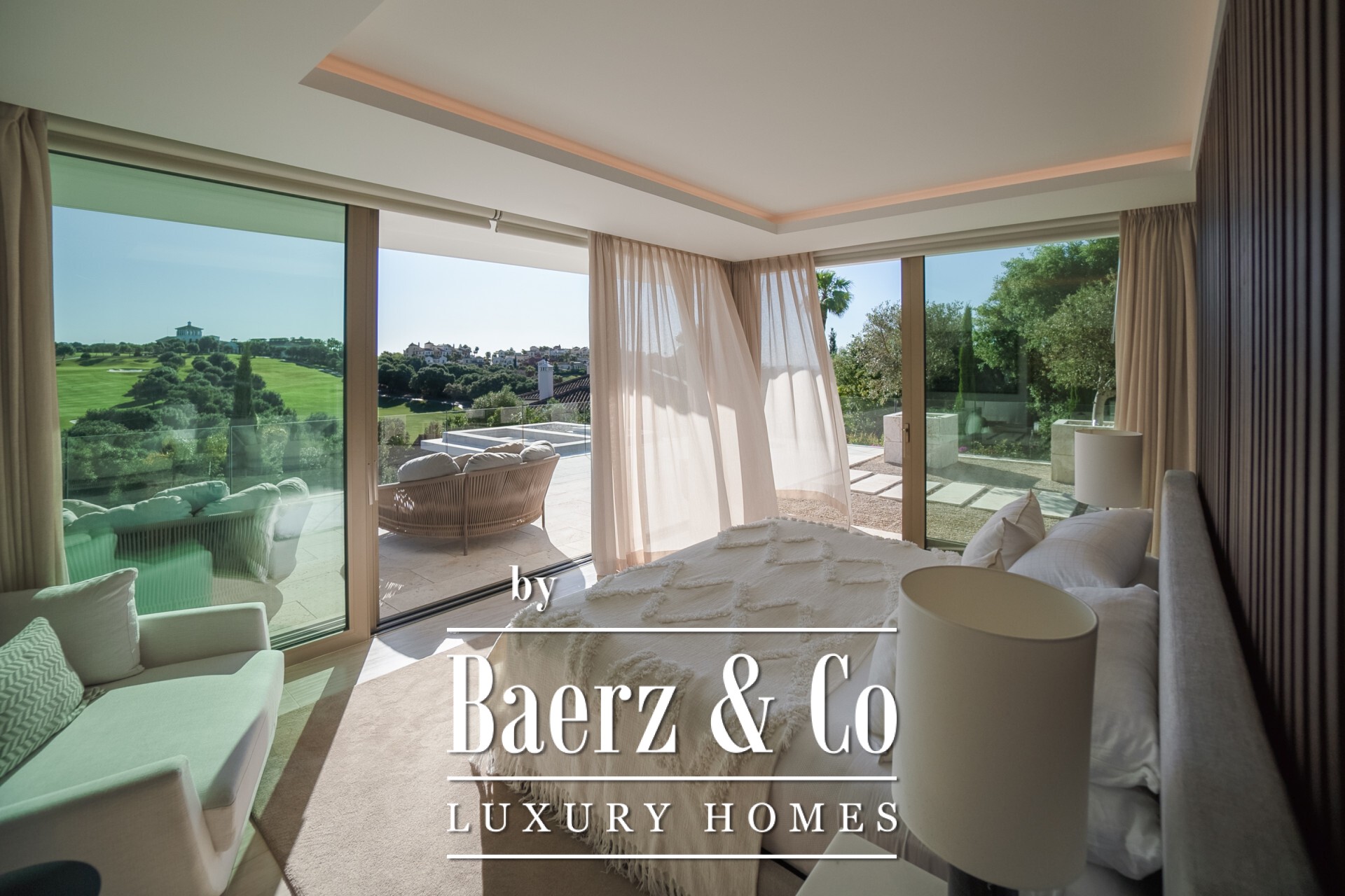 Set just above the 18th hole of La Reserva Club Sotogrande, this exceptional contemporary villa blends cutting-edge architecture with calm natural surroundings. Designed by Manuel Ruiz Moriche of ARK Architects, it occupies a 3,416 m² plot with 1,174 m² built across three floors connected by a lift. Expansive glass walls flood the interiors with light and capture open views across the golf course to the Mediterranean. Inside are five elegant bedrooms, generous open-plan living spaces, and a sleek designer kitchen, all finished to an impeccable standard. A discreet Sonos sound system runs throughout the home, offering seamless audio indoors and out. The lower level is dedicated to leisure and wellness, featuring a spa, gym, sauna, and cold plunge pool, creating a private sanctuary for relaxation and entertainment. Outside, landscaped gardens by renowned designer Rocío Sainz de Rozas integrate olive trees and aromatic Mediterranean planting, enhancing the villa’s harmony with its surroundings. Expansive terraces,