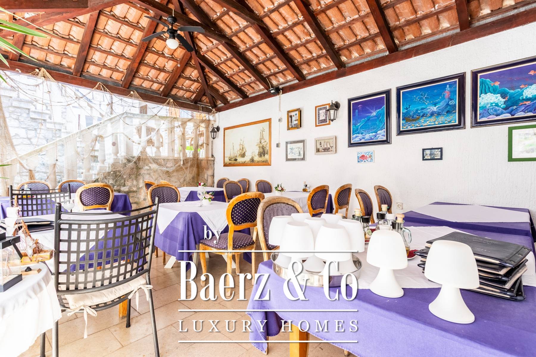 De begane grond verwelkomt met een overdekt terras van 60 m² en een open terras van 80 m², met de mogelijkheid om verticaal uit te breiden. Binnen vindt u een volledig uitgeruste taverne met professionele apparatuur, toegewezen cateringfaciliteiten en een geldige horecavergunning. Afzonderlijke ingangen bedienen zowel het restaurant op de begane grond als de bovenliggende woonvertrekken, wat privacy en flexibiliteit waarborgt.