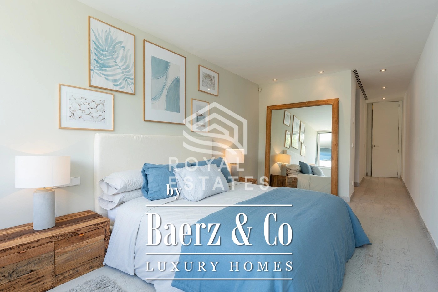 This exceptional duplex penthouse is located in the exclusive Es Pouet residential complex, one of the most prestigious and secure communities on Ibiza. Set in the beautiful bay of Talamanca, just minutes from Marina Botafoch and Ibiza Town, this property represents the ultimate expression of modern island living. With breathtaking panoramic views over the Mediterranean Sea and the historic silhouette of Dalt Vila, it offers a unique combination of luxury, privacy, and convenience. Occupying a total built area of approximately 428 m2, with 347 m2 of usable interior space, this residence has been thoughtfully designed to maximize natural light and create a seamless flow between indoor and outdoor living. The main floor features a spacious open-plan living and dining area with floor-to-ceiling windows that open onto a large terrace overlooking the bay. The contemporary kitchen is fully equipped with high-end appliances and an elegant kitchen-office layout that blends functionality with style. The property includes four generous bedrooms, three with its own en-suite bathroom, ensuring complete privacy and comfort for residents and guests alike. The master suite is particularly impressive, with direct terrace access and stunning sea views. Additionally, there is a guest toilet and a separate laundry room for added convenience. The interiors are defined by clean lines, natural tones, and premium materials that reflect understated elegance and quality craftsmanship. An architectural highlight of this penthouse is its spectacular