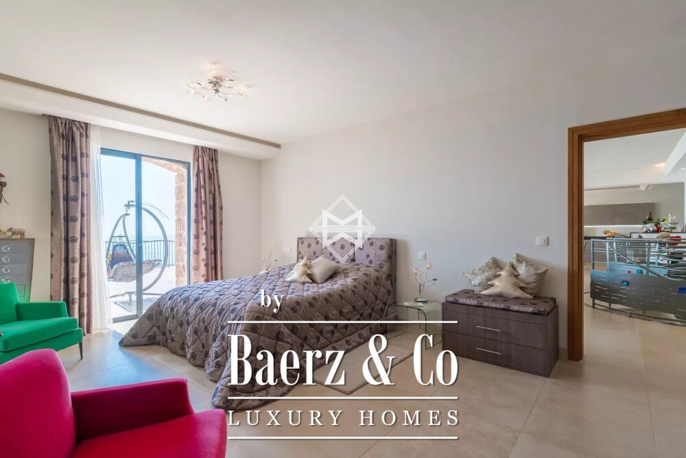 Vijf slaapkamers en vier badkamers zijn doordacht ingedeeld over uitnodigende leefruimtes, allemaal gepositioneerd om optimaal van het mediterrane licht te genieten. De terrassen vloeien naadloos over in een verwarmd overloopzwembad en jacuzzi, elk strategisch geplaatst om het uitzicht en de privacy maximaal te waarborgen.