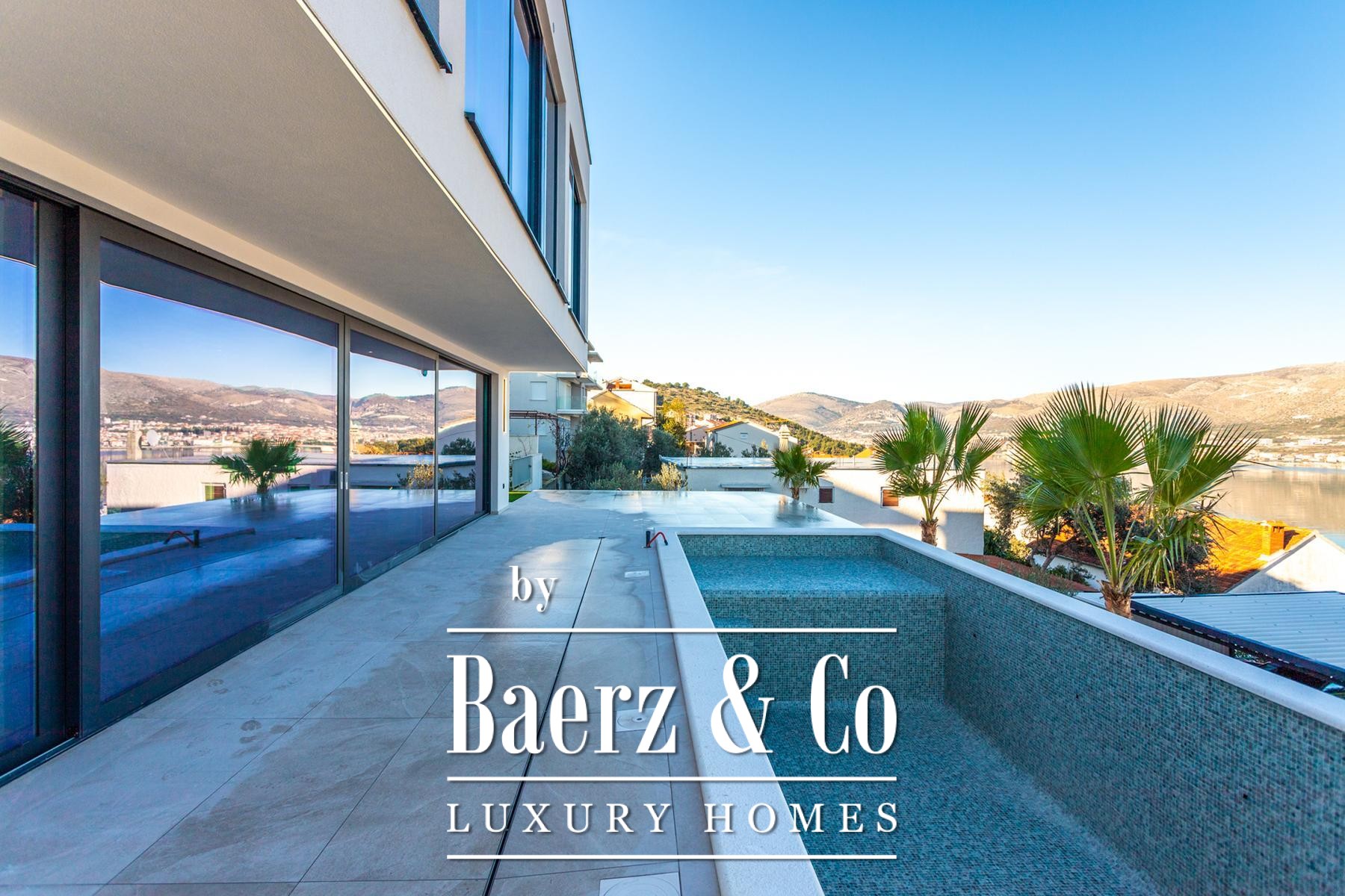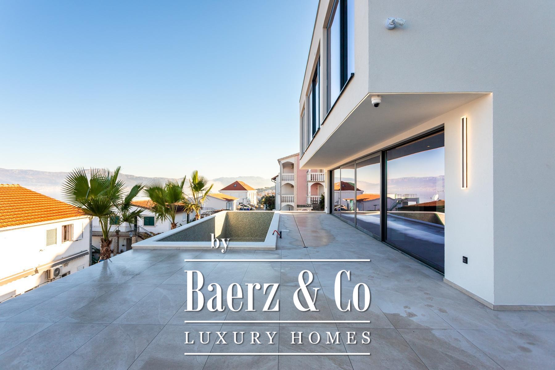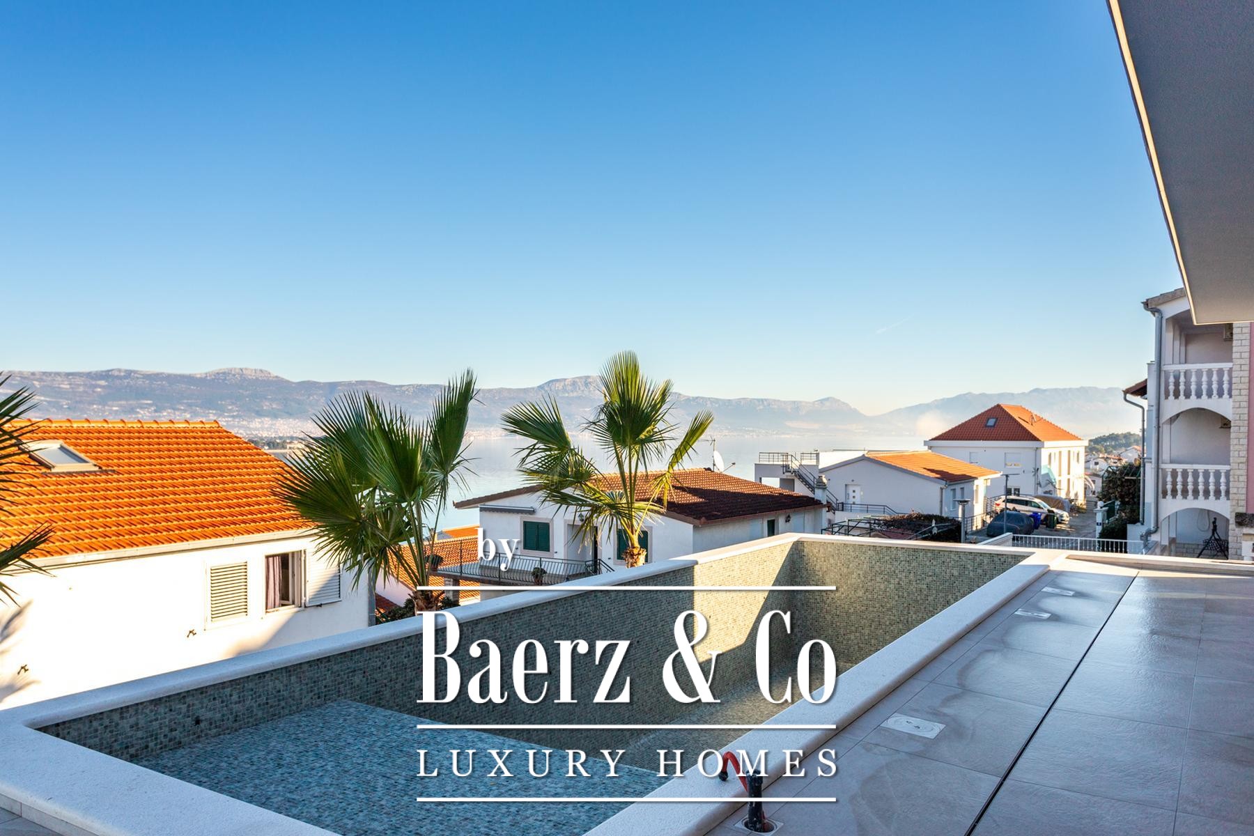 Villa Trogir Okolica biedt een onbelemmerd uitzicht op zee vanuit haar verhoogde ligging in Mastrinka, Čiovo, Kroatië. Deze nieuwgebouwde villa omvat 278 m² woonruimte, verdeeld over drie niveaus, waarbij elk detail getuigt van doordacht design.