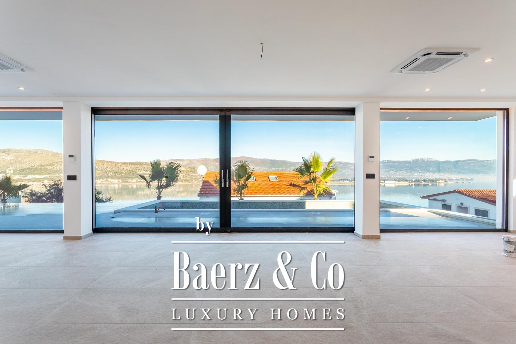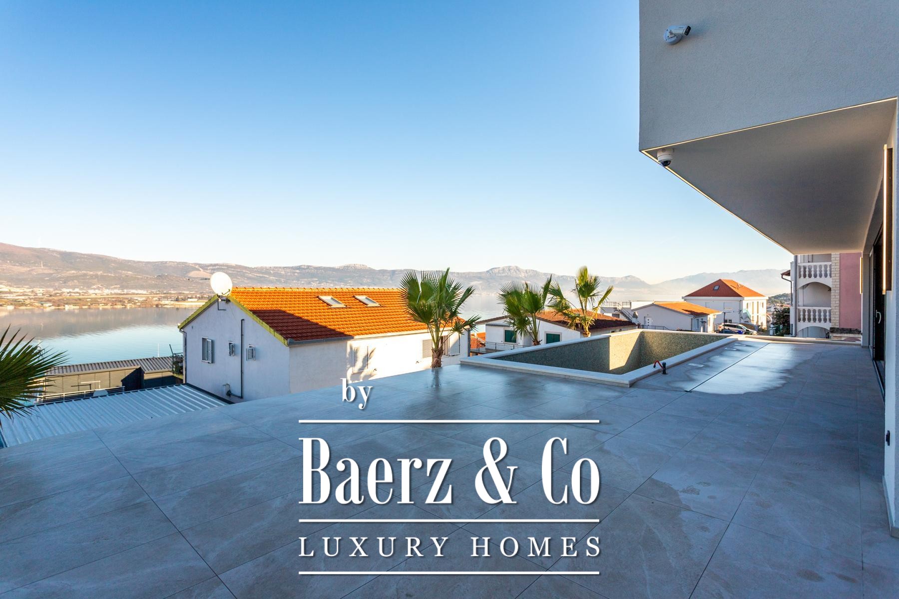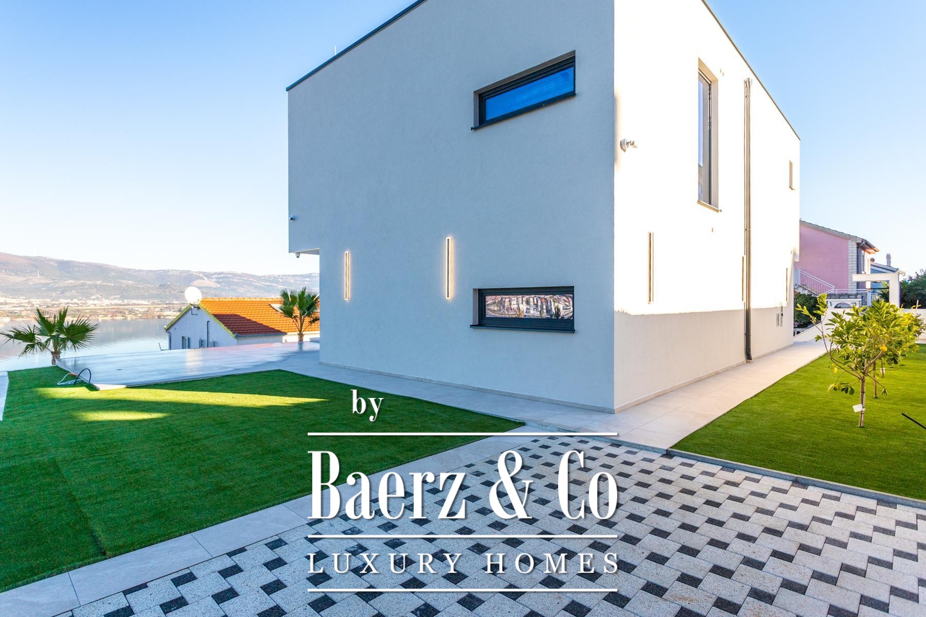 Villa Trogir Okolica biedt een onbelemmerd uitzicht op zee vanuit haar verhoogde ligging in Mastrinka, Čiovo, Kroatië. Deze nieuwgebouwde villa omvat 278 m² woonruimte, verdeeld over drie niveaus, waarbij elk detail getuigt van doordacht design.