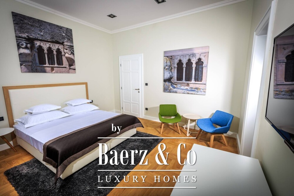 Apartment Trogir is gevestigd in een gebouw uit 1928, midden in het hart van de stad. De residentie beslaat in totaal 321 m², met 142,66 m² verfijnde binnenruimte, een open balkon van 12,49 m² en een indrukwekkend dakterras van 151,42 m². Dit appartement beschikt over drie slaapkamers, een werkkamer, keuken, eetkamer, woonkamer, twee badkamers, een gastentoilet, een kleedkamer en een voorraadkamer. In iedere ruimte valt het licht met een unieke regelmaat binnen, waarmee het historische karakter van het gebouw wordt versterkt en privacy en openheid moeiteloos samenkomen.
