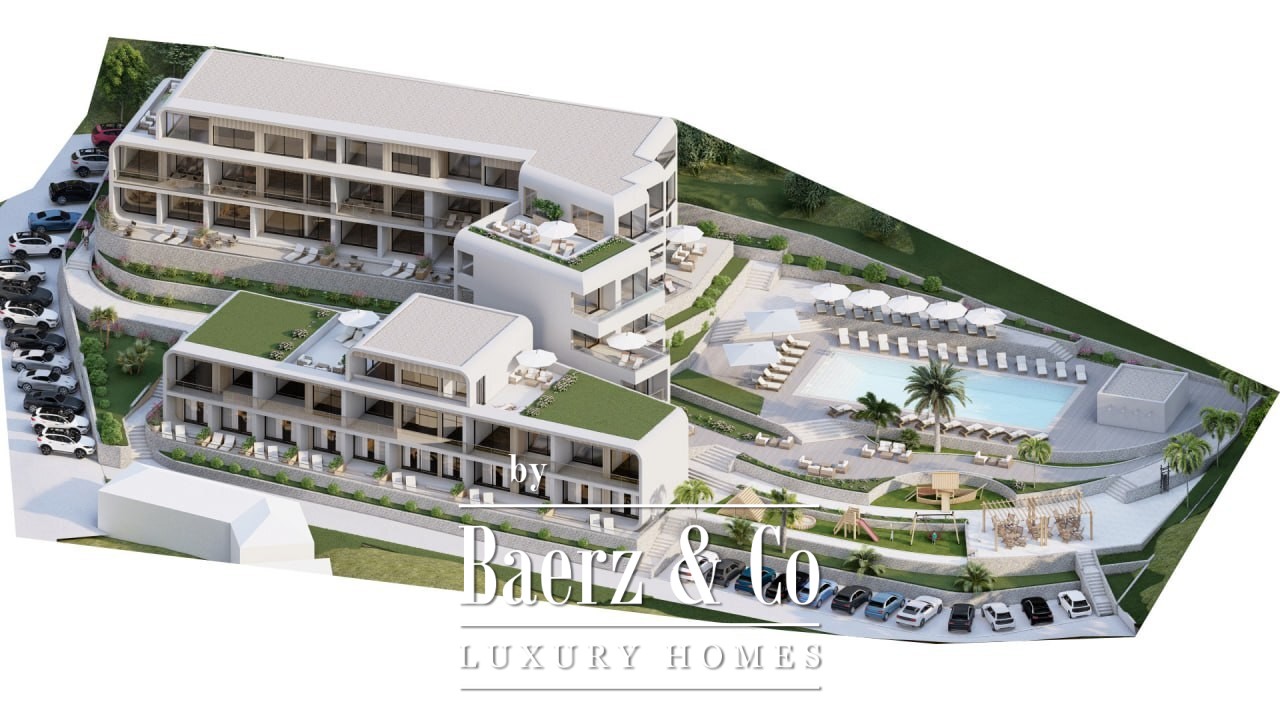 De indeling omvat een royale leefruimte met keuken en eetgedeelte, twee slaapkamers, een badkamer, een gastentoilet en een terras met zorgvuldig gekozen uitzichten op zowel zee als de omliggende bergen. De woning wordt opgeleverd met afgewerkte vloeren, hoogwaardige betegeling, een compleet uitgeruste badkamer en airconditioning, waardoor deze direct klaar is voor gebruik.