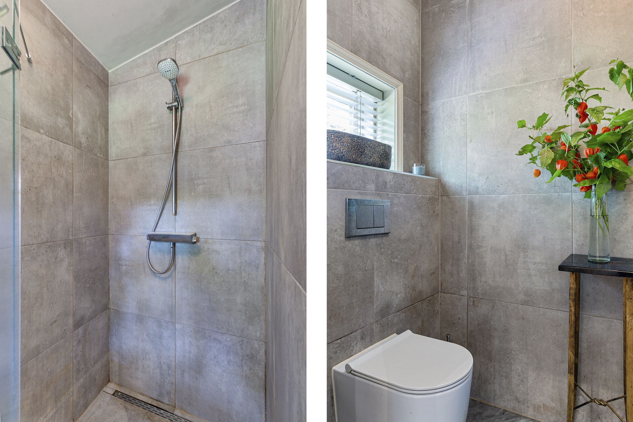 De luxe badkamer is voorzien van keramische tegels, een royale inloopdouche met rookglas, een stijlvol wastafelmeubel, toilet en design handoekradiator.