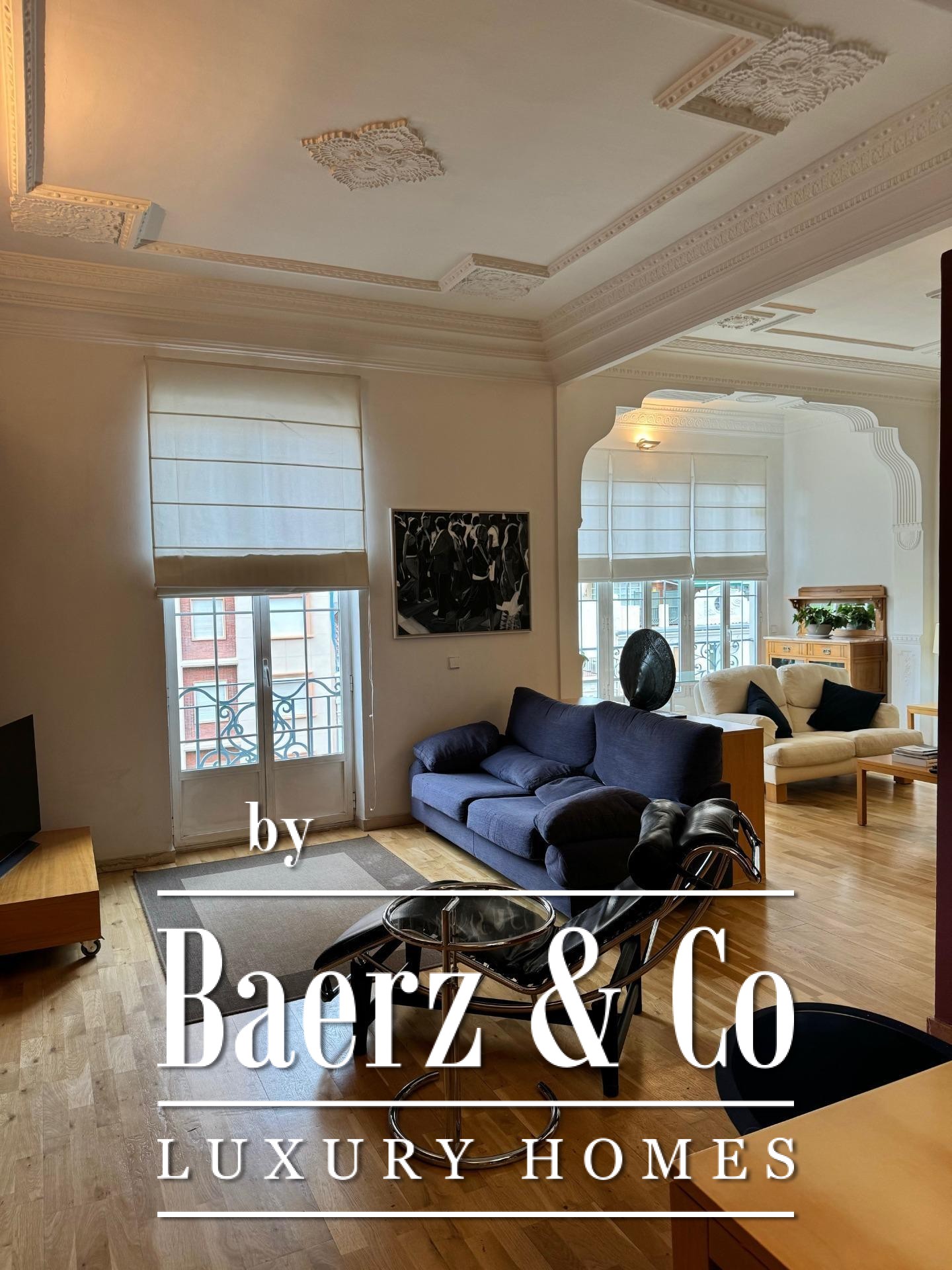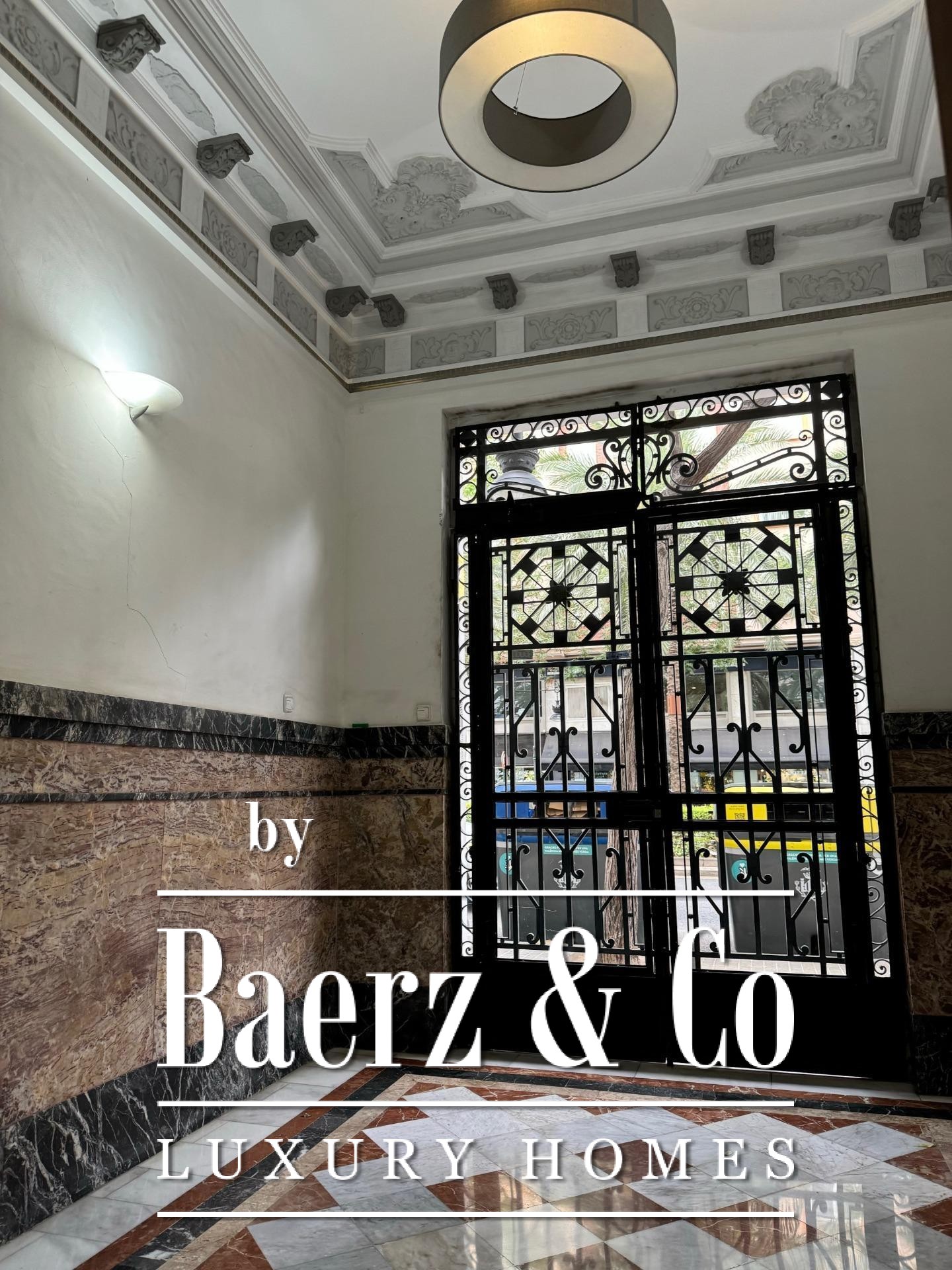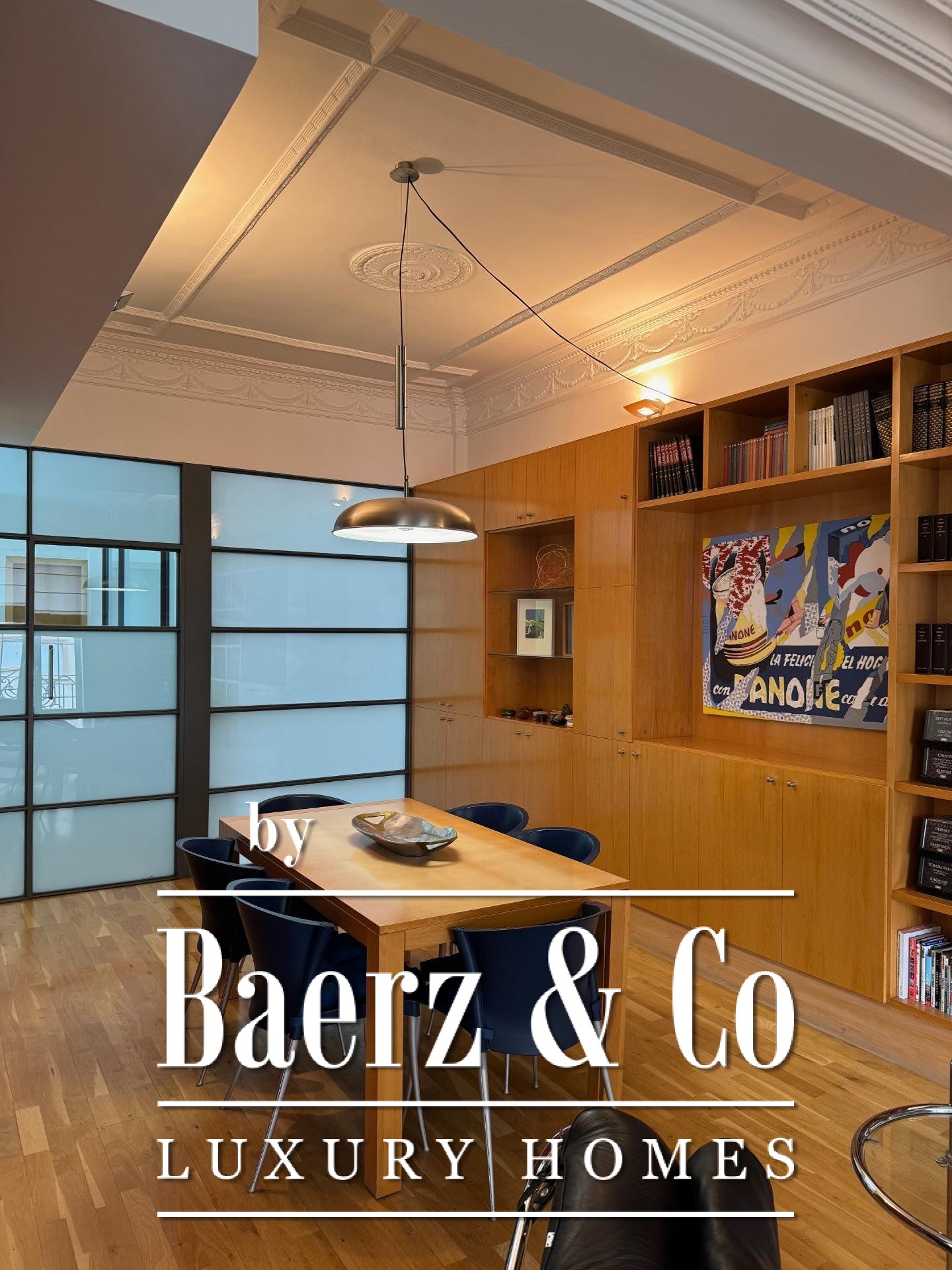 De volledig uitgeruste keuken staat via een industriële deur in verbinding met de eetkamer, waar design en functionaliteit samenkomen. Er zijn vier slaapkamers, waaronder een master suite met een eigen werkruimte en een privébadkamer met een moderne inloopdouche. Twee extra badkamers, waarvan één met bad en één met douche, bieden comfort en rust voor bewoners en gasten. Door het hele appartement vindt u parketvloeren, kasten van beukenhout, marmeren en porseleinen mozaïek in de badkamers en witte aluminium ramen met dubbel glas voor tastbaar comfort en ingetogen klasse.
