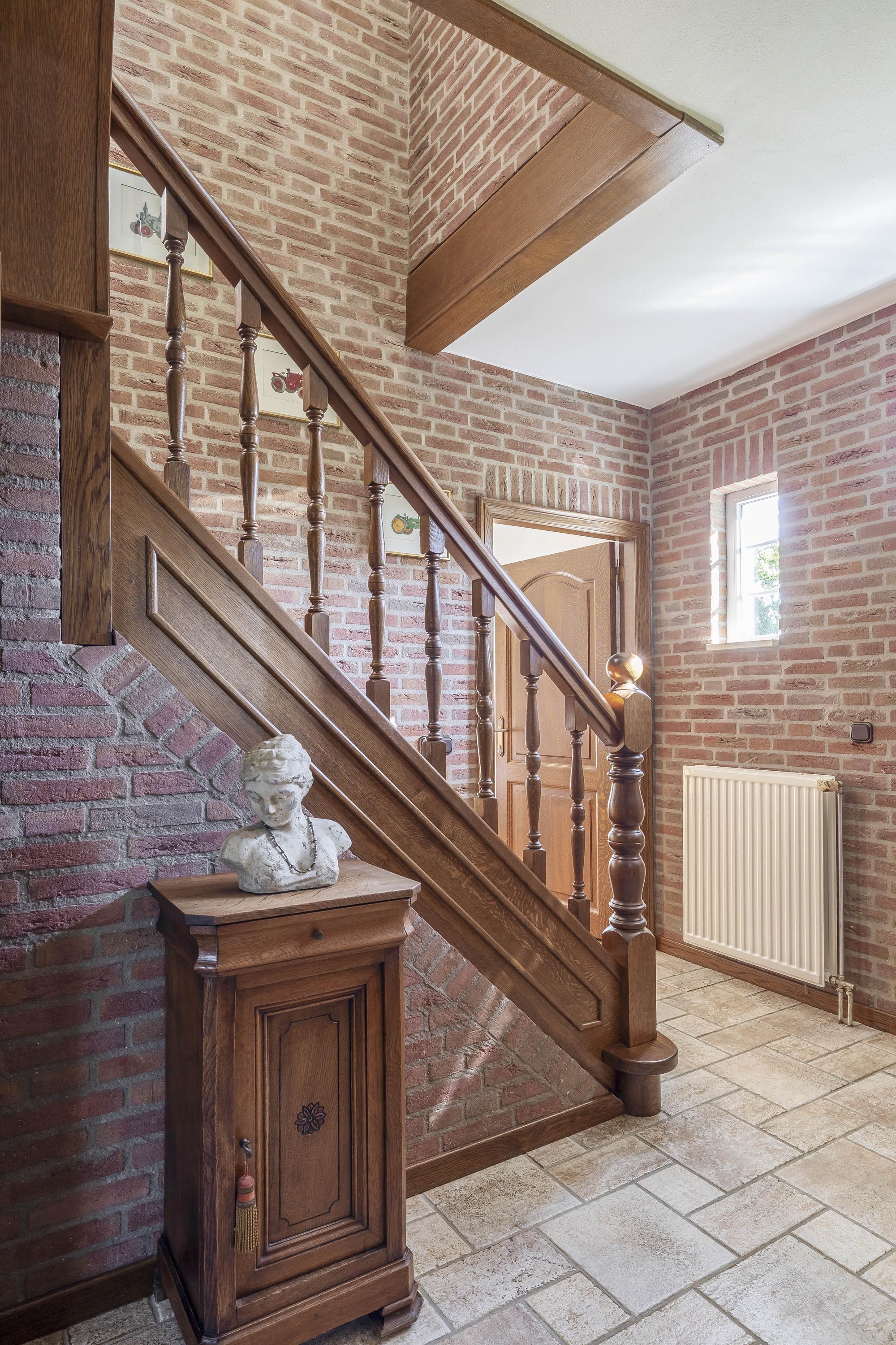 De ruime entreehal biedt toegang tot de woonkamer, toiletruimte, garderobe en de meterkast. Een fraaie houten
