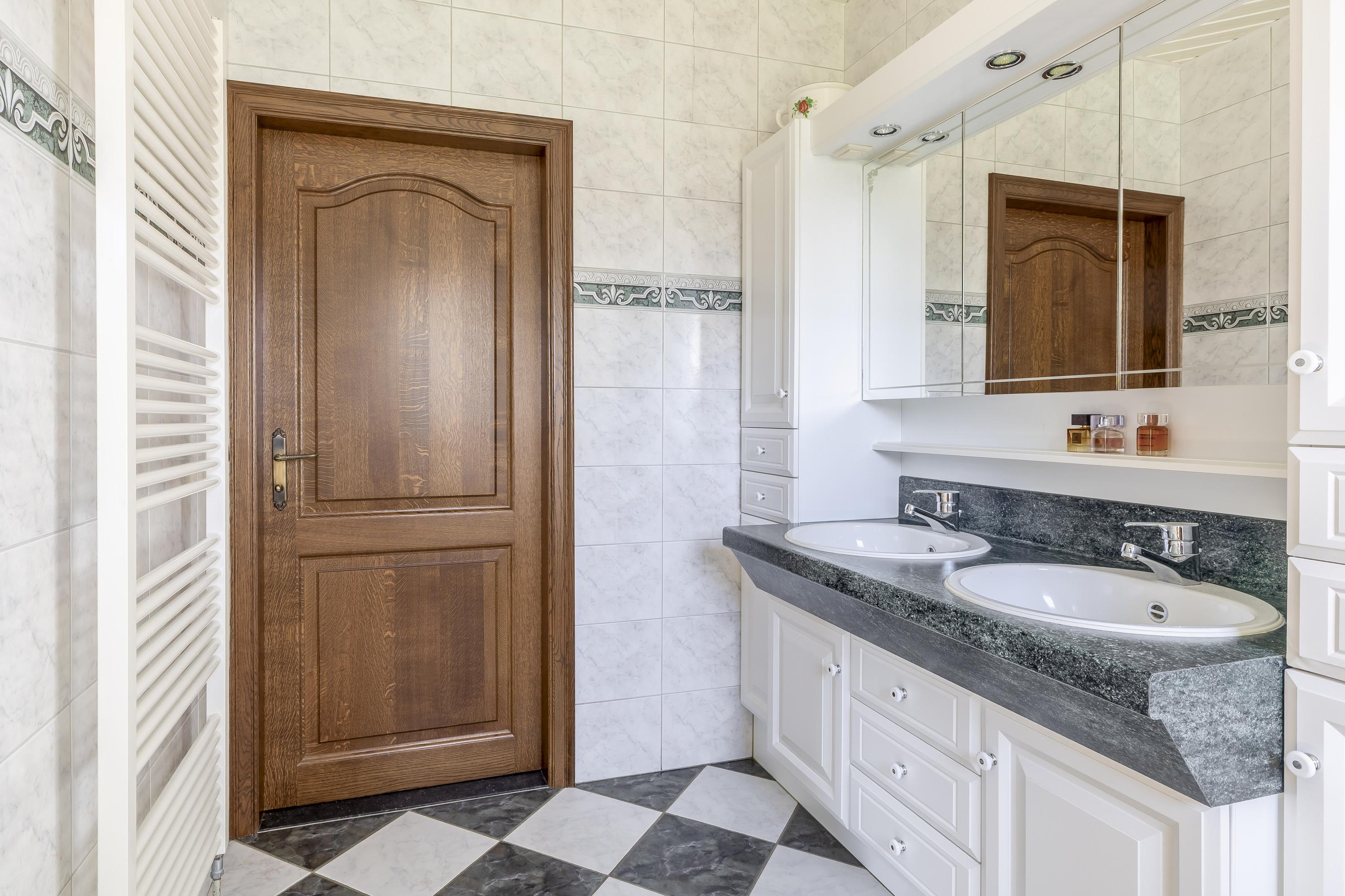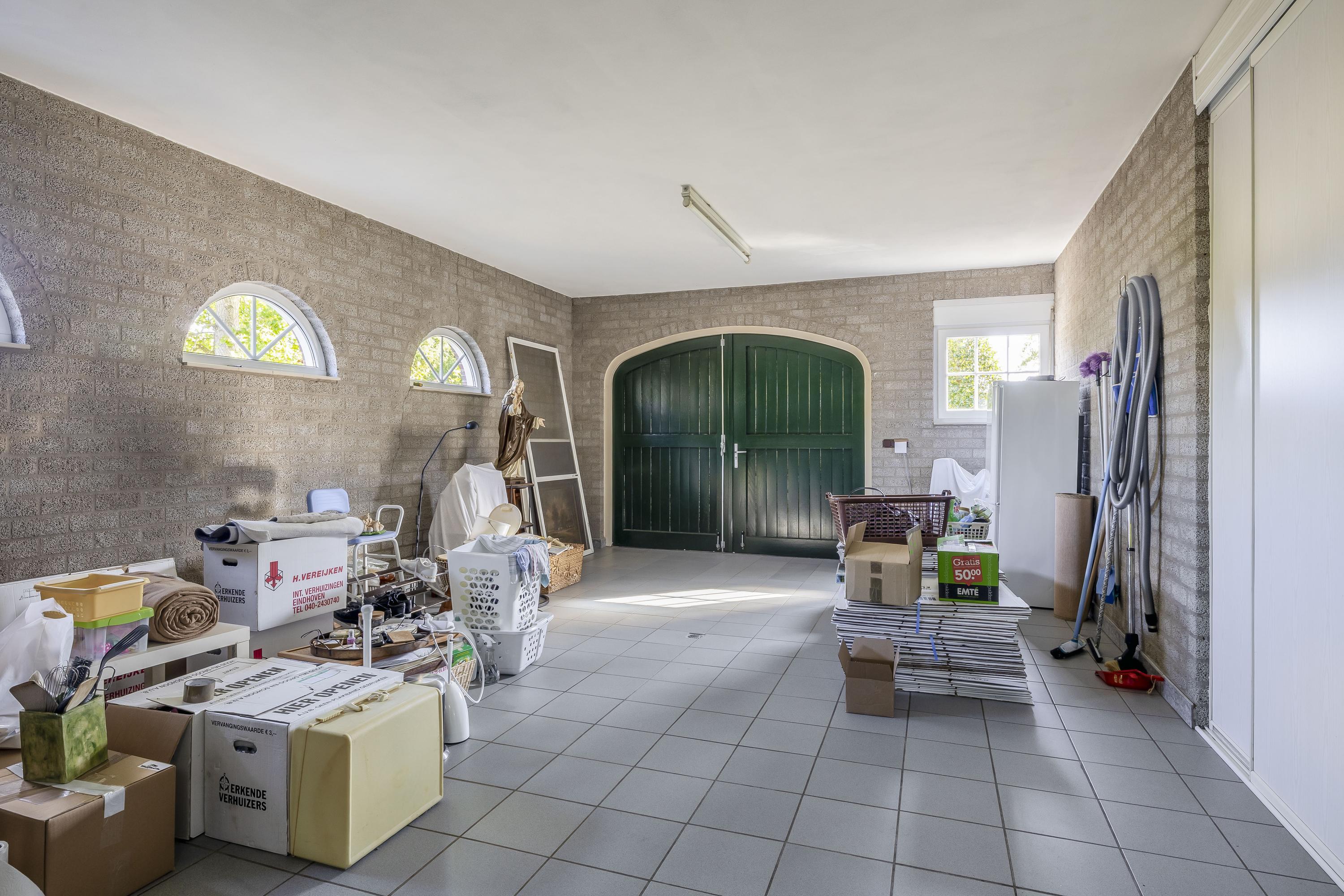 De aanpandige garage is uitgerust met een gootsteen en een vaste kastenwand met schuifdeuren. In deze kast is