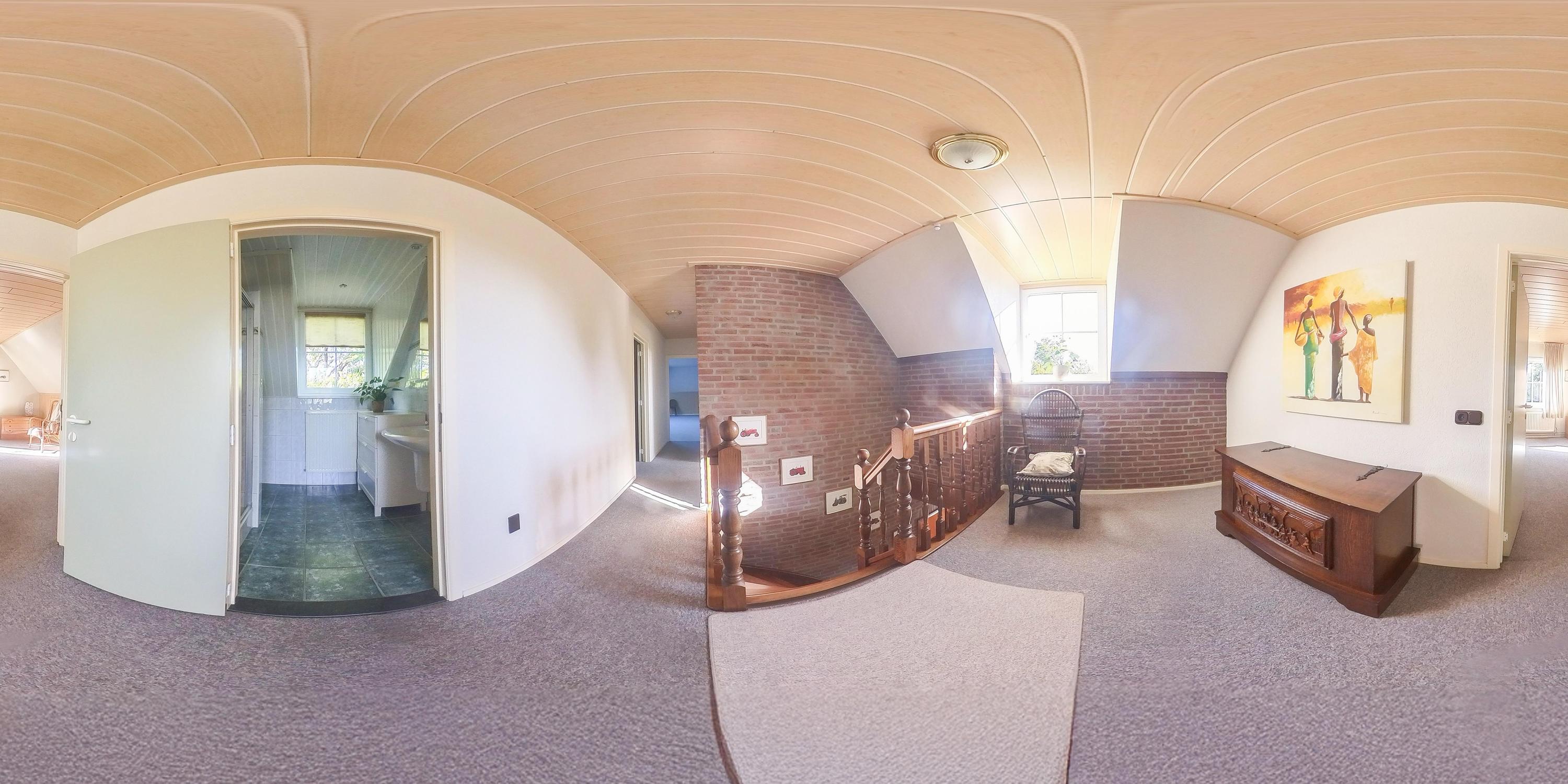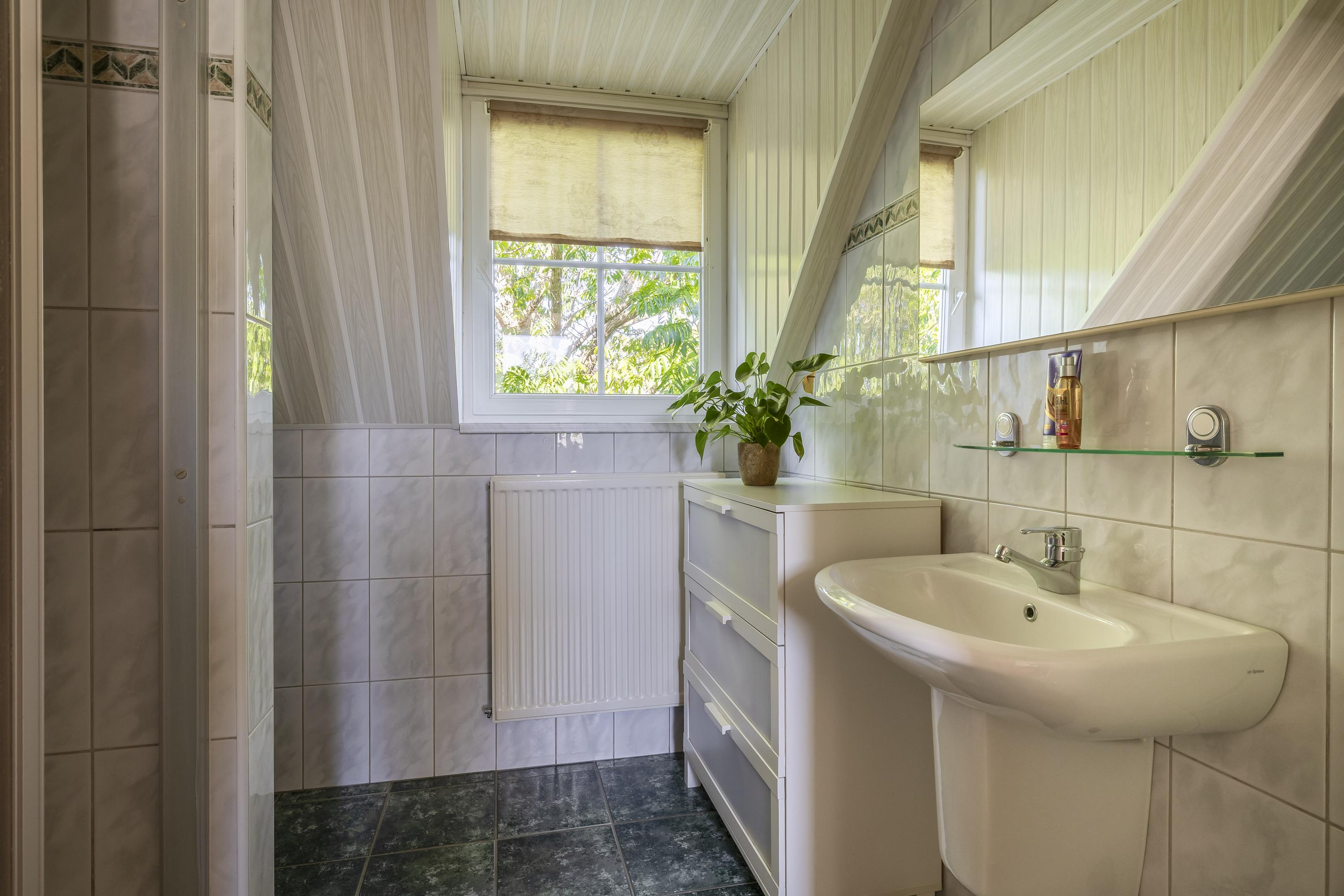 trap biedt toegang tot de 1e verdieping. De royale woonkamer is een heerlijke ruimte. De grote raampartijen en een schuifpui bieden een prachtig vrij uitzicht op de tuin. Het houten balken plafond en de schouw met gaskachel zorgen voor extra sfeer in de ruimte. Ook is er airconditioning aanwezig. De keukeninrichting in de leefkeuken is in een hoekopstelling geplaatst en uitgerust met een vaatwasser, spoelbak, keramische kookplaat, oven, magnetron en een koelkast. Vanuit de keuken bieden raampartijen ook zicht op de tuin. De bijkeuken is deels betegeld en uitgerust met de aansluitingen voor de wasapparatuur. Een loopdeur zorgt voor toegang tot de achtertuin. De badkamer is geheel betegeld en ingericht met een ligbad, een dubbele wastafel met meubel en een designradiator. Aangrenzend aan de badkamer is de slaapkamer gelegen.
