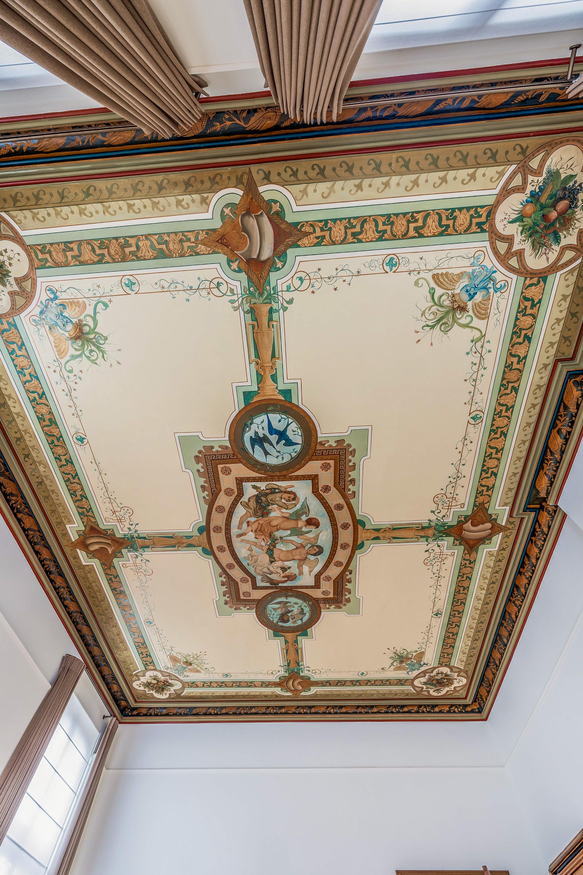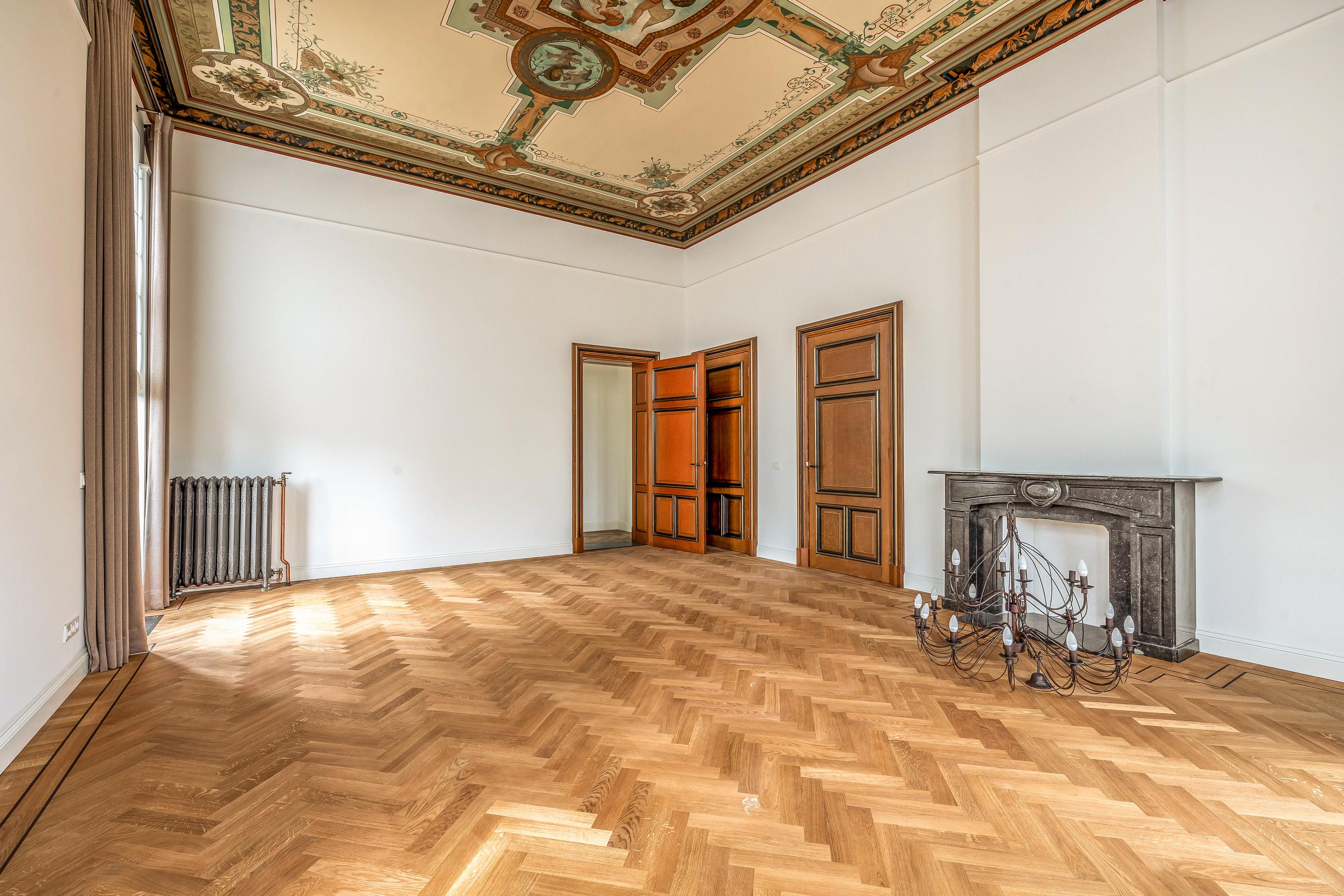 Vanuit de ontvangsthal bereikt u de royale en statige woonkamer, verdeeld in twee comfortabele zitgedeeltes die via grote, houten openslaande deuren van elkaar gescheiden kunnen worden. Zo kan er ook ruimte gecreëerd worden voor bijvoorbeeld een kantoor aan huis. Deze ruimtes worden gekenmerkt door de hoge plafonds en de indrukwekkende, authentieke plafondschilderingen die een tijdloze sfeer creëren. Het licht valt rijkelijk binnen en benadrukt de warme, uitnodigende ambiance van deze leefruimtes.