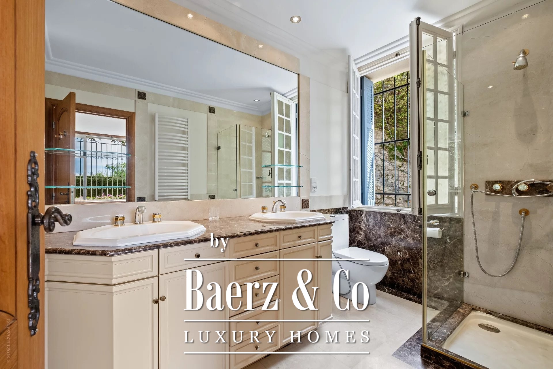 Een apart gastenverblijf nodigt uit tot bijeenkomsten en omvat een woonruimte, open keuken en een slaapkamer met badkamer, omringd door royale terrassen en onbelemmerd zeezicht. De terrastuinen, het infinity zwembad en het pool house met jacuzzi zorgen voor een discrete, luxueuze sfeer. Twee grote garages, bereikbaar per lift, bieden praktisch gemak. De villa ligt nabij lokale voorzieningen, wat zorgt voor een dagelijks ritme dat zowel rustgevend als verbonden is.