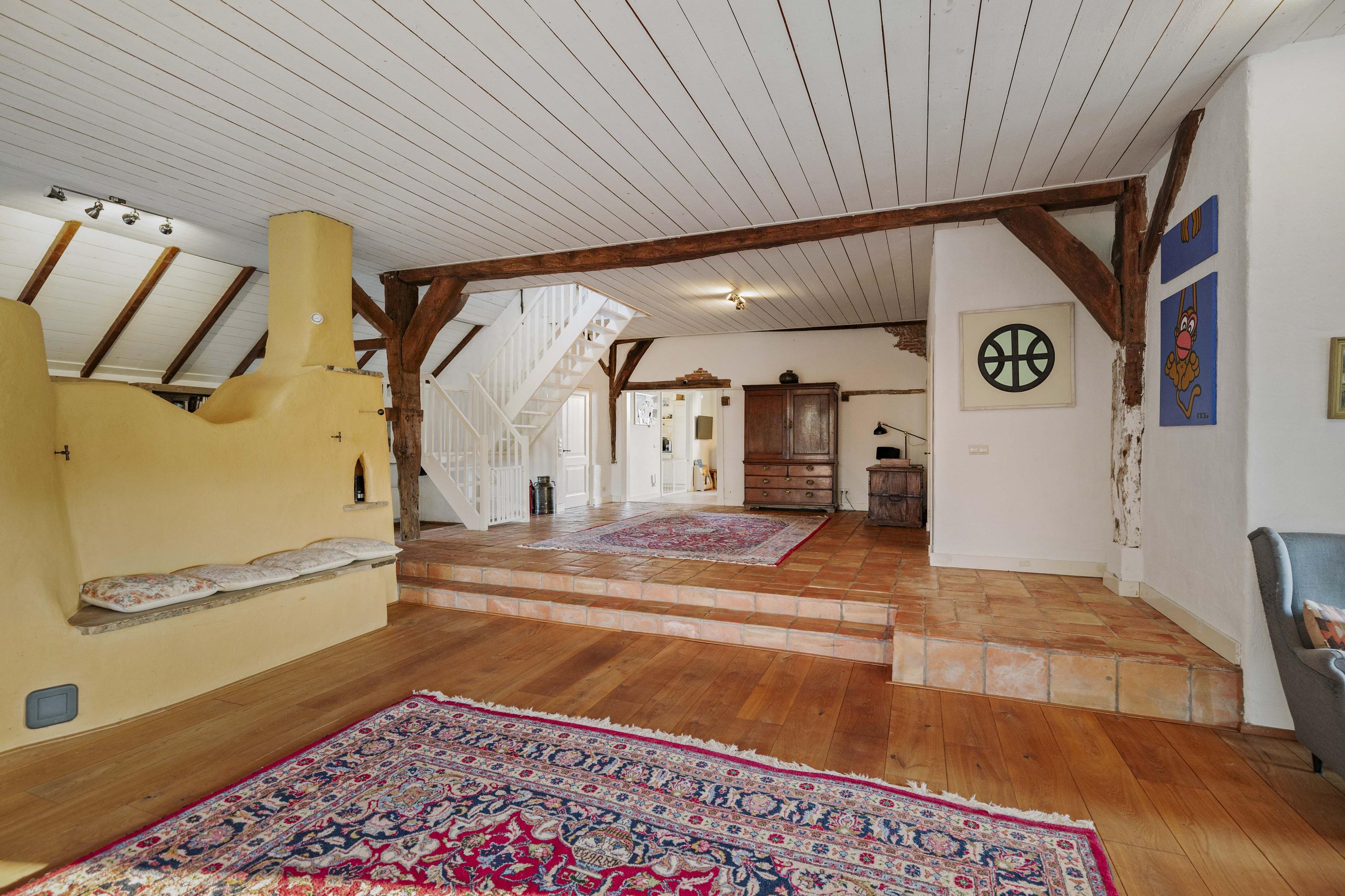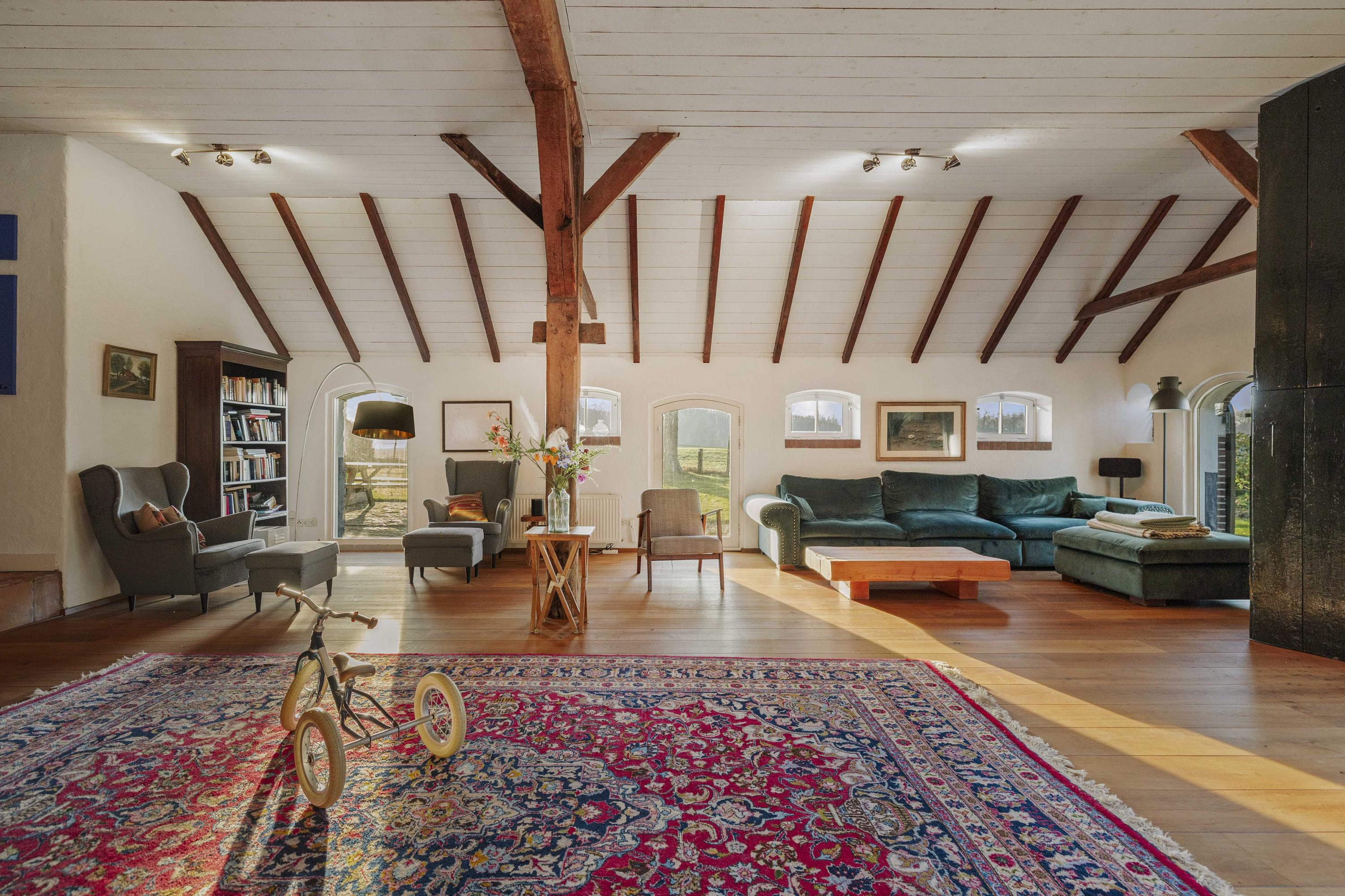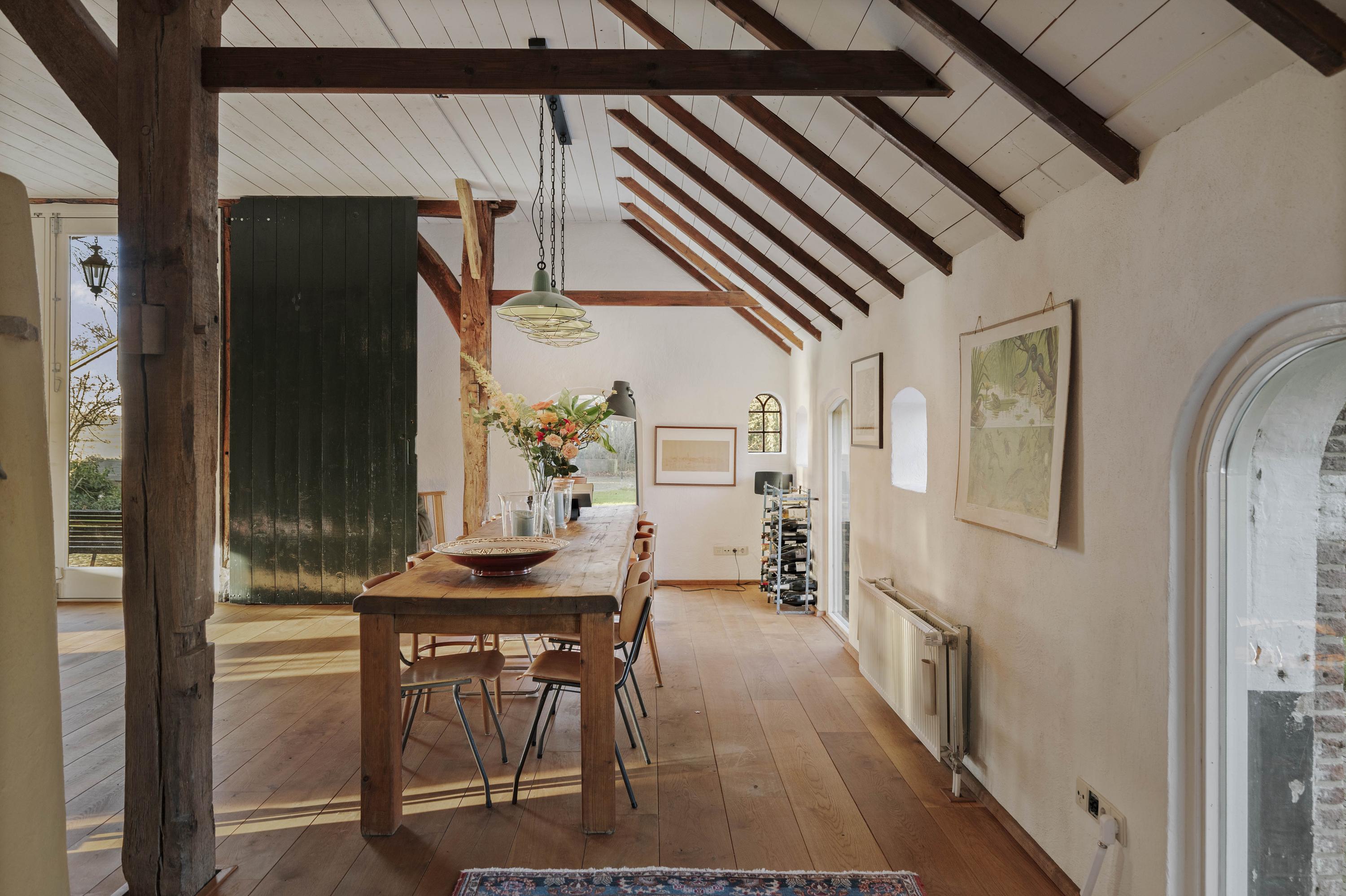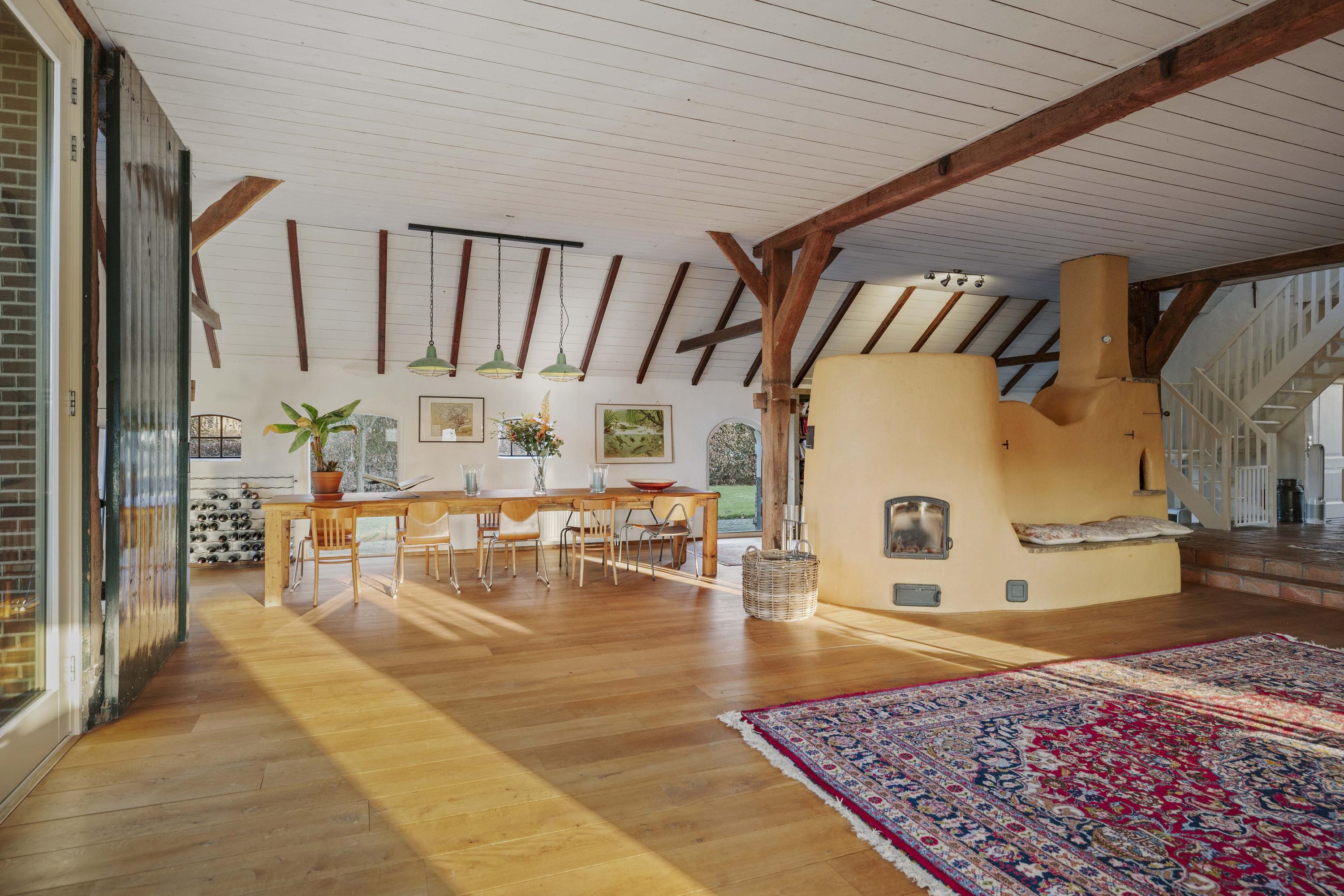 De deel is een fantastische ruimte: dik 150 m² aan woonoppervlak, boordevol sfeer en landelijke charme. Op de vloer ligt een eiken planken vloer en de oude gebinten staan nog fier in de kamer. In het hart van de ruimte staat een schitterende leemkachel. Deze kachels zijn geliefd om hun efficiënte manier van verwarmen, want naast dat ze de living op temperatuur houden, wordt ook het water verwarmd. De deeldeuren – de opening is nu ingevuld met glas - zijn aan de binnenzijde teruggeplaatst en herinneren aan de voormalige functie van de deel, want hier stonden de koeien.