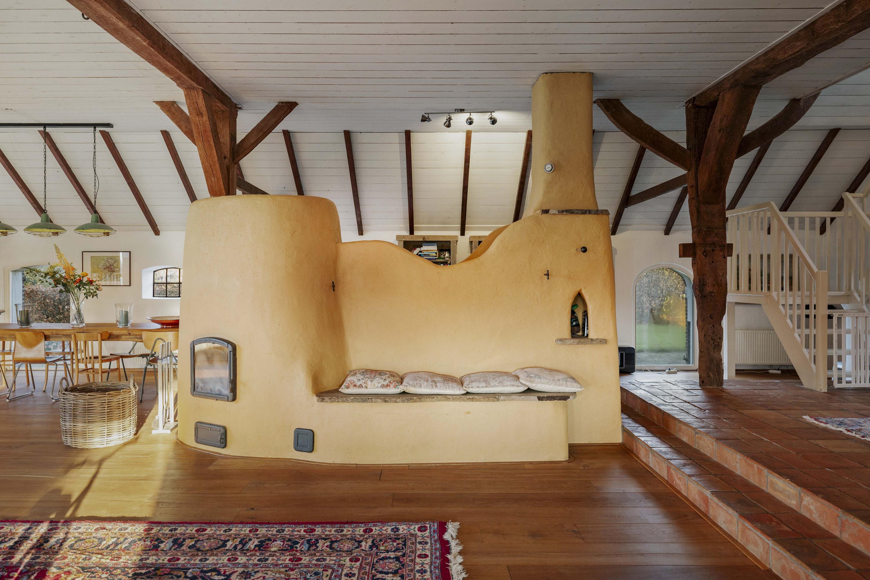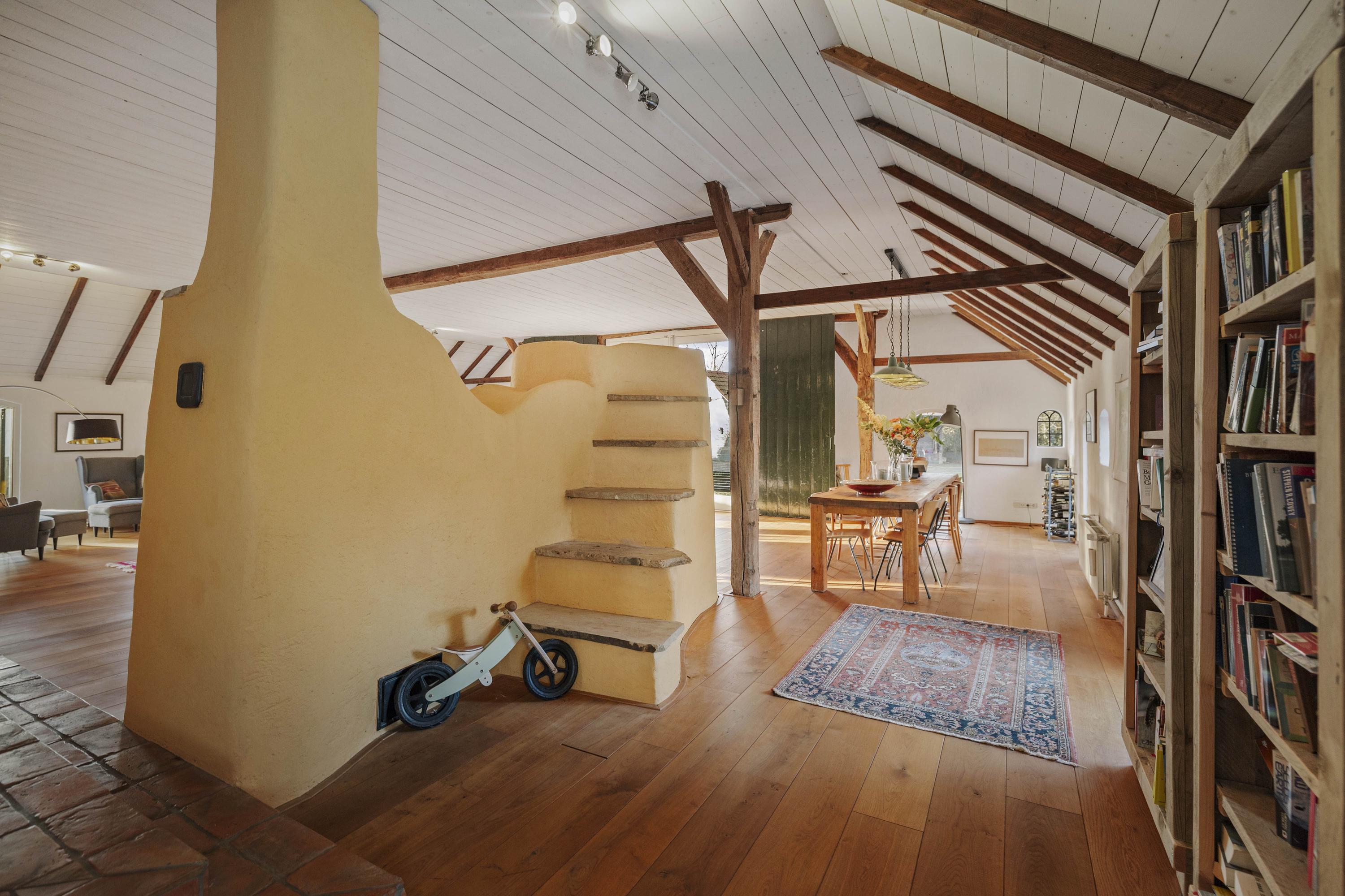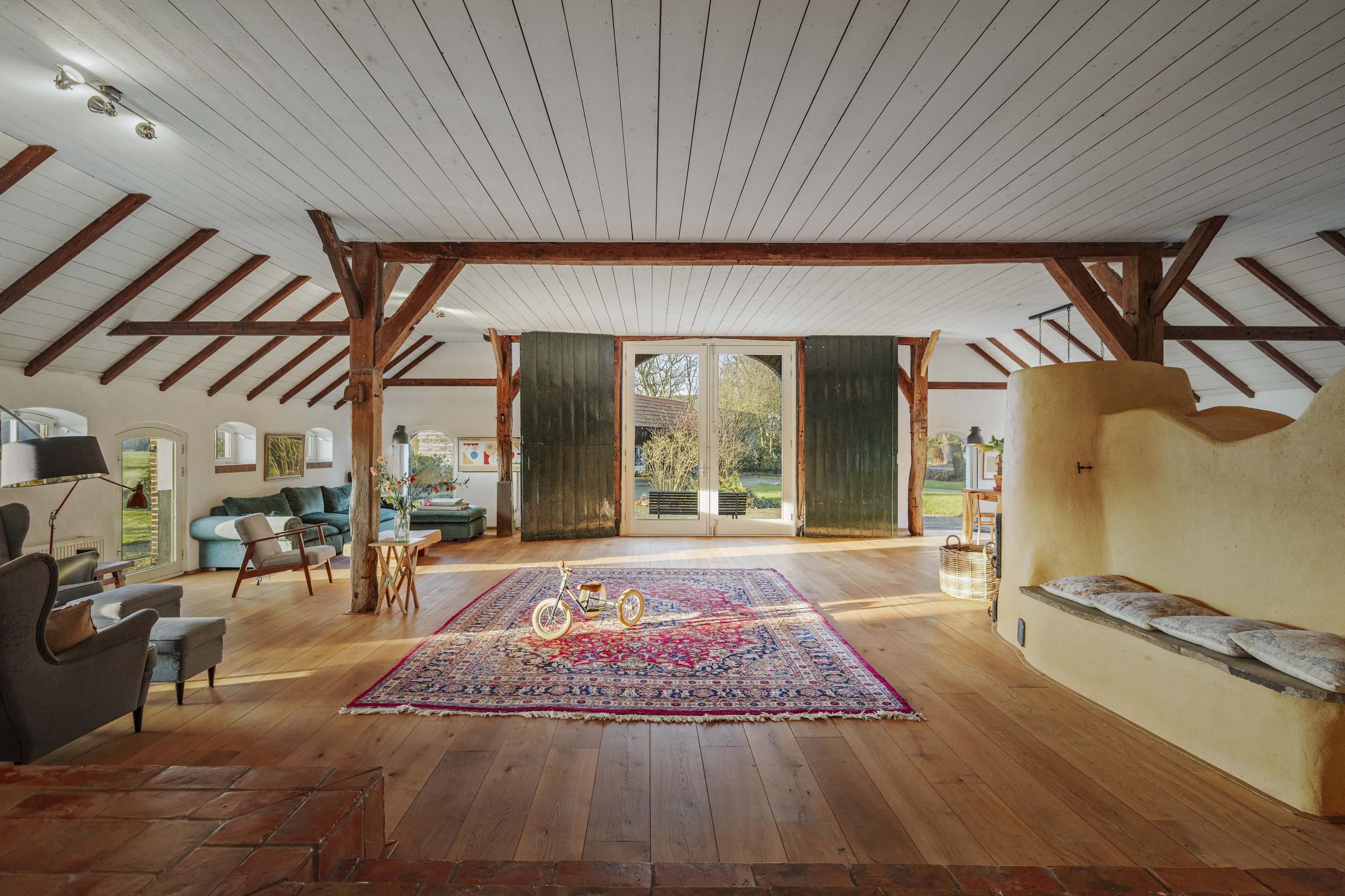 De deel is een fantastische ruimte: dik 150 m² aan woonoppervlak, boordevol sfeer en landelijke charme. Op de vloer ligt een eiken planken vloer en de oude gebinten staan nog fier in de kamer. In het hart van de ruimte staat een schitterende leemkachel. Deze kachels zijn geliefd om hun efficiënte manier van verwarmen, want naast dat ze de living op temperatuur houden, wordt ook het water verwarmd. De deeldeuren – de opening is nu ingevuld met glas - zijn aan de binnenzijde teruggeplaatst en herinneren aan de voormalige functie van de deel, want hier stonden de koeien.