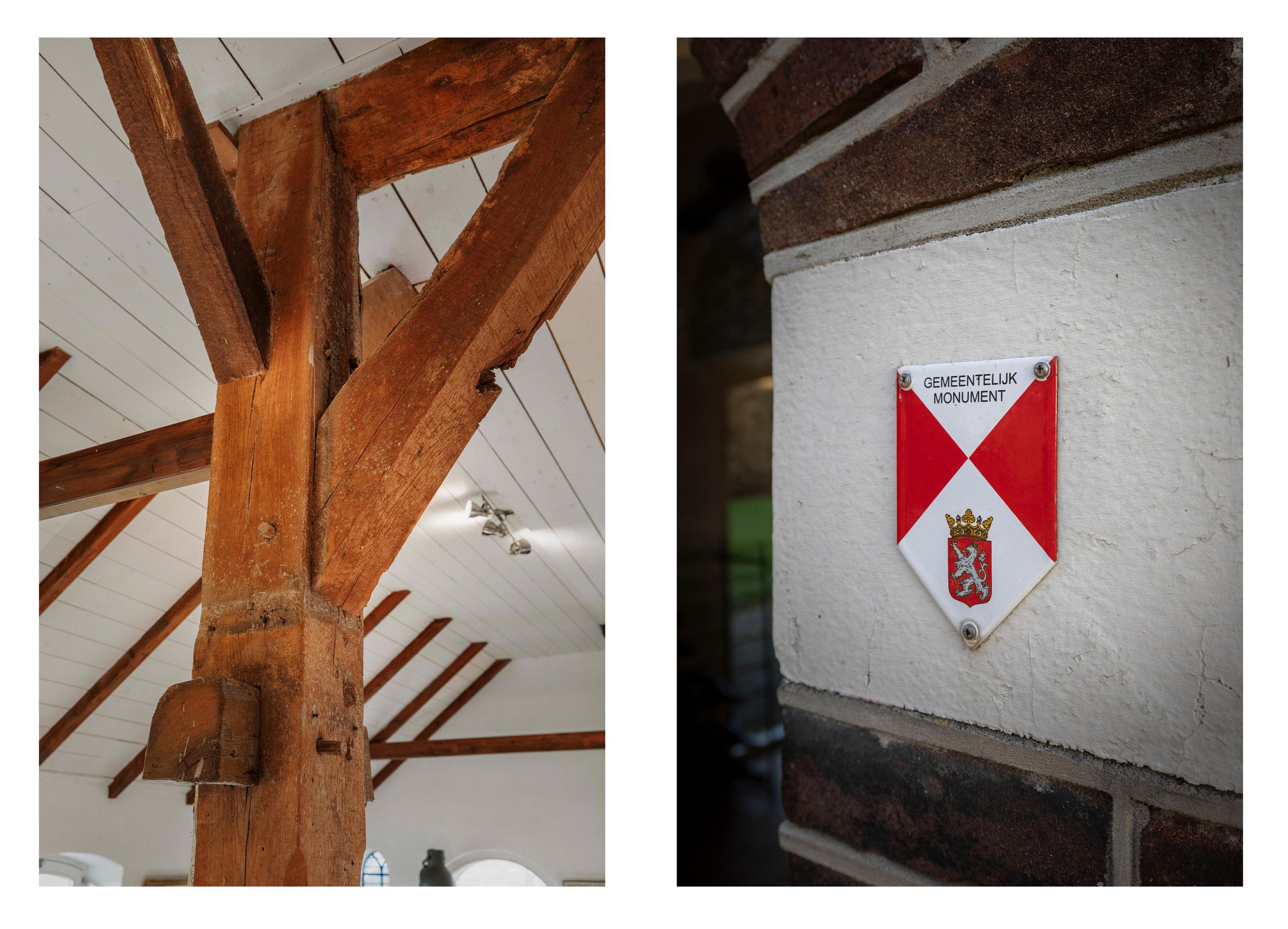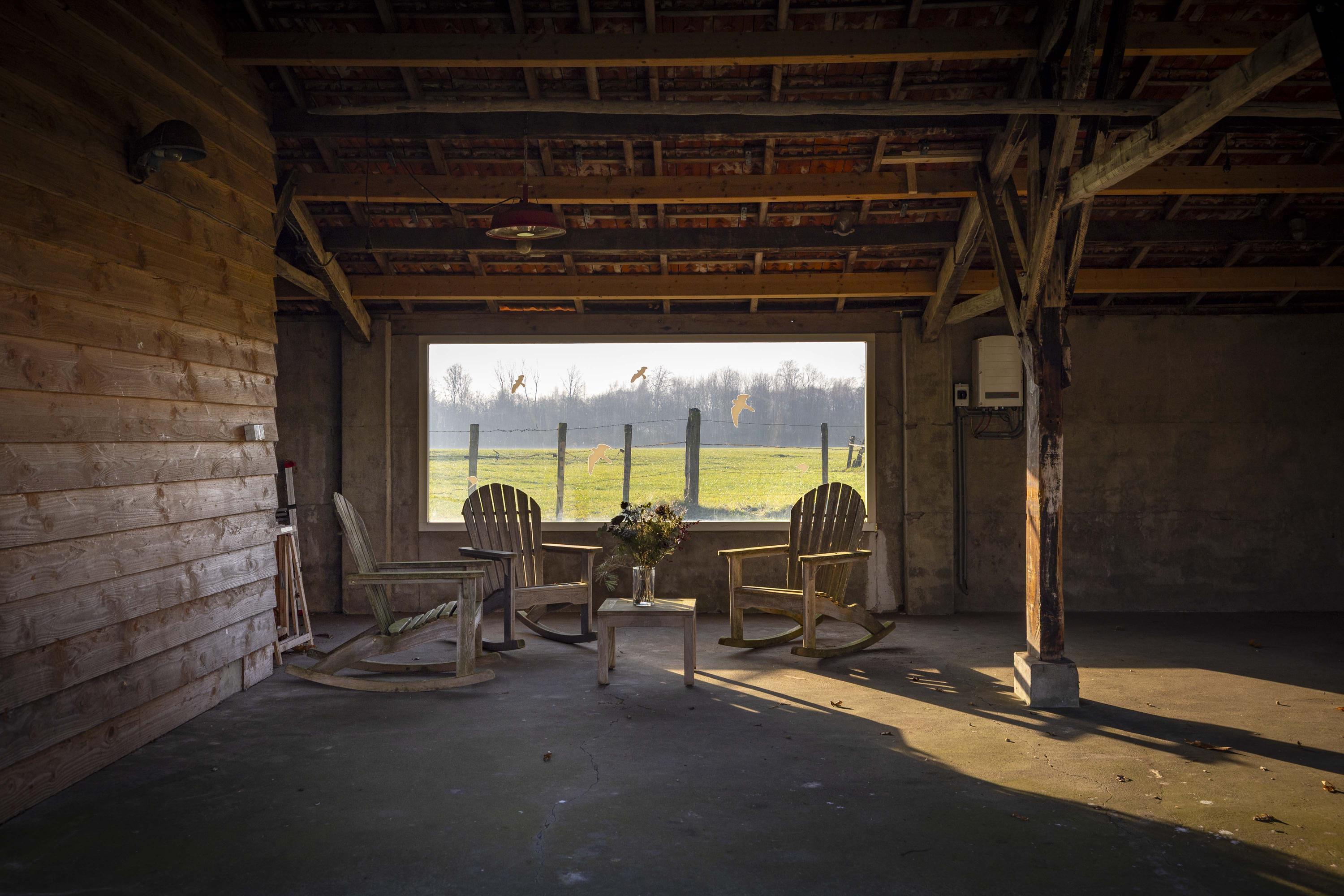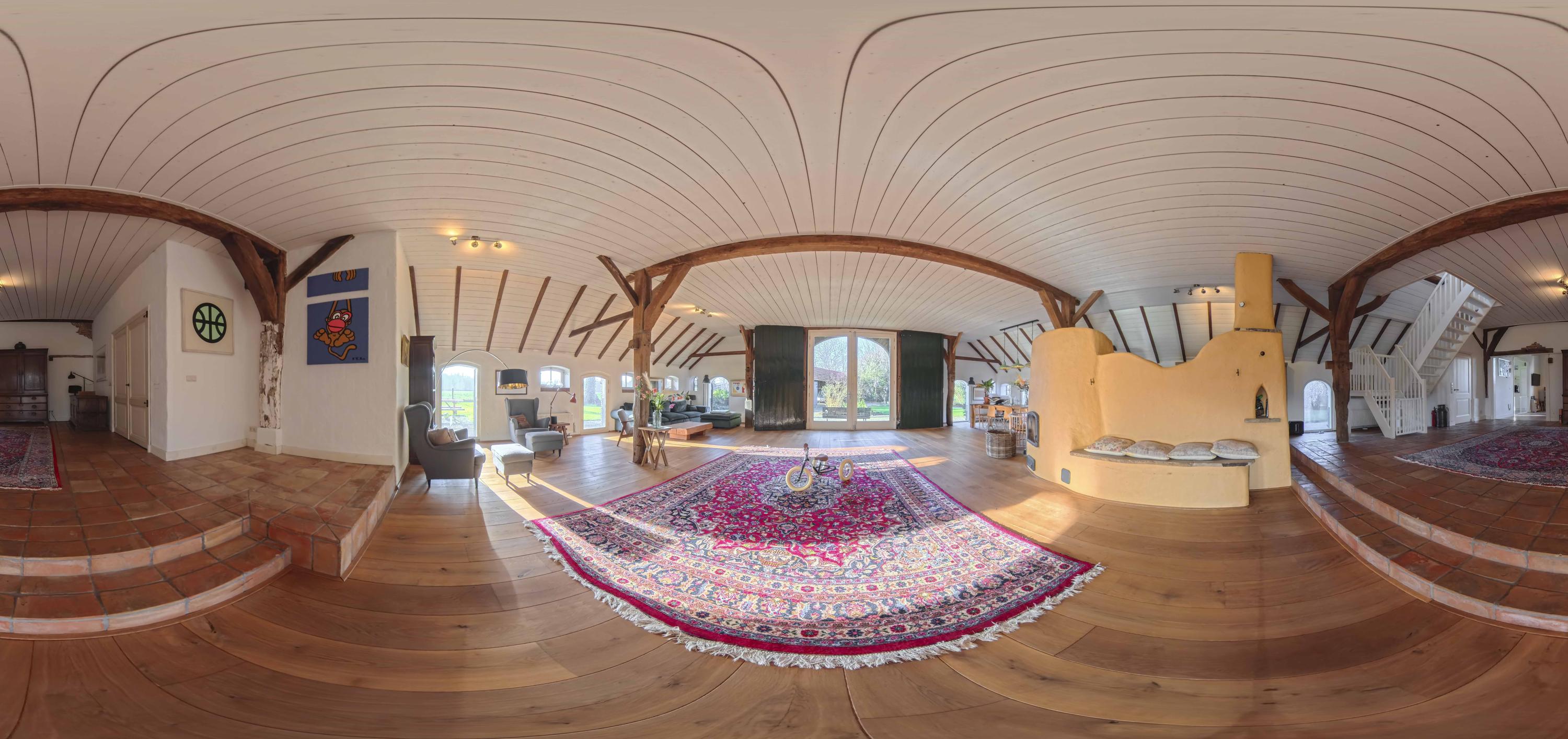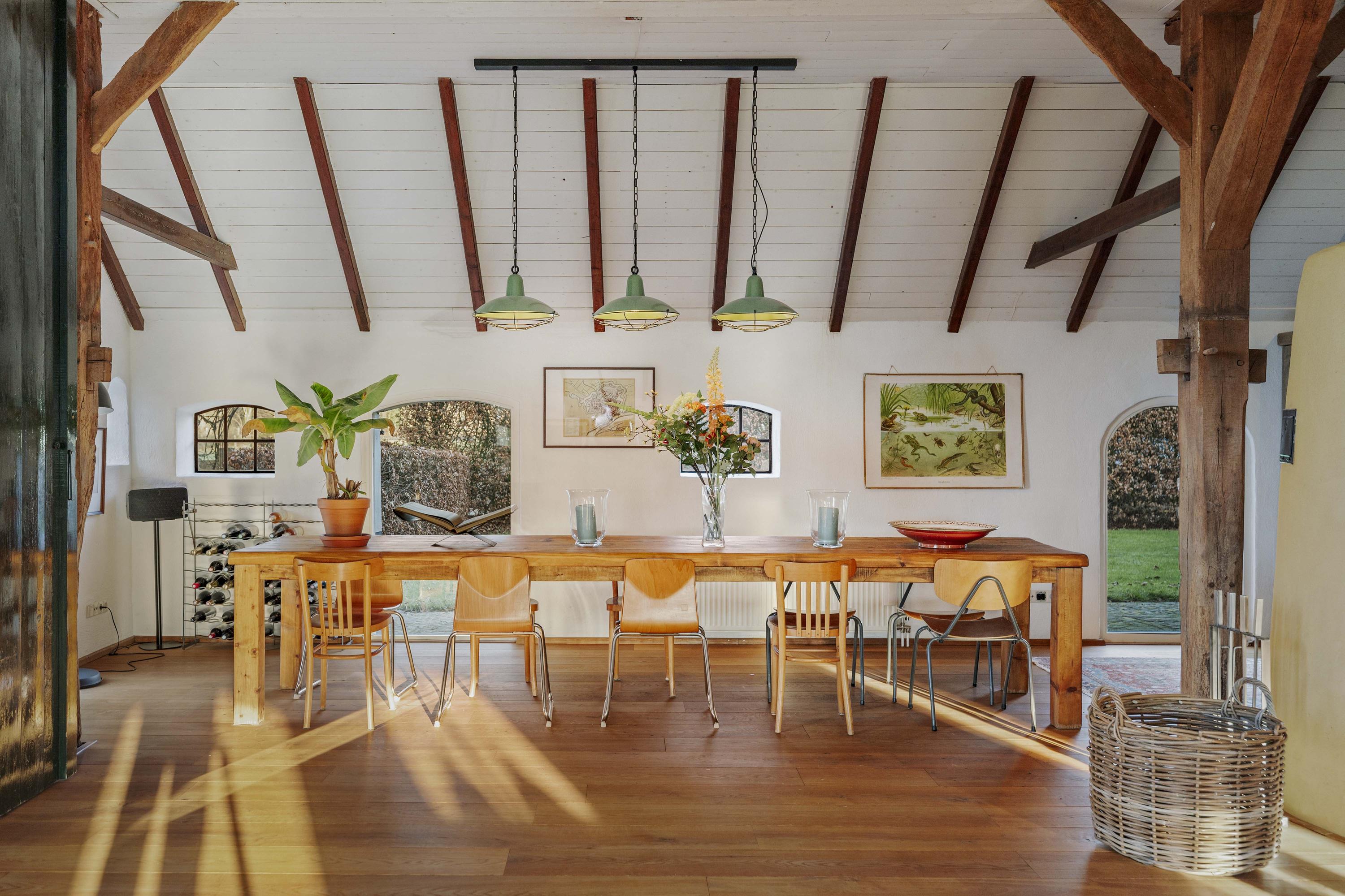 De deel is een fantastische ruimte: dik 150 m² aan woonoppervlak, boordevol sfeer en landelijke charme. Op de vloer ligt een eiken planken vloer en de oude gebinten staan nog fier in de kamer. In het hart van de ruimte staat een schitterende leemkachel. Deze kachels zijn geliefd om hun efficiënte manier van verwarmen, want naast dat ze de living op temperatuur houden, wordt ook het water verwarmd. De deeldeuren – de opening is nu ingevuld met glas - zijn aan de binnenzijde teruggeplaatst en herinneren aan de voormalige functie van de deel, want hier stonden de koeien.