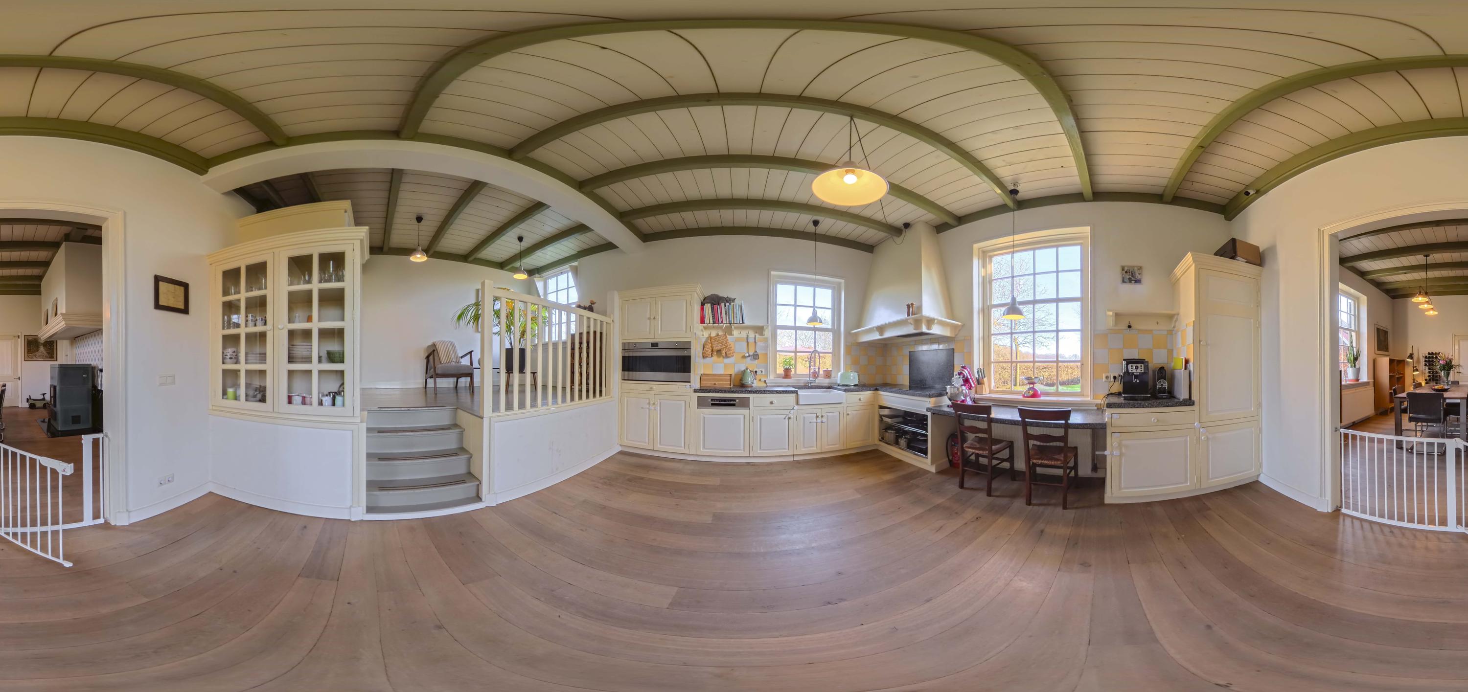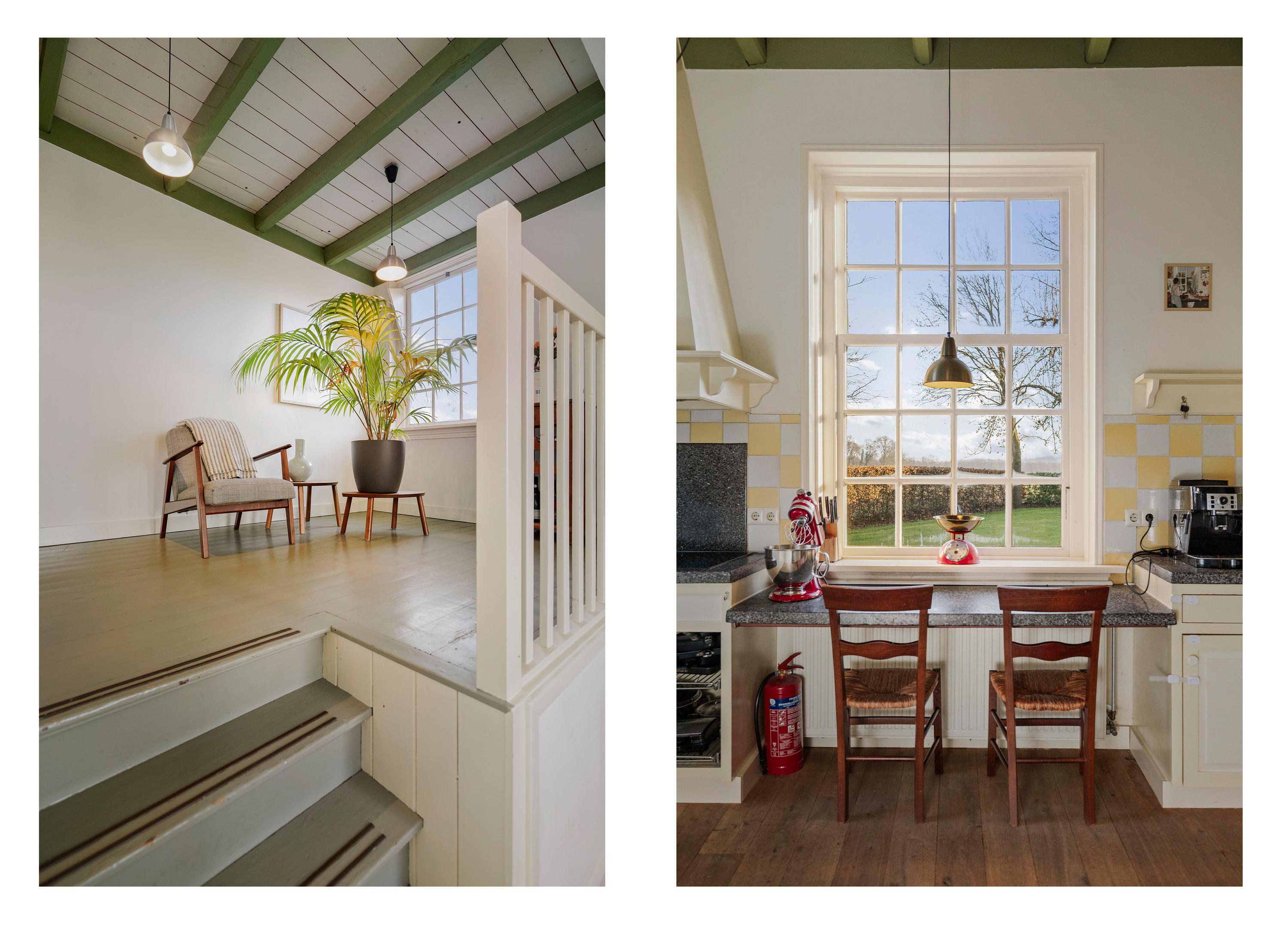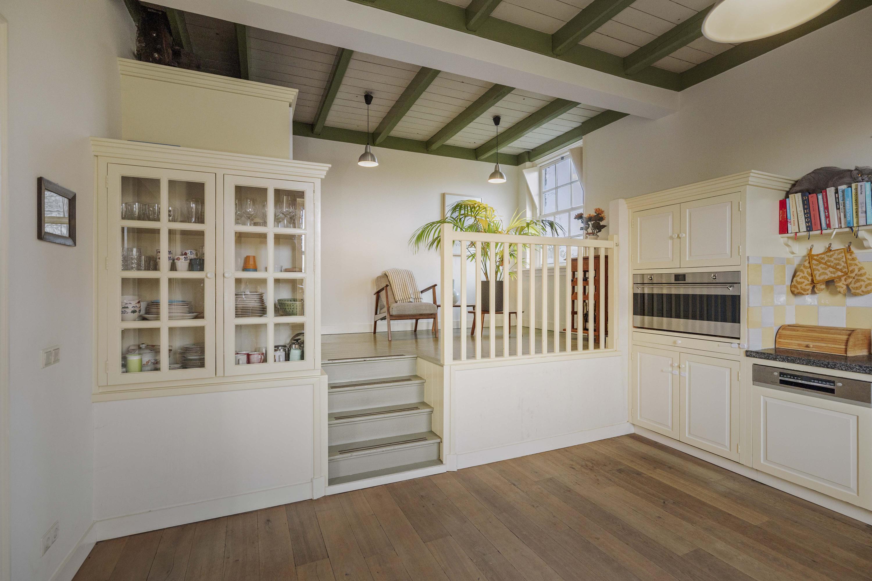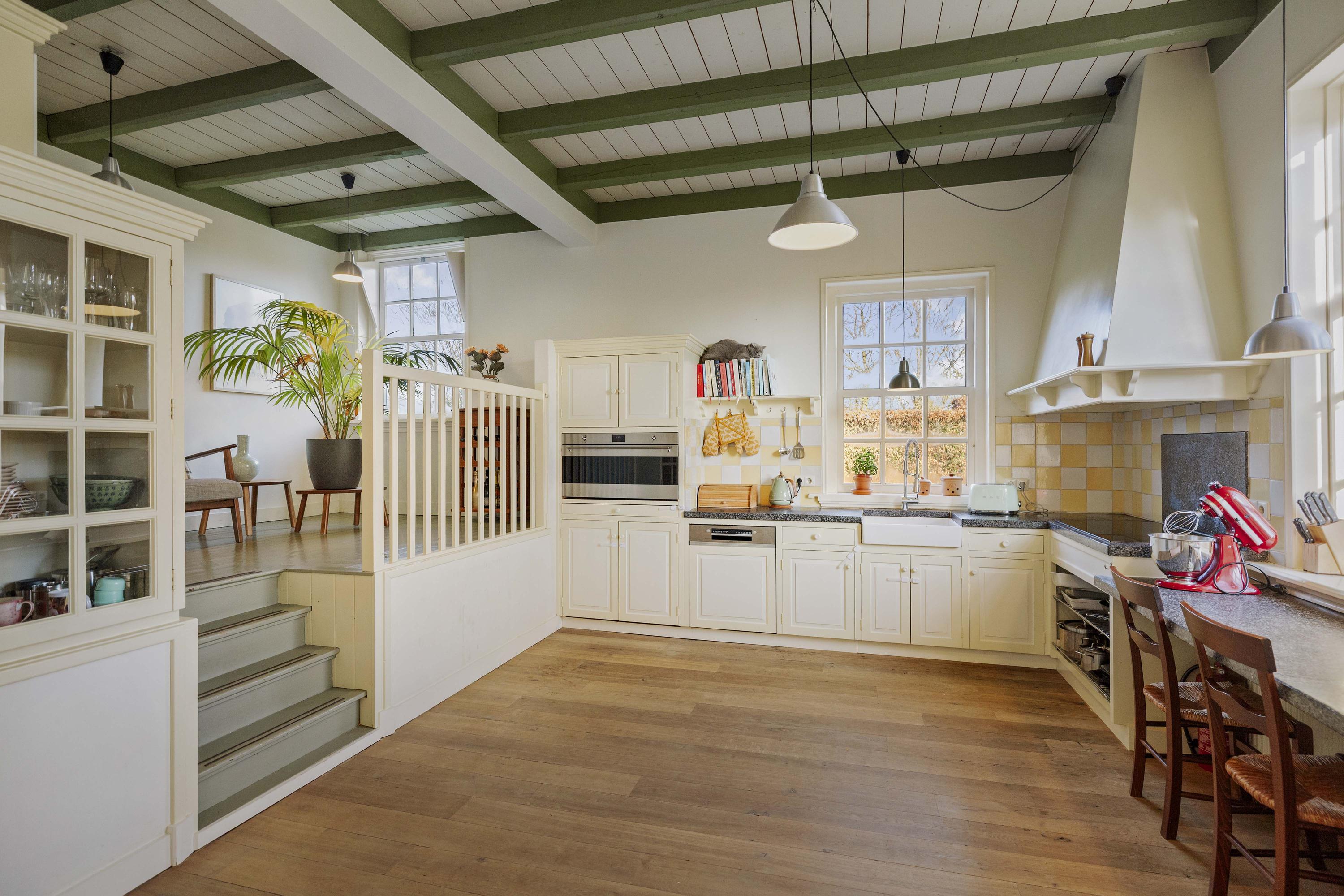 De keuken, met knusse opkamer, strookt qua look-and-feel helemaal met de nostalgie die het huis ademt, maar is verrassend modern en van alle gemakken voorzien; een keuken voor fijnproevers! De keuken is uitgerust met crèmekleurige fronten – er is hier veel bergruimte - en een werkblad van gezoete hardsteen. Koken gebeurt hier op de extra brede inductieplaat, en ook qua inbouwapparatuur is het piekfijn voor elkaar, met een koelvriescombinatie, een extra brede heteluchtoven (90 cm, SMEG) en een afwasmachine (Bosch). Onder de opkamer bevindt zich de tweede voorraadkelder.