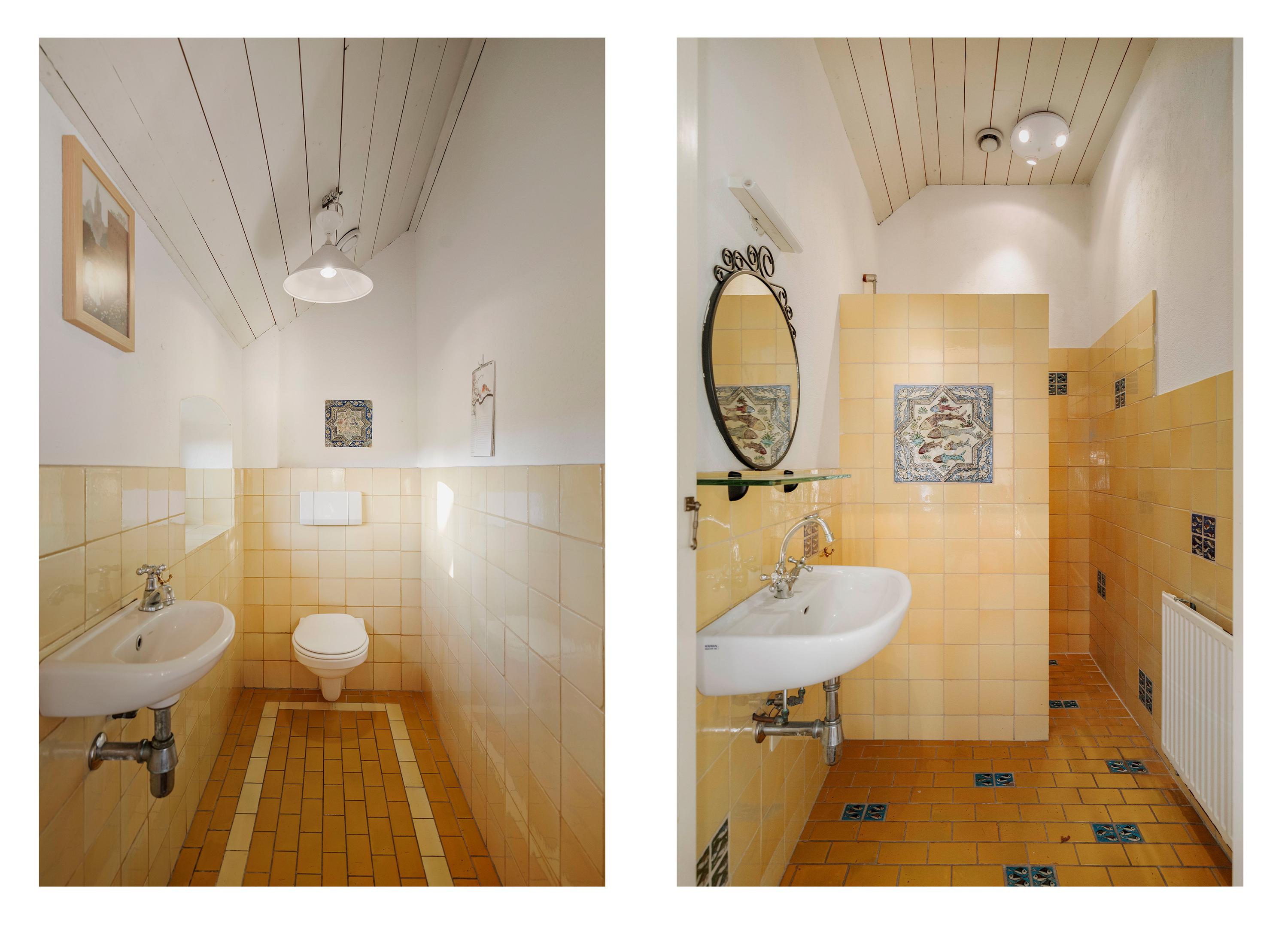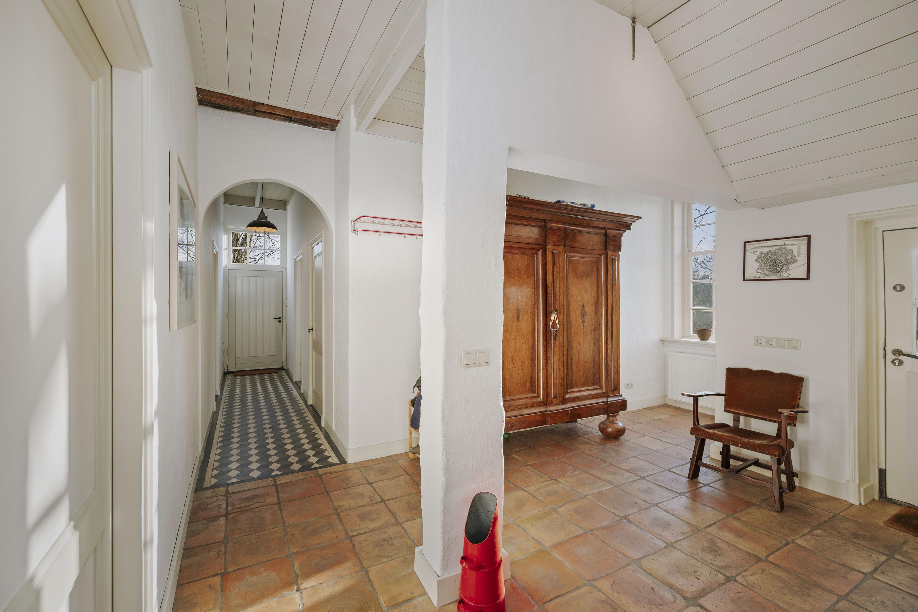 De met grind verharde oprit brengt ons bij de deel. In de Achterhoek is het een goed gebruik om ‘achterom’ binnen te komen en aan de achterzijde van het huis, met de indrukwekkende vergezichten over de belenende landerijen, bevindt zich de entree. In het programma is de klassieke indeling bewaard gebleven, want ook aan de voorzijde bevindt zich de traditionele voordeur. De hal, met de hoge plafonds, is zonnig en royaal, en op de vloer liggen de traditionele estrikken, die zo typerend zijn voor deze streek. De formele hal is voorzien van zwart-witte siertegels en het geheel wordt fraai gecontrasteerd door de friswitte wanden en het roomkleurige houtwerk. In de hal is er toegang tot de WC en de badkamer op de begane grond, de eetkamer, de kelder en de opkamer die nu in gebruik is als kantoor met pantry, maar die ook perfect dienstdoet als gastenkamer.