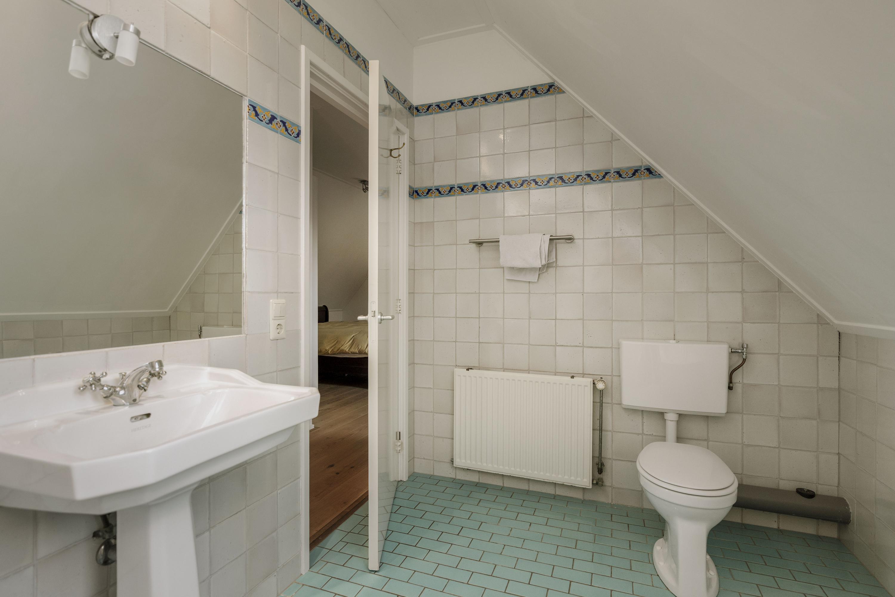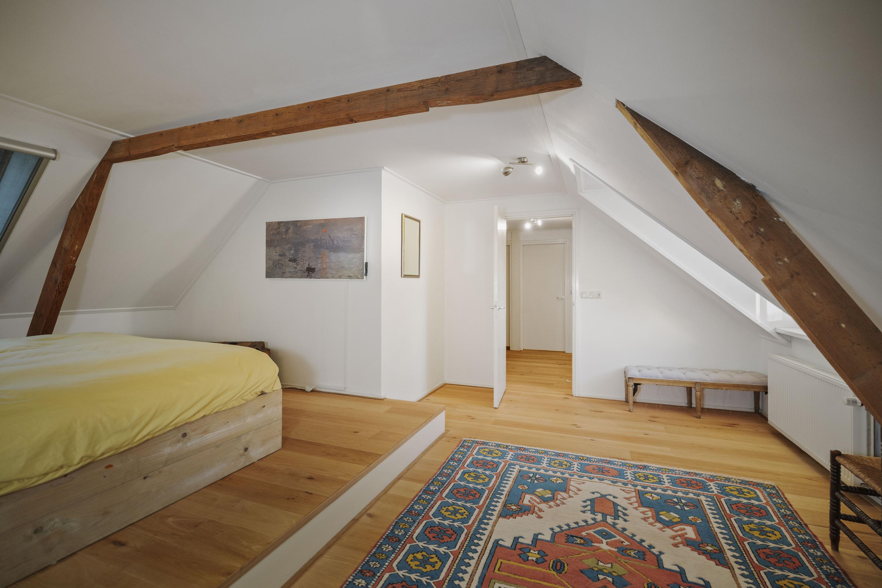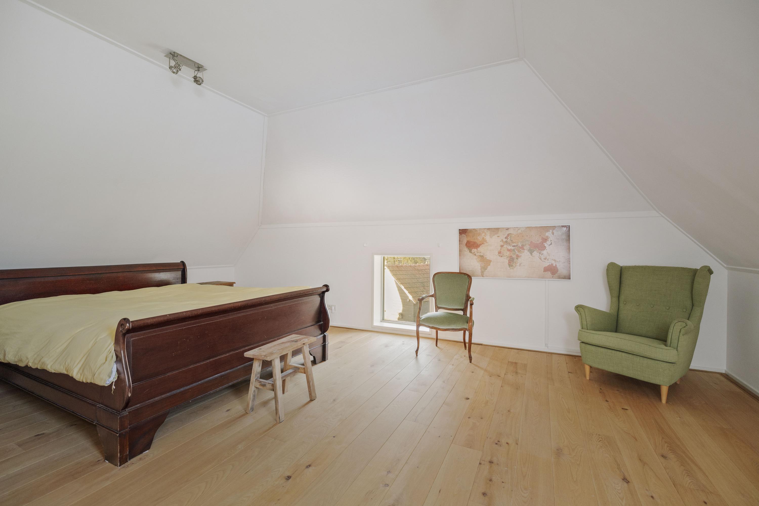 Aan de royale en zonnige overloop, met op de vloer een rood eiken planken vloer, grenzen vijf ruime slaapkamers. De ouderkamer beschikt over een eigen badkamer met inloopdouche, WC en wastafel. In het voorhuis bevindt zich tevens de waskamer/ technische ruimte, met de aansluitingen voor de wasmachine en -droger, de ketel en het buffervat en een boiler van 120 liter, alsmede een praktische berging. Hier is tevens de tweede badkamer, met dubbele wastafels, een ruime inloopdouche en een WC.