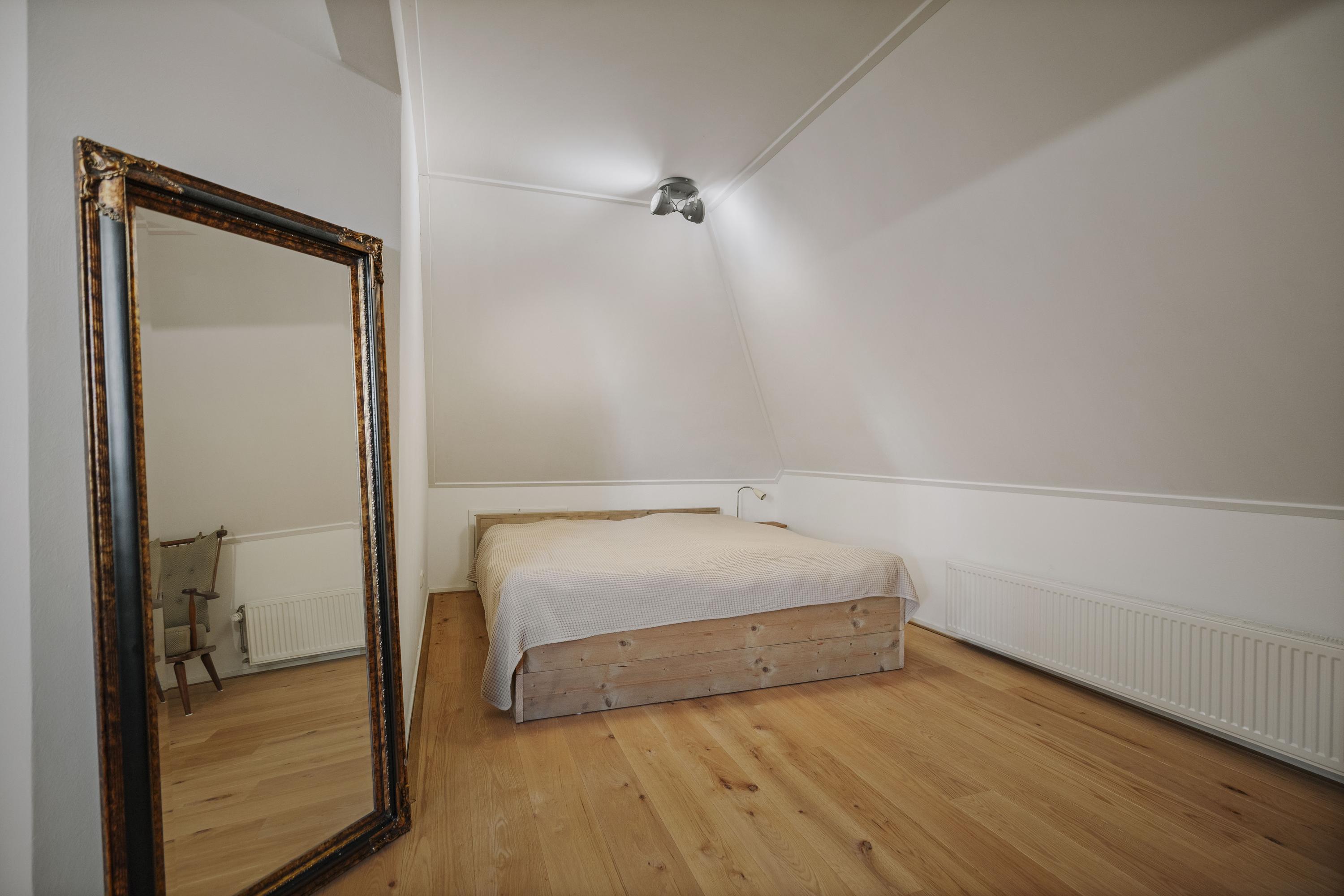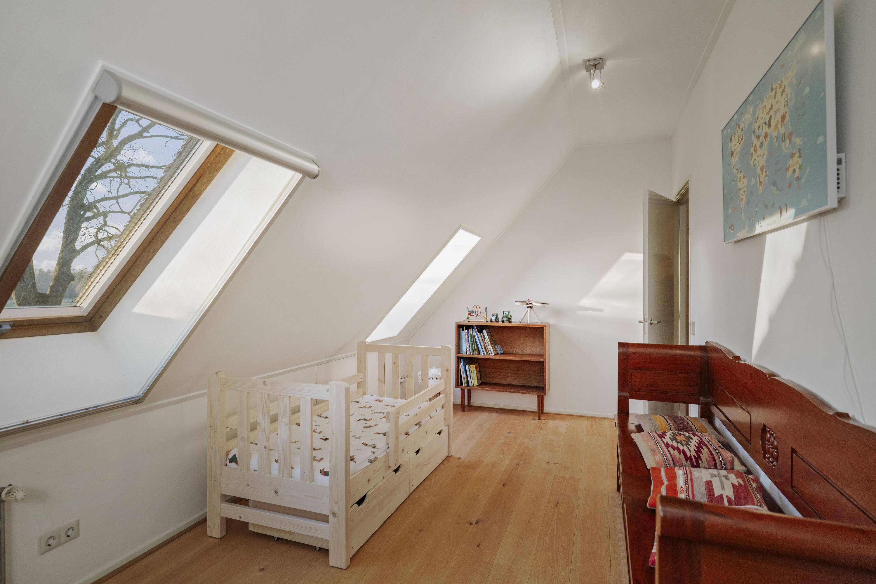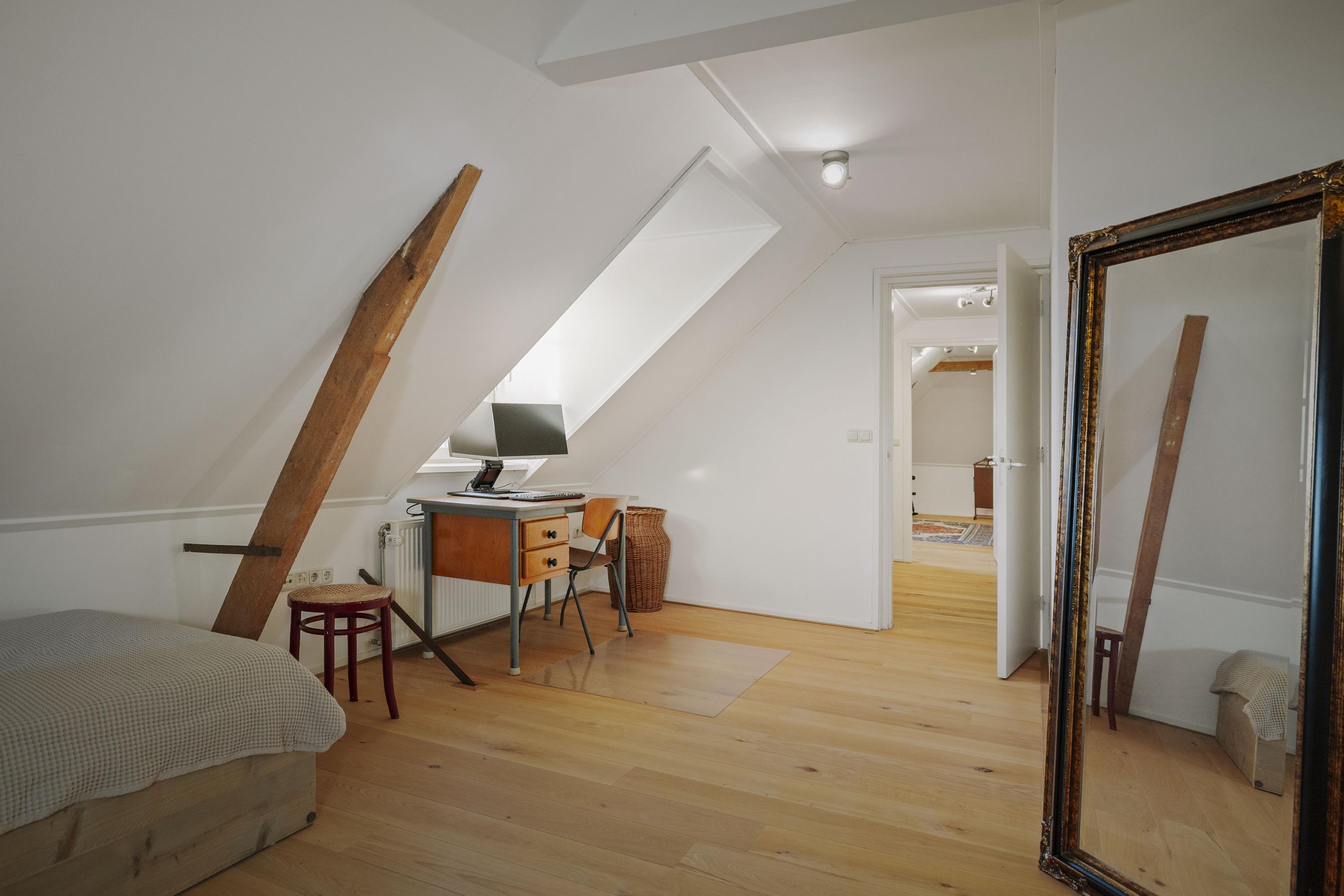 Aan de royale en zonnige overloop, met op de vloer een rood eiken planken vloer, grenzen vijf ruime slaapkamers. De ouderkamer beschikt over een eigen badkamer met inloopdouche, WC en wastafel. In het voorhuis bevindt zich tevens de waskamer/ technische ruimte, met de aansluitingen voor de wasmachine en -droger, de ketel en het buffervat en een boiler van 120 liter, alsmede een praktische berging. Hier is tevens de tweede badkamer, met dubbele wastafels, een ruime inloopdouche en een WC.