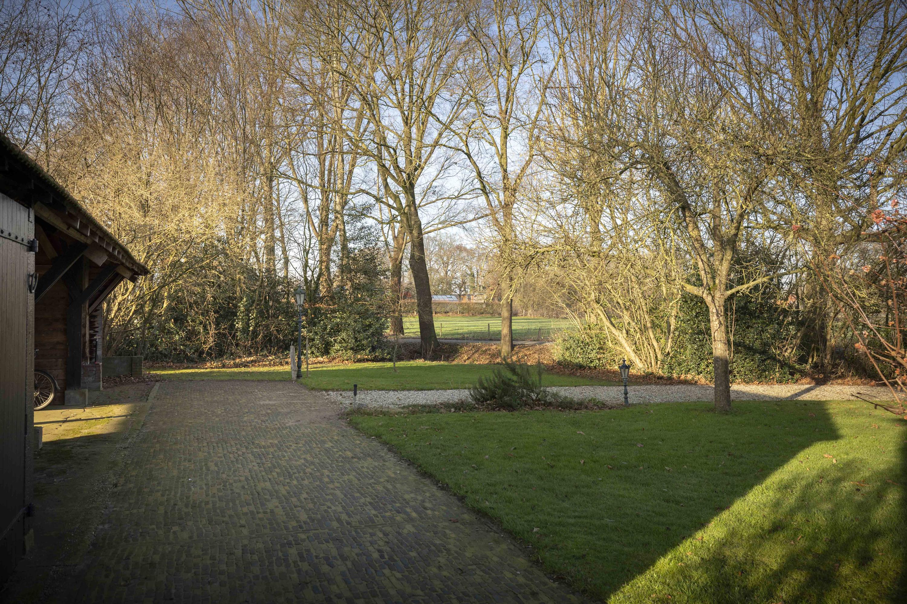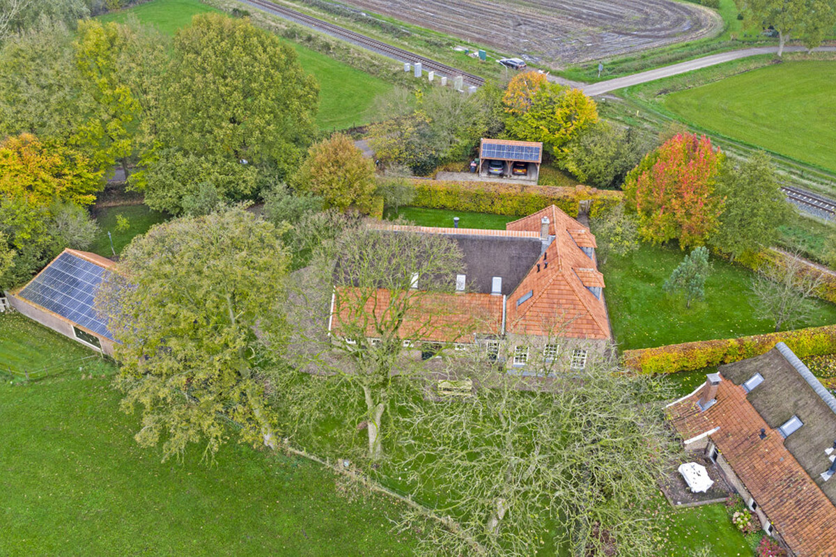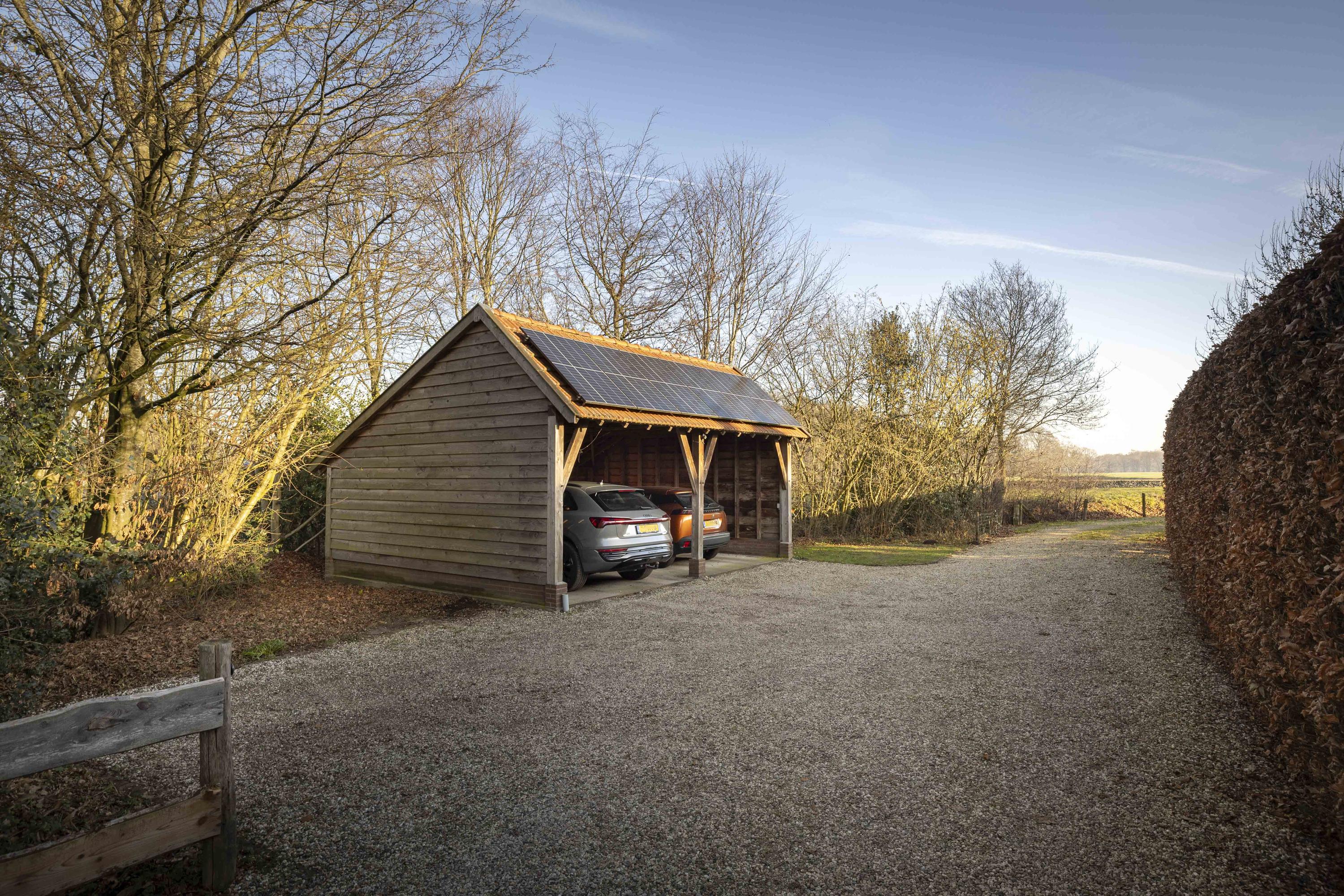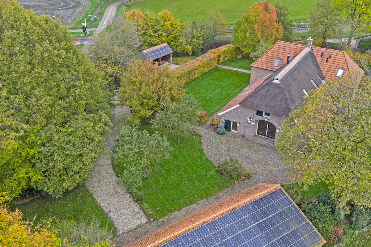 Het huis wordt omringd door een beeldige tuin. Er is een schuur met carport en aan de achterkant een afsluitbare tuingereedschapsberging (met op het dak 39 zonnepanelen - mooi uit het zicht), dus de auto’s staan droog, evenals de tuinspullen. Daarnaast is er een tweede houten bijgebouw (met op het dak 6 zonnepanelen) aanwezig, uitgevoerd in een landelijke stijl met potdekselwerk, Oud-Hollandse dakpannen en robuuste gebinten. Het bijgebouw biedt ruimte aan het parkeren van twee auto’s. Door de oriëntatie van het huis ligt er achter de woning een fijn zonneterras. Zowel aan de voor- als achterzijde zijn er grote gazons en de privacy wordt gewaarborgd door de manshoge beukenhagen.