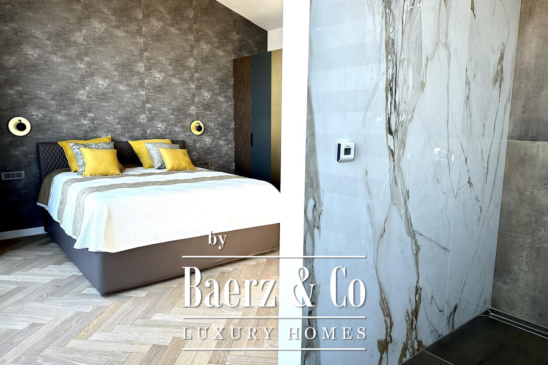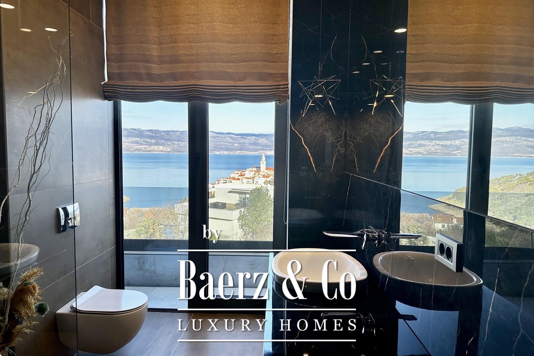 Boven bevinden zich drie slaapkamers, elk met een eigen badkamer, die privacy bieden en een harmonieus geheel vormen. Het ontwerp benadrukt openheid, met zichtlijnen naar de natuurlijke omgeving en het kalme blauw van de zee. Deze villa in Vrbnik, met haar oriëntatie en de soepele overgang tussen ruimtes, weerspiegelt een moderne mediterrane levensstijl, gedragen door licht, lucht en materiaalzuiverheid. Het tempo hier is onthaast, bepaald door verbinding met de omgeving en diep comfort.