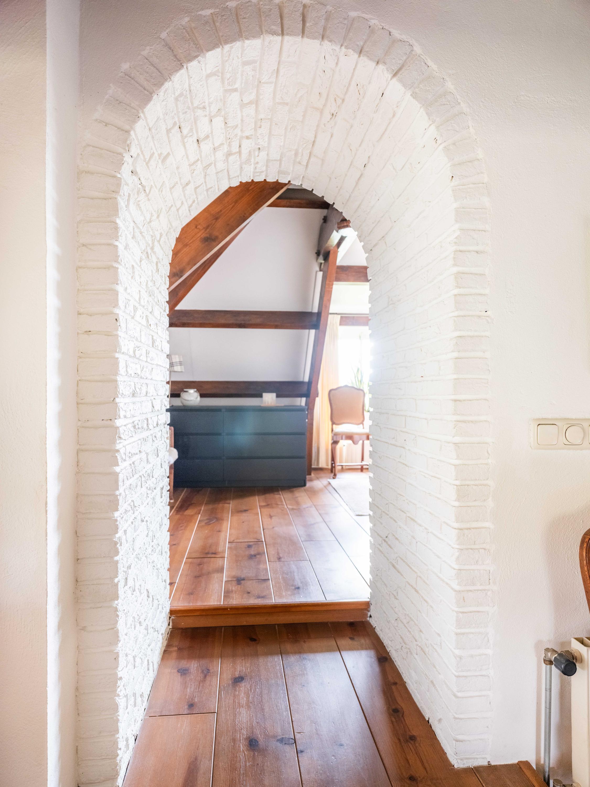 De trap leidt naar een ruime open vide met zicht op de keuken beneden. Deze ruimte doet momenteel dienst als werk- en logeerruimte en biedt uitzicht op de tuin. Via de open doorgang bereik je de royale slaapkamer met een adembenemend uitzicht over de tuin, het water en de uitgestrekte weilanden.
