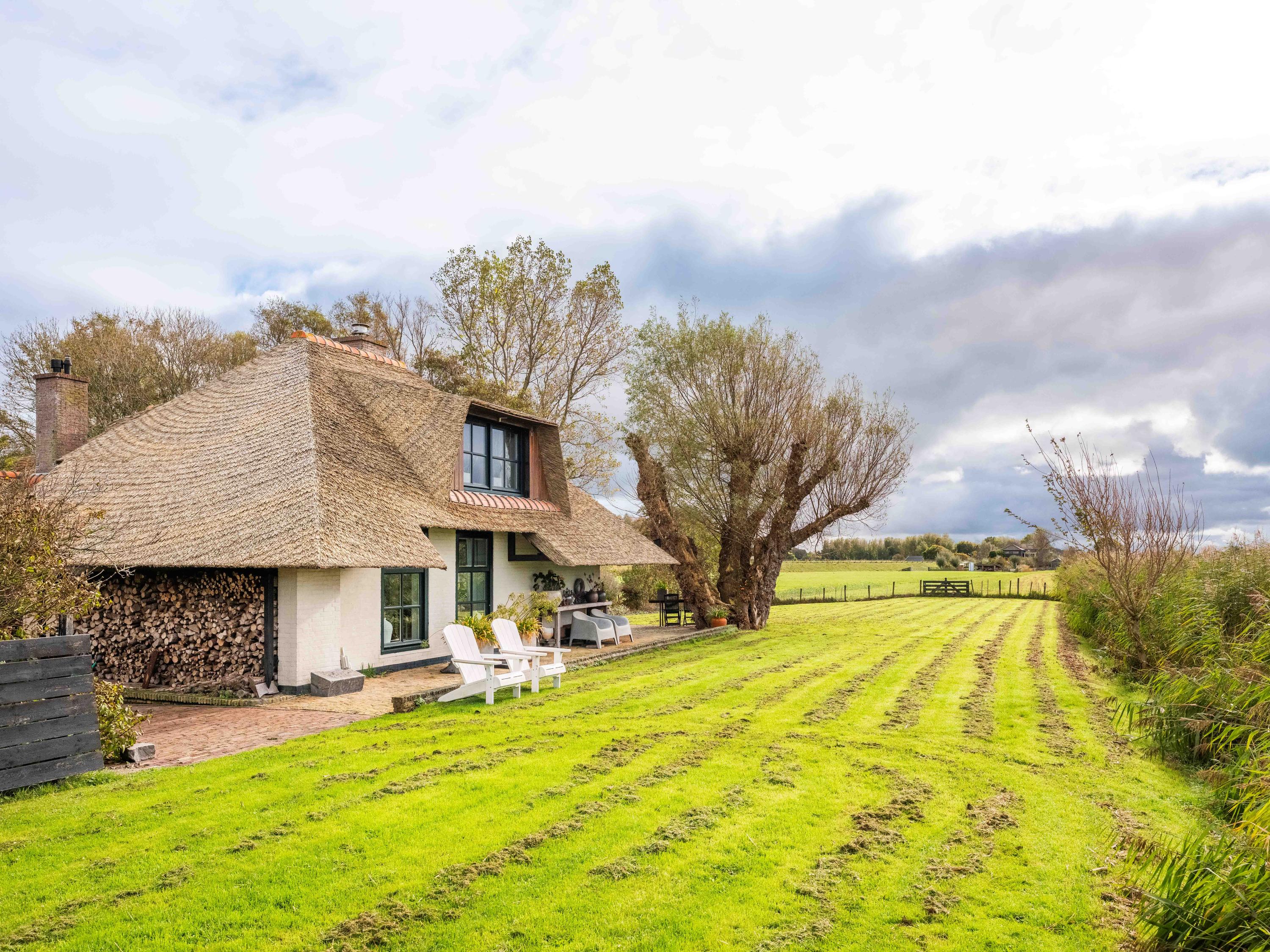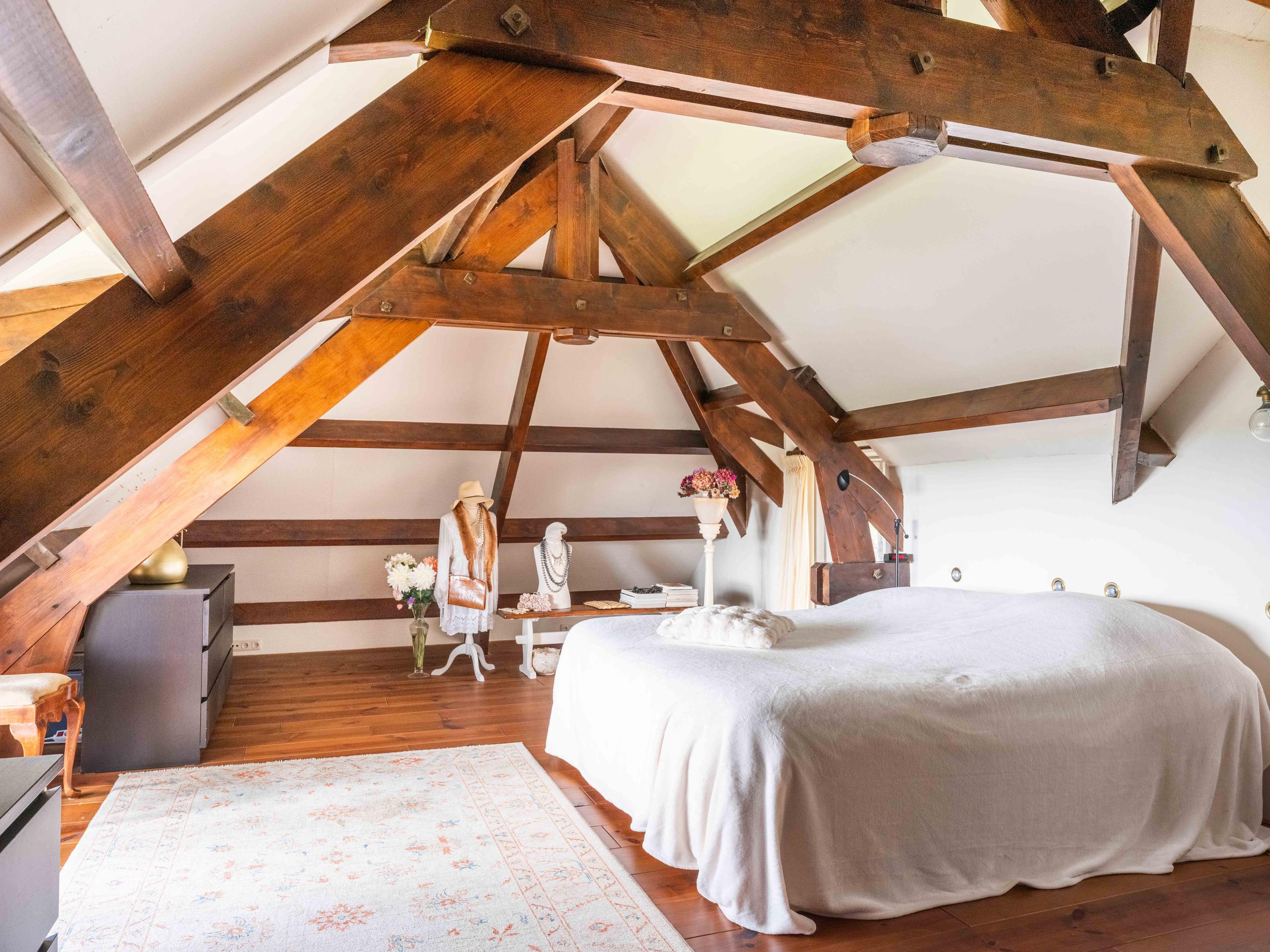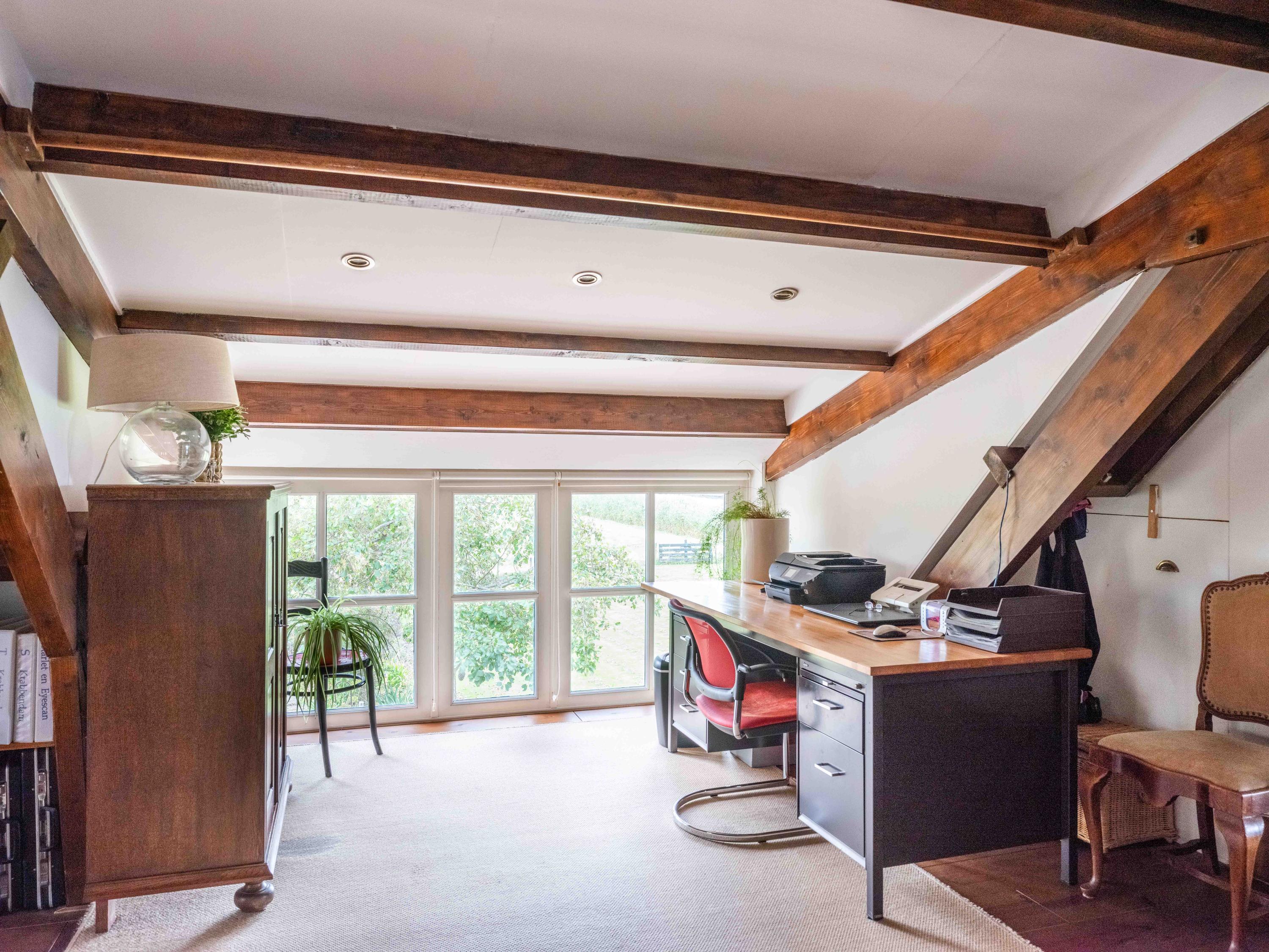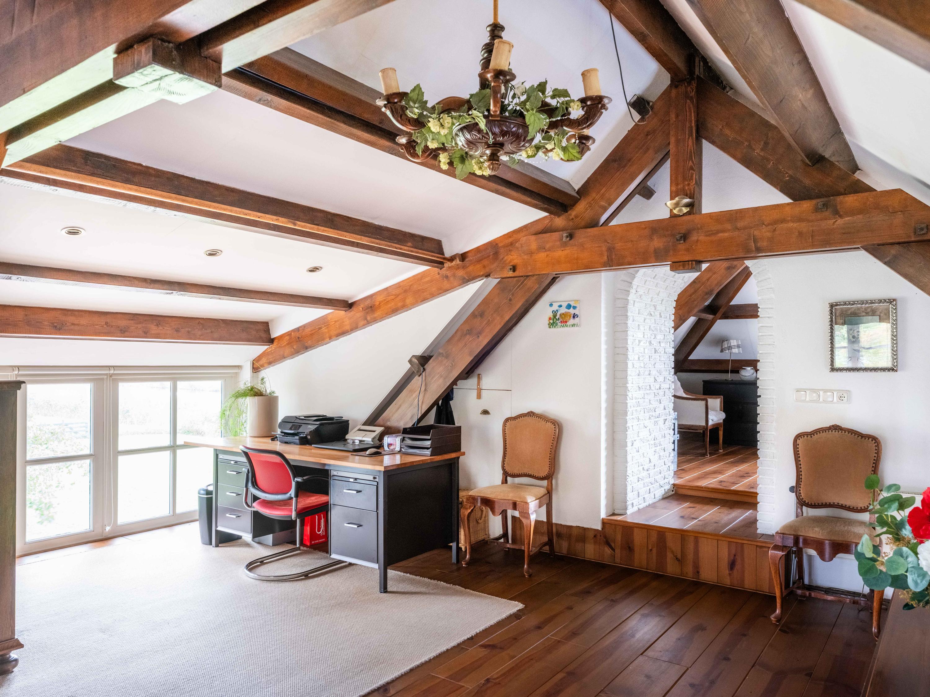 De trap leidt naar een ruime open vide met zicht op de keuken beneden. Deze ruimte doet momenteel dienst als werk- en logeerruimte en heeft uitzicht op de tuin rondom. Via de open doorgang bereik je de royale slaapkamer met een adembenemend uitzicht over de tuin, het water en de uitgestrekte weilanden.