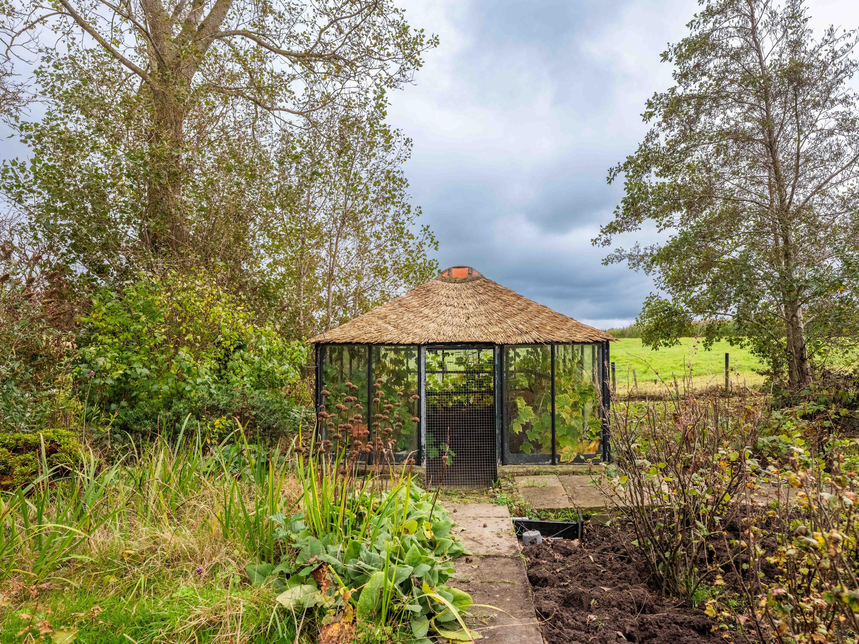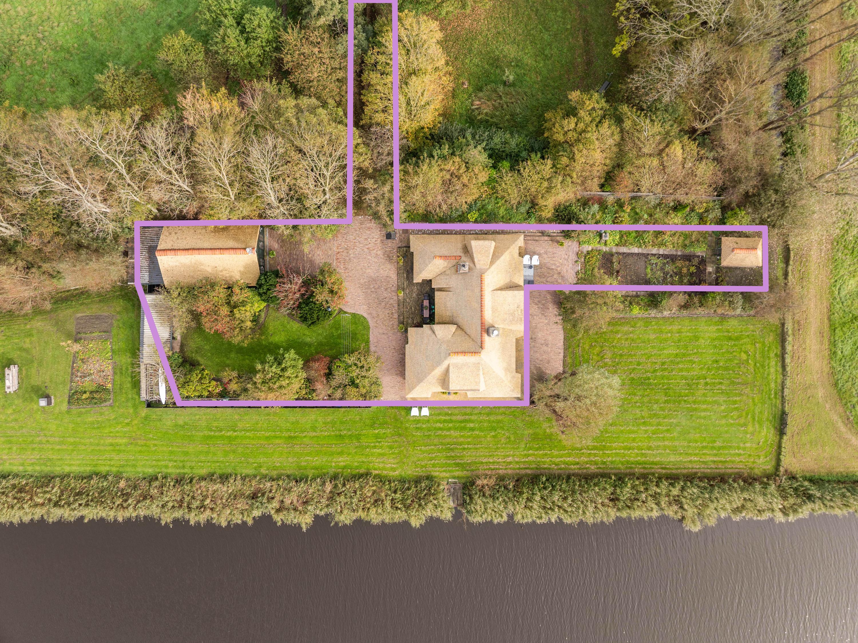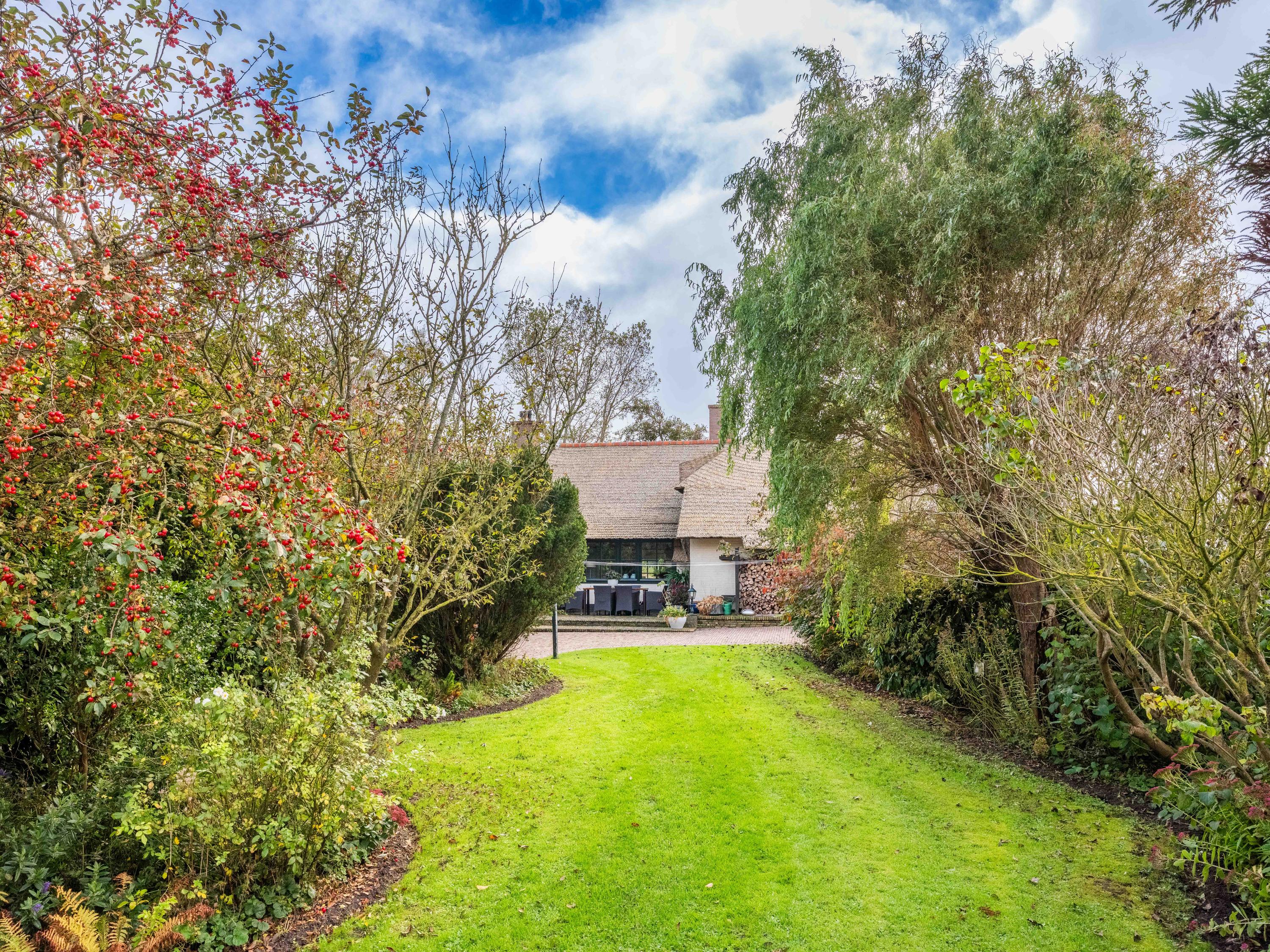 De tuin zelf ademt rust en natuur: een groene oase met meerdere terrassen, fruitbomen, moestuin en een steiger aan het water, een heerlijke plek om te ontspannen en te genieten van de stilte en het weidse uitzicht.