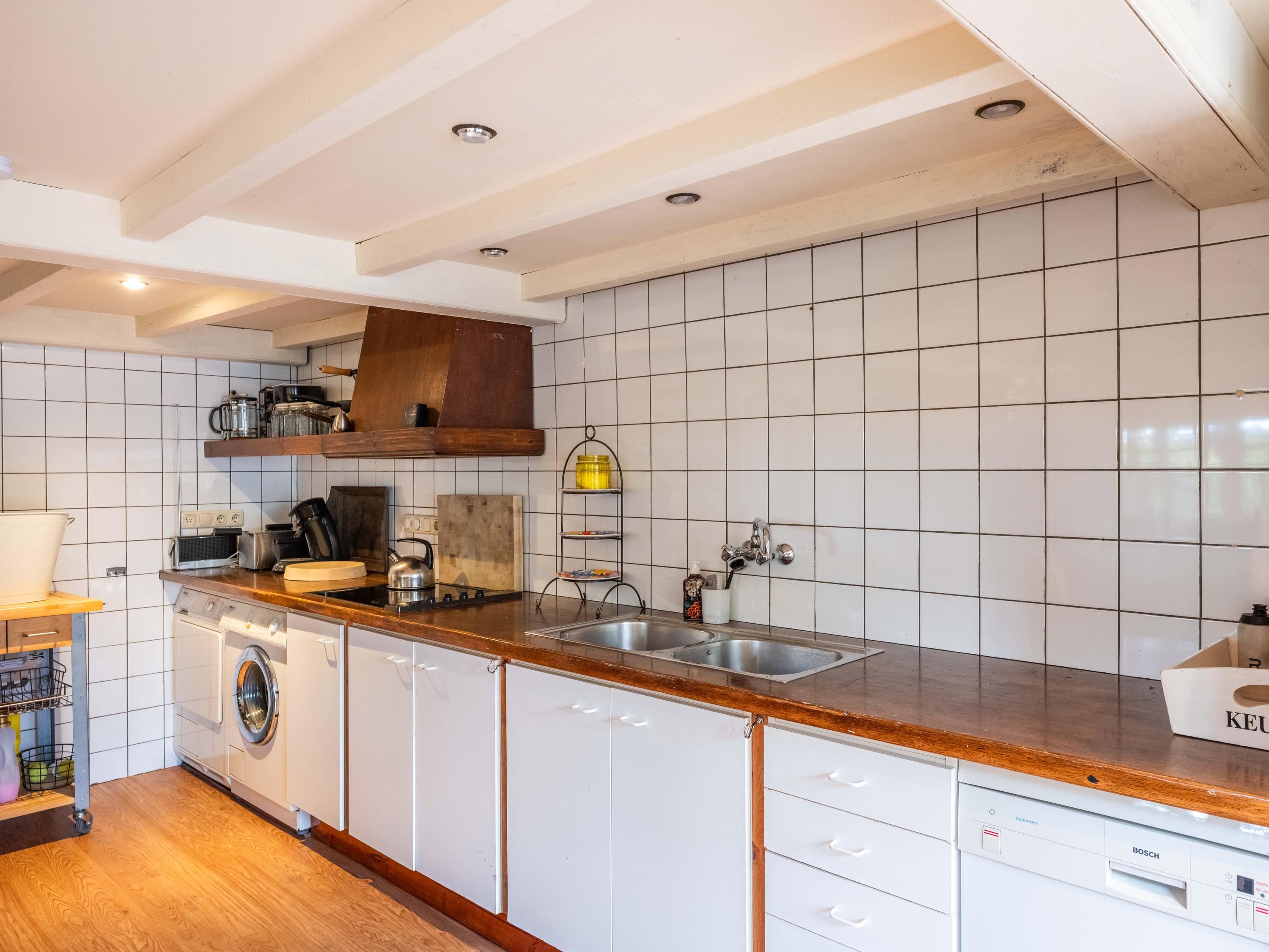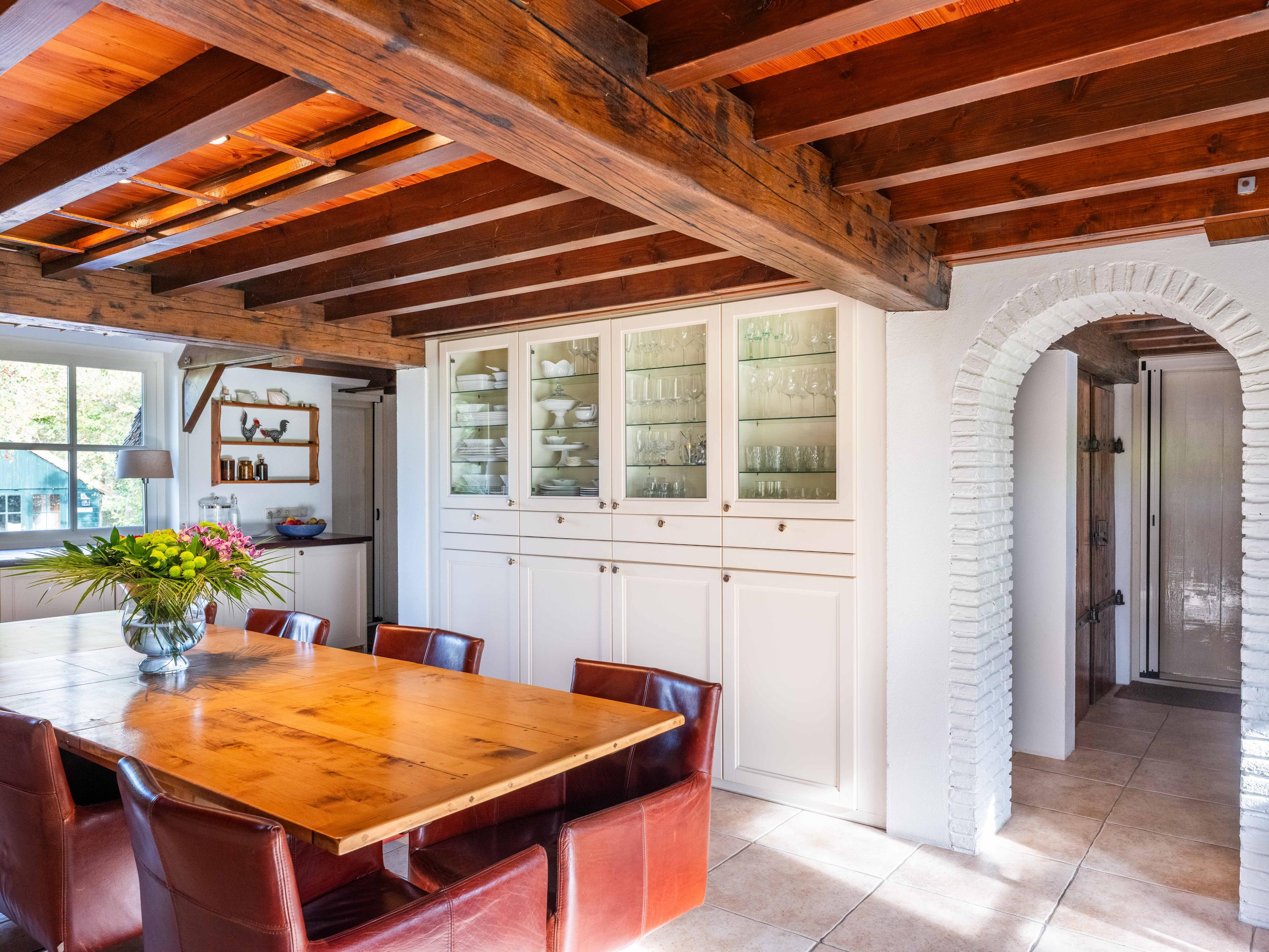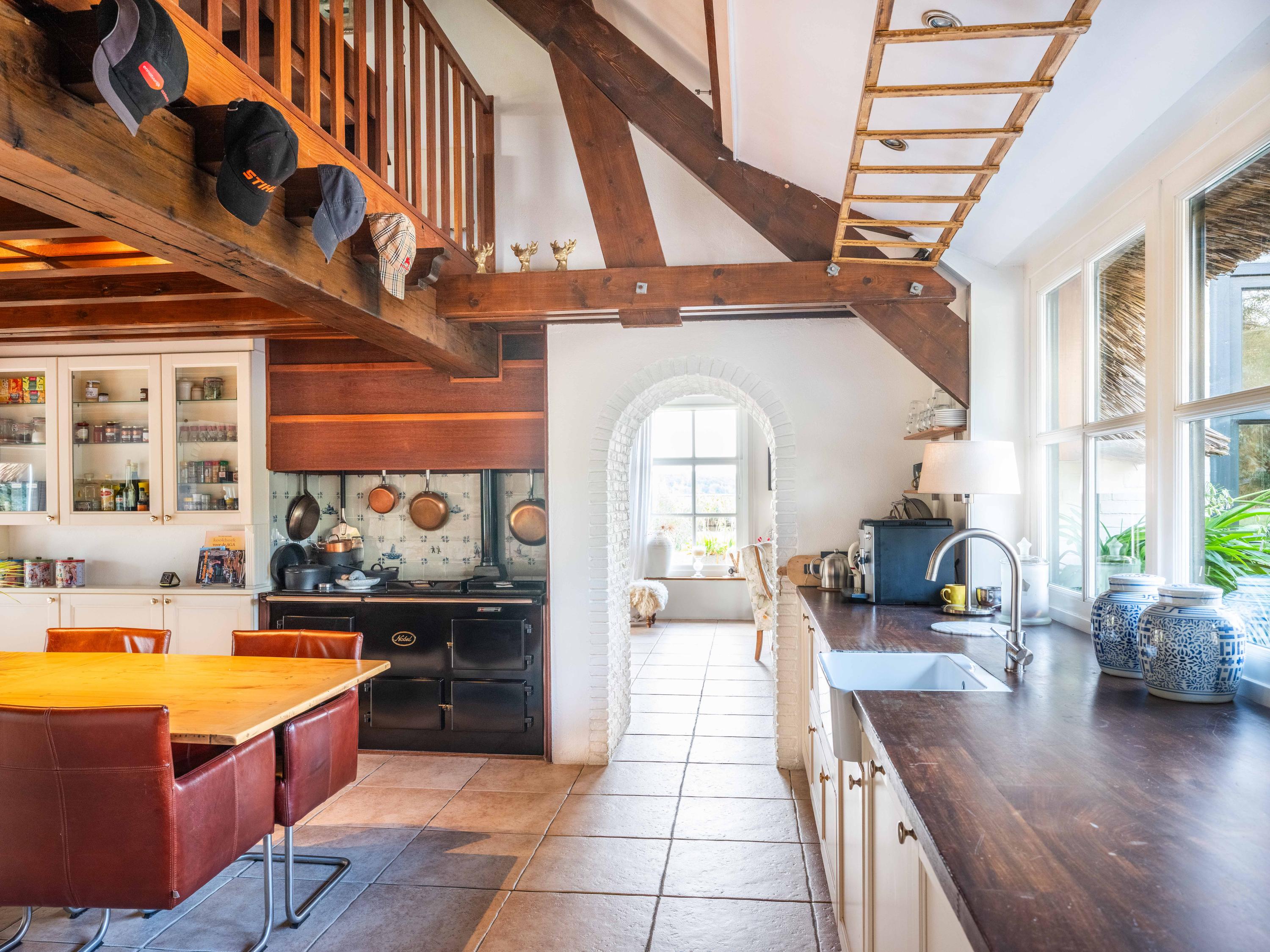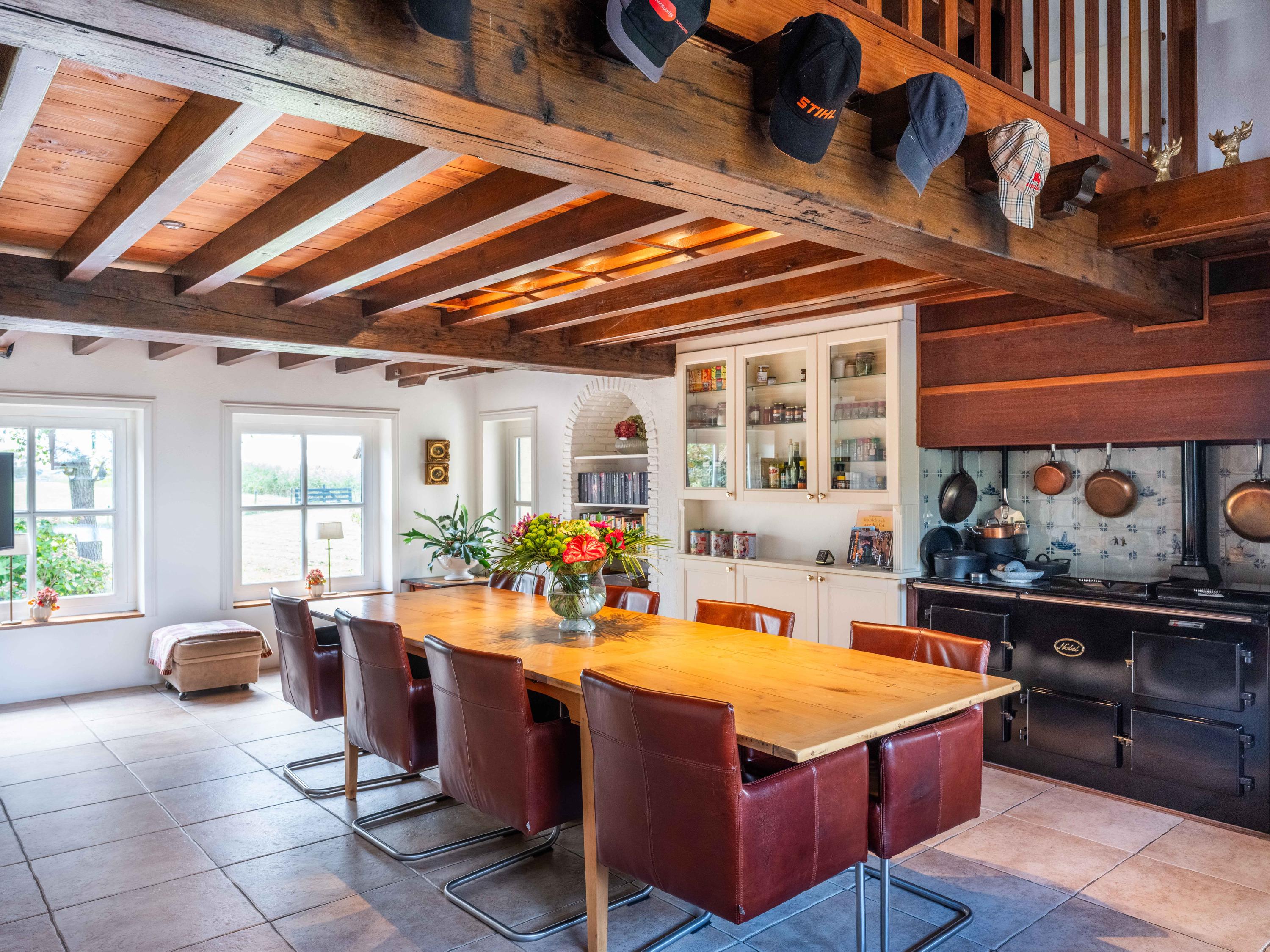 Via de hal met garderoberuimte en bergkast bereik je het toilet met fonteintje en de trap naar de eerste verdieping. Vanuit de hal stap je direct door naar de gezellige eetruimte met open keuken. De grote ramen bieden een prachtig zicht op de groene tuin rondom. De landelijke keuken is voorzien van vaste kasten en volop bergruimte. Vanuit hier is er tevens toegang tot de ruime kelder, ideaal voor voorraad of als wijnkelder. De royale woonkeuken vormt het hart van het huis, met authentieke details zoals een Engelse fornuis met vier ovens en karakteristieke balkenplafonds.