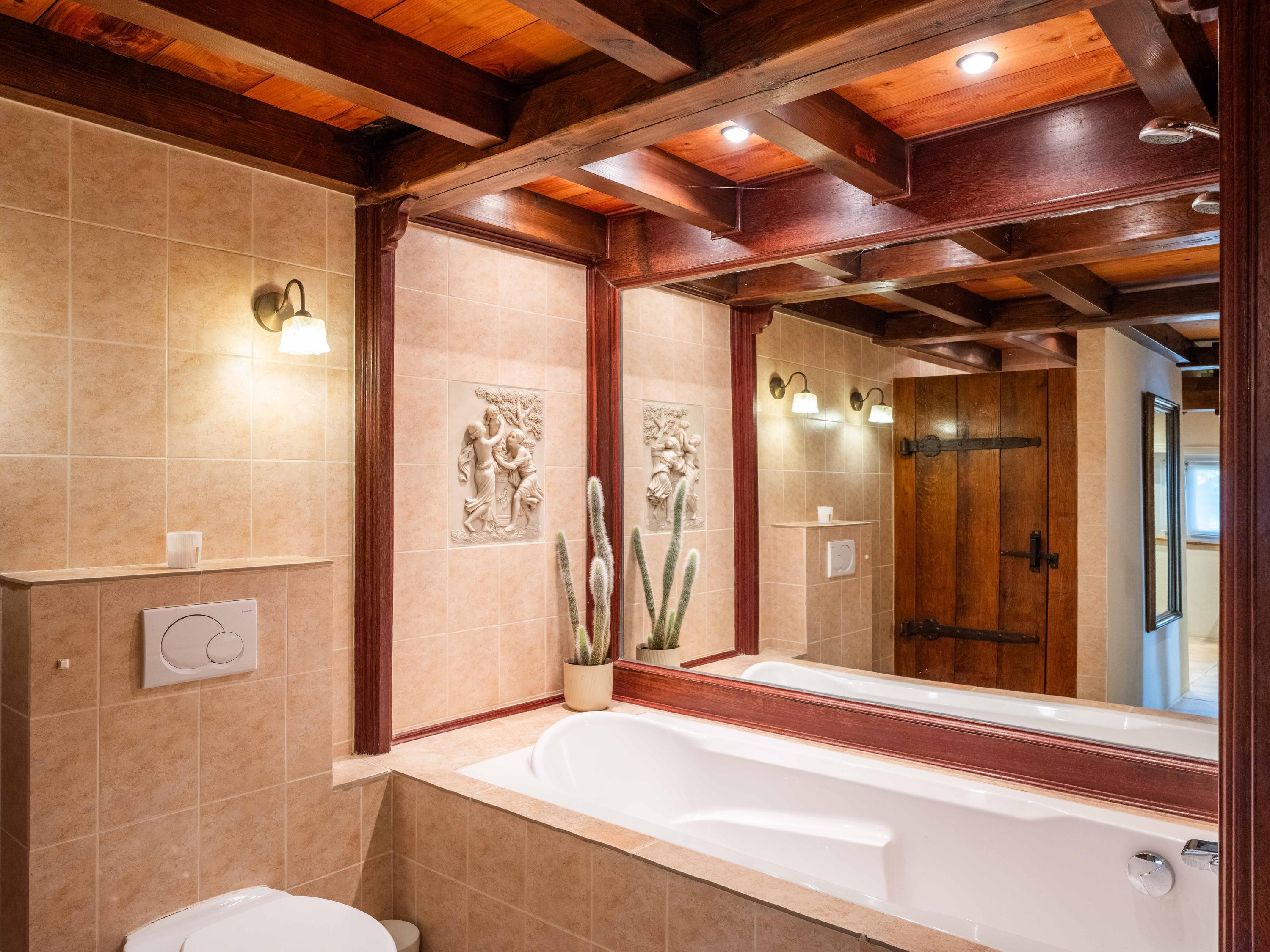 Aangrenzend aan de keuken bevindt zich de luxe badkamer, uitgerust met een ligbad, inloopdouche, toilet en dubbele wastafel. Tegenover de badkamer is een ruimte gelegen met kastruimte voor leg- en hangkleding. Daarnaast loopt de keuken aan de andere zijde over in de sfeervolle zitkamer, waar het vele licht en het uitzicht op het water direct opvallen. Deze ruimte is ruim en erg gezellig, mede door de houtkachel die voor warmte en sfeer zorgt. De gehele benedenverdieping is voorzien van comfortabele vloerverwarming.