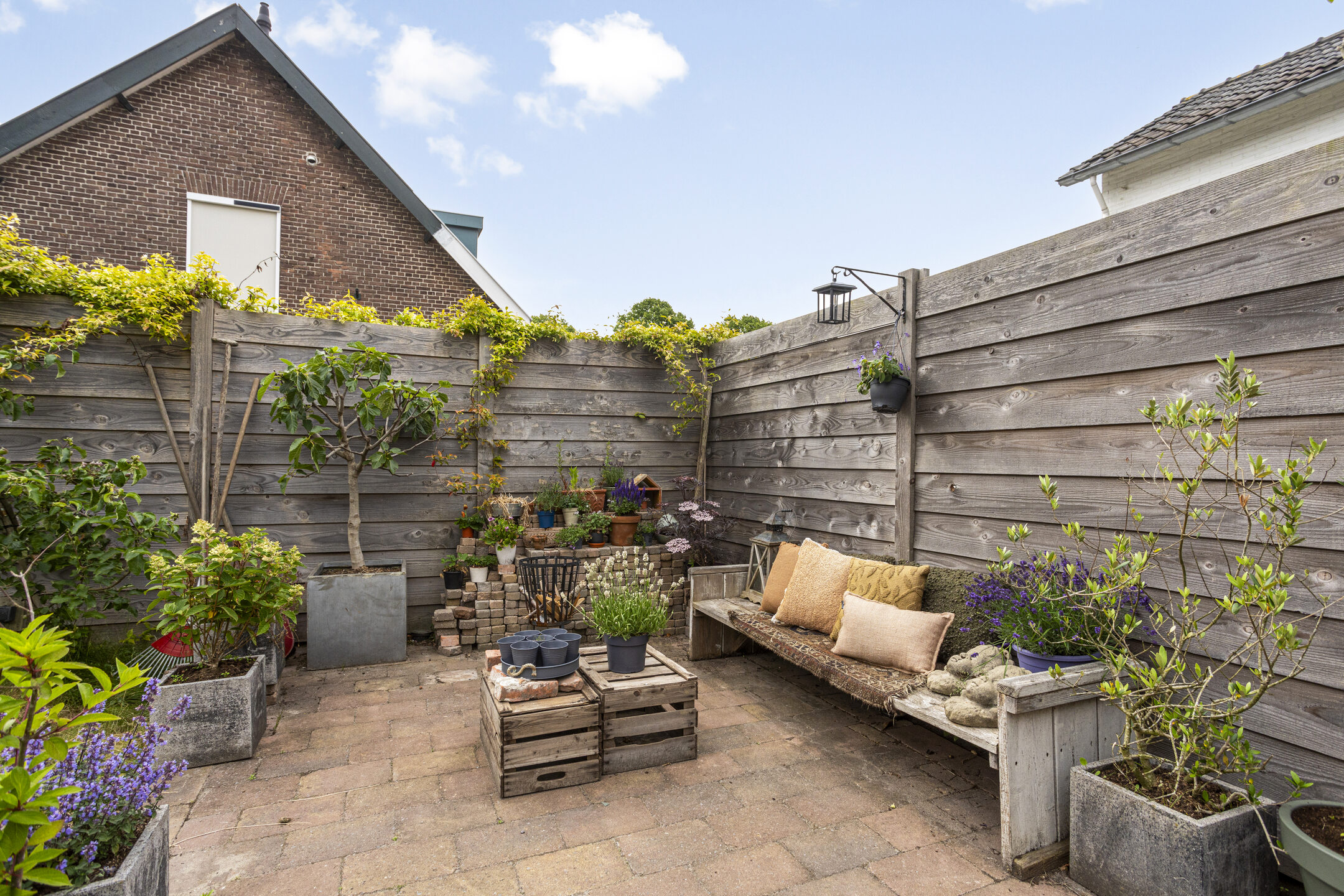 Zeer ruime, ommuurde tuin met veel privacy en een achterom met parkeerplaats. Een tweede parkeerplaats bevindt zich naast de voordeur.