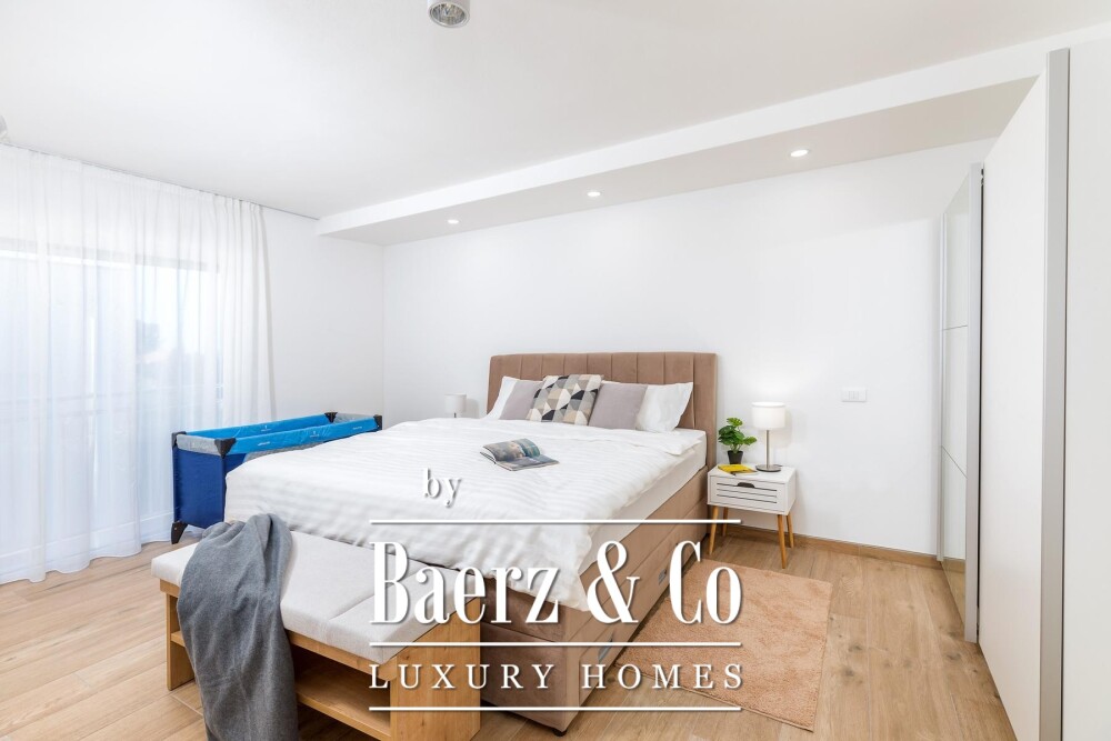 На верхнем уровне располагается ещё одна спальня с выходом на террасу 40 м², откуда открываются панорамные виды на архипелаг Бриюни. На этом уровне также предусмотрены отдельная зона для занятий спортом и сауна, подчёркивая заботу о комфорте и благополучии. Вилла с пятью спальнями и пятью ванными, солнечными панелями, системой тёплого пола и тепловым насосом сочетает энергоэффективность и комфорт.