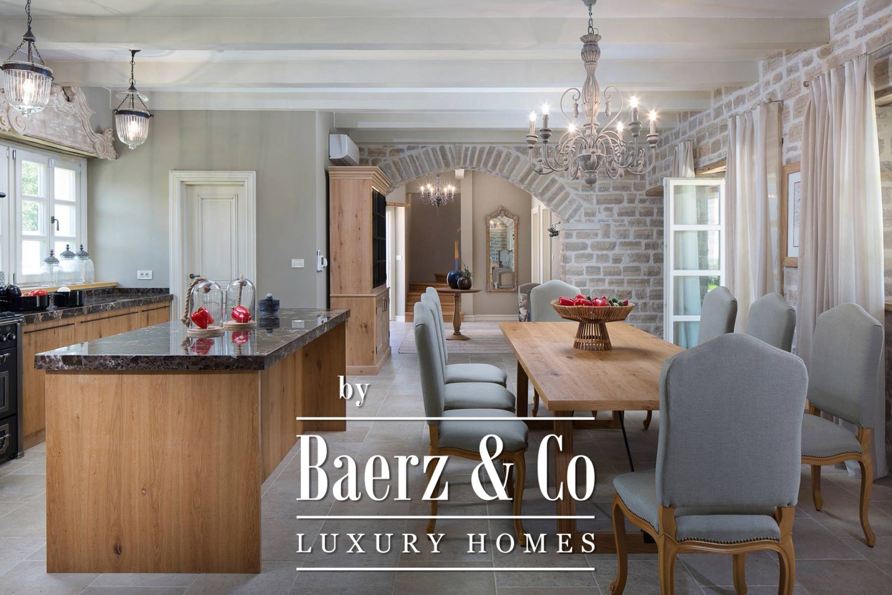 На первом этаже гармонично сочетается просторная гостиная с камином и крытая терраса, объединяющая внутреннее пространство с безупречной летней кухней. Кухня и столовая оборудованы как для ежедневной жизни, так и для приёма гостей, с удобным выходом во двор. Одна спальня с собственным санузлом и гостевой туалет обеспечивают приватность и комфорт. На втором этаже три спальни имеют отдельные ванные комнаты: две из них открываются на балкон с видом на участок.