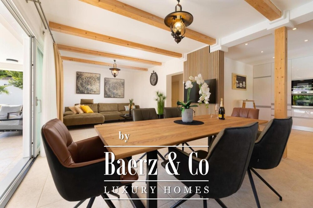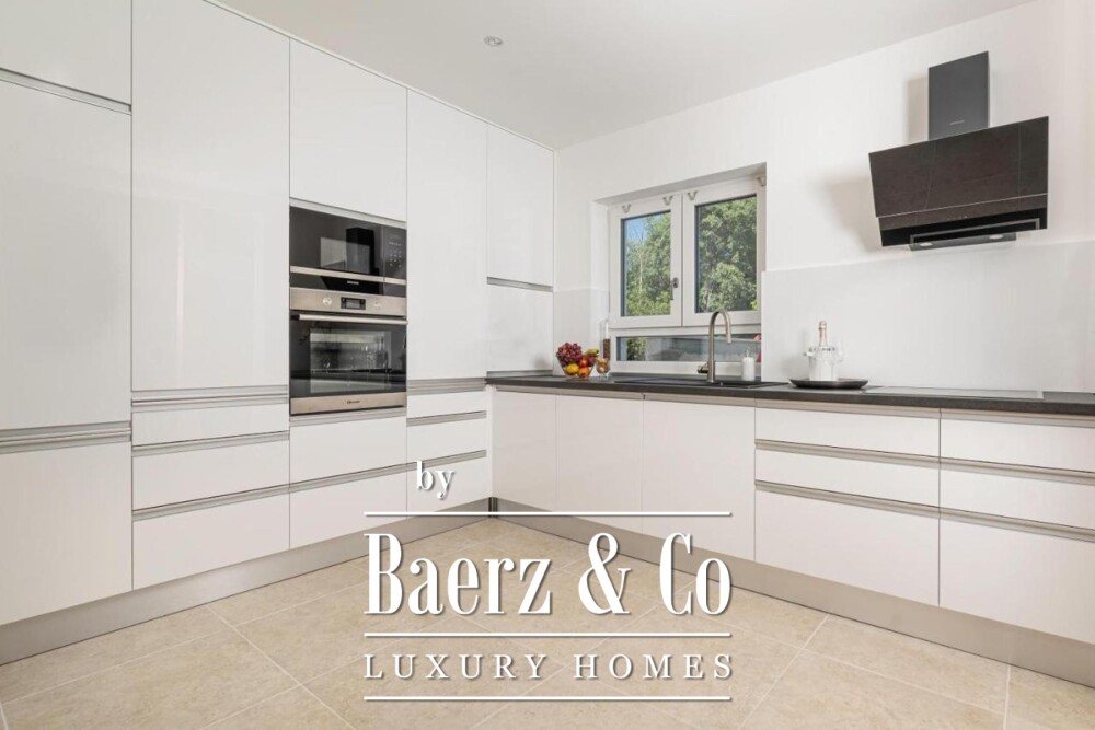 На первом этаже прихожая ведет в просторную гостиную, где кухня и столовая гармонично объединены и выходят в ухоженный сад. Теплый пол с тепловым насосом, кондиционирование воздуха и ПВХ-остекление создают комфорт круглый год. Качественная керамика и паркет придают интерьеру тактильную основу, а система сигнализации и видеонаблюдения обеспечивают спокойствие.
