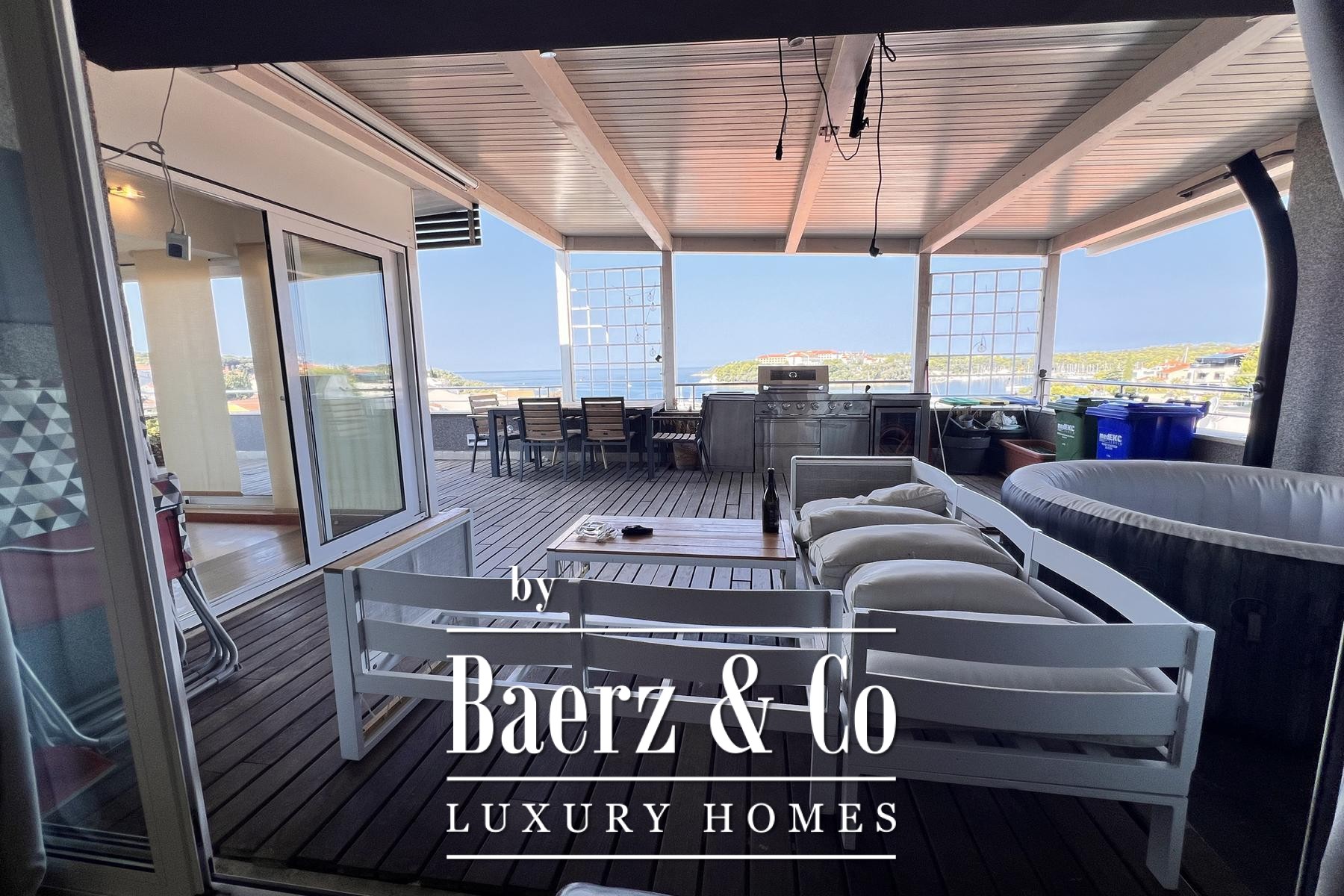 Апартаменты Medulin расположены всего в 100 метрах от Адриатики и представляют собой светлый пентхаус площадью 200 м² в районе Пещеяна Увала. Недвижимость выделяется прямым, панорамным видом на море с просторной крытой террасы, оборудованной джакузи и барбекю для долгих вечеров у воды. Апартаменты занимают весь второй этаж и предлагают открытую планировку гостиной, которая элегантно объединяет кухню и столовую, а также пять спален и две ванные комнаты, идеально приспособленные как для уединения, так и для встреч с близкими. Паркет придает помещению тепло, а на кухне и в ванных комнатах использованы тщательно подобранные керамические элементы. Терраса с тиковым настилом гармонично объединяет спокойствие открытого пространства с ритмом Средиземноморья.
