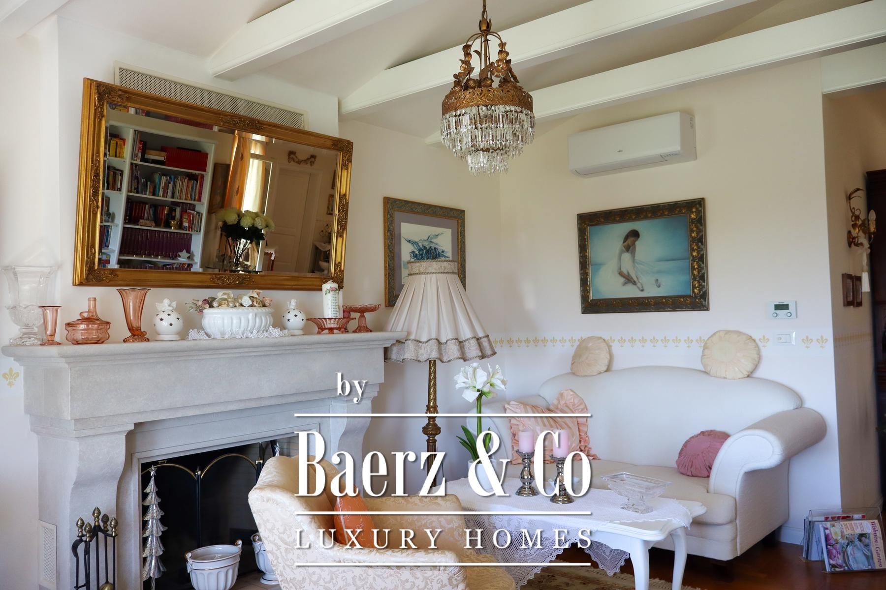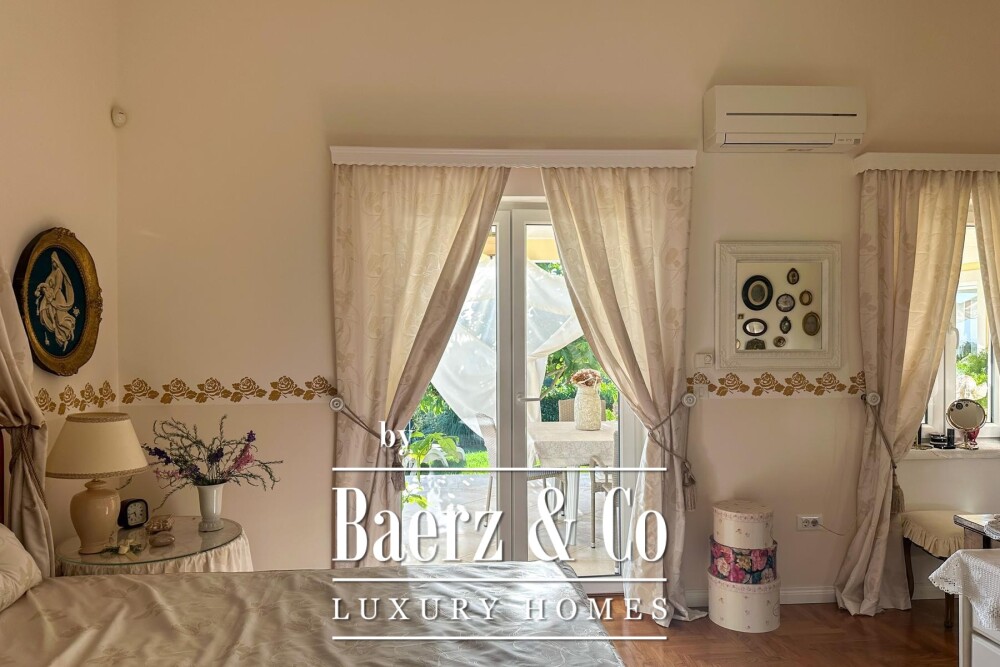 Участок площадью 826 м² воплощает средиземноморскую преемственность: оливковые деревья, цветочные сады и пруд с фонтаном формируют ритм пространств на свежем воздухе. Крытая терраса выходит на виноградники, оливковые рощи и море; участок расположен на краю зоны застройки, что гарантирует долговременные, неограниченные панорамные виды. Сад оборудован автоматическим поливом, обрамлён зрелым газоном и живой изгородью. В числе дополнительных удобств — отдельная летняя кухня площадью 12,5 м² с кладовой и два садовых домика для инструментов и дров для камина.