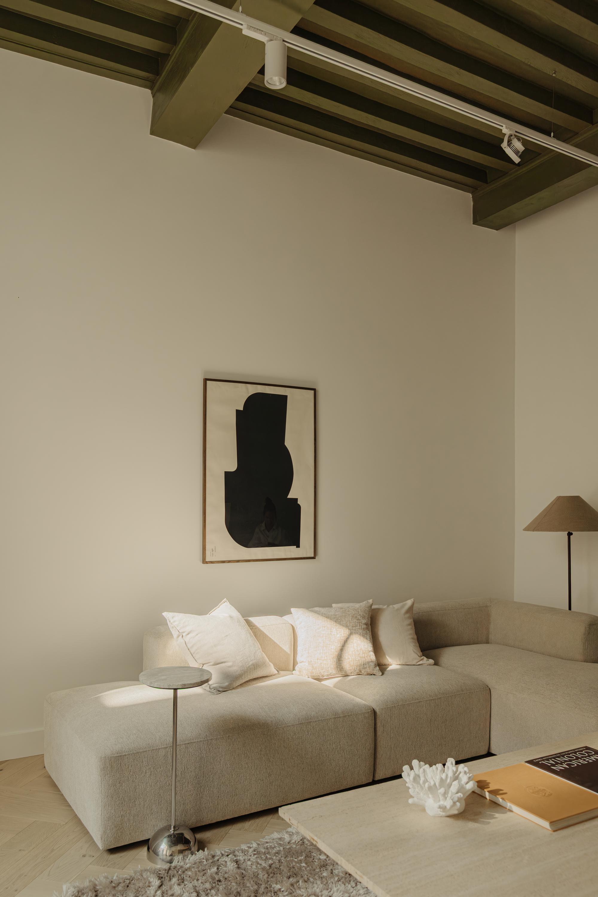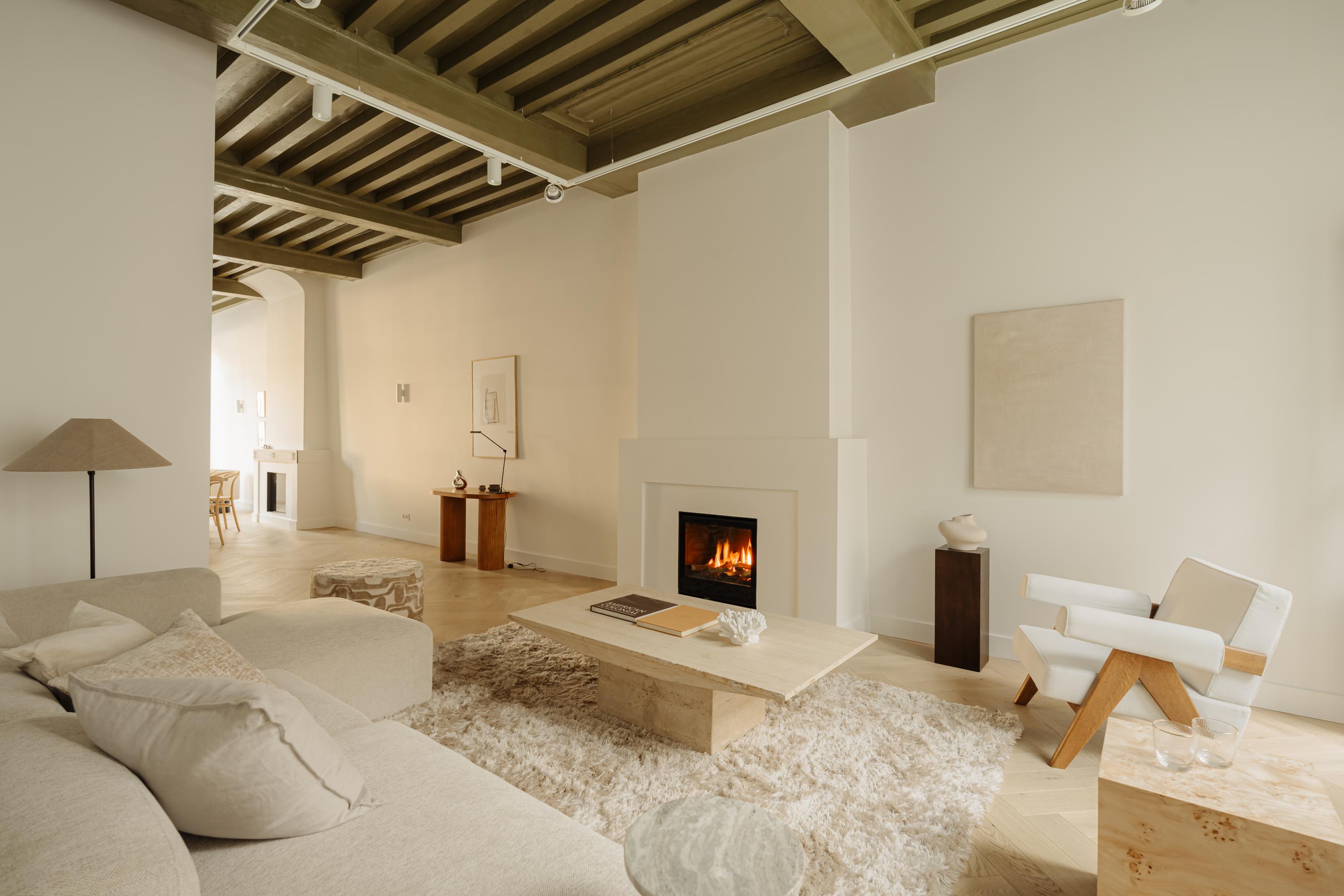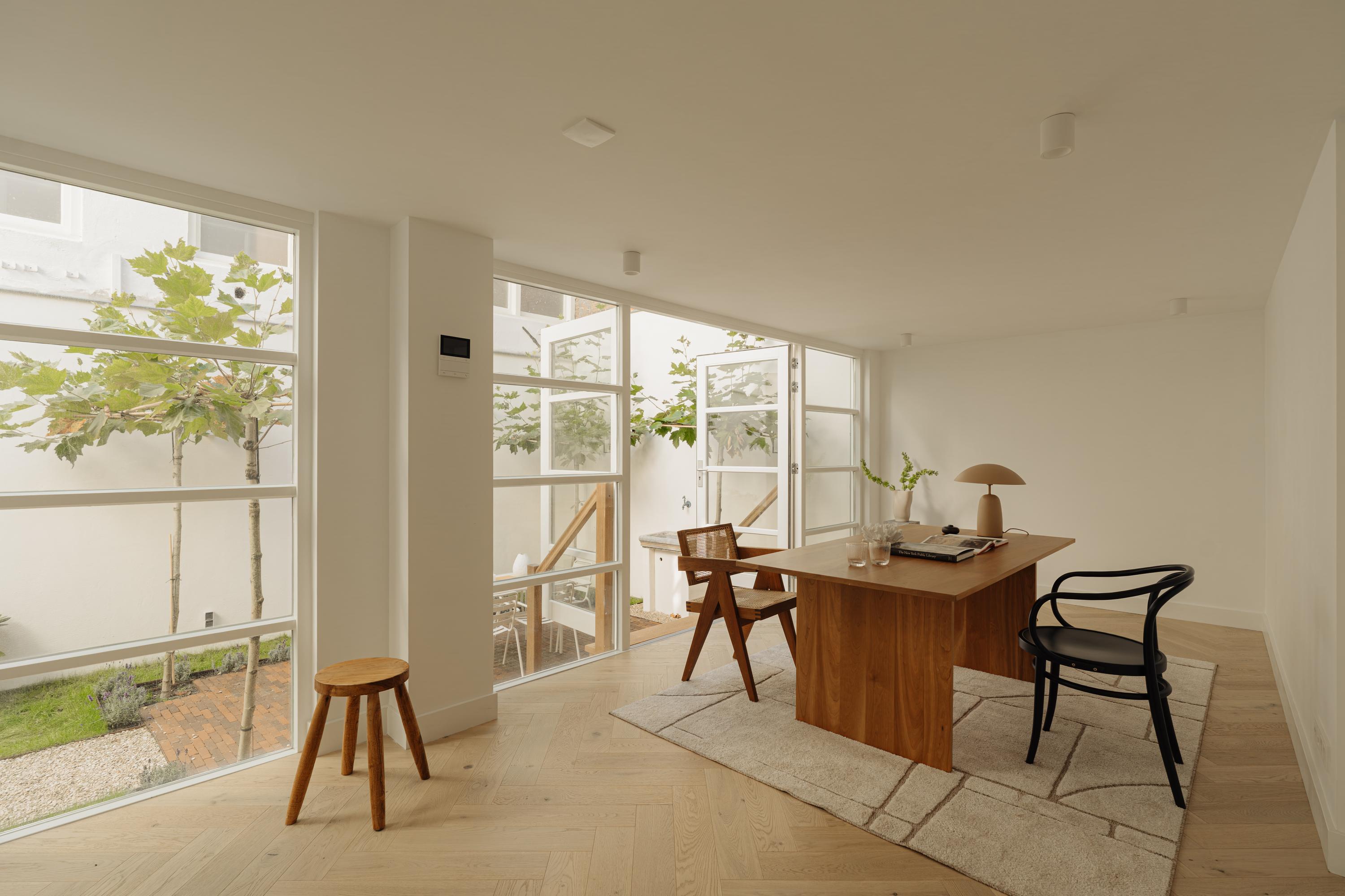 下沉楼层设有厨房与餐区,甄选天然材质与定制橱柜,配备壁炉并直接联通幽静的城市花园。功能与雅致兼具,尽显高端家电、天然石材岛台与细腻橡木人字拼地板的匠心。抬高的主层入口以大理石玄关与挑高 3.4 米的客厅空间迎宾,双面壁炉及运河景观令大气与私密和谐交融。