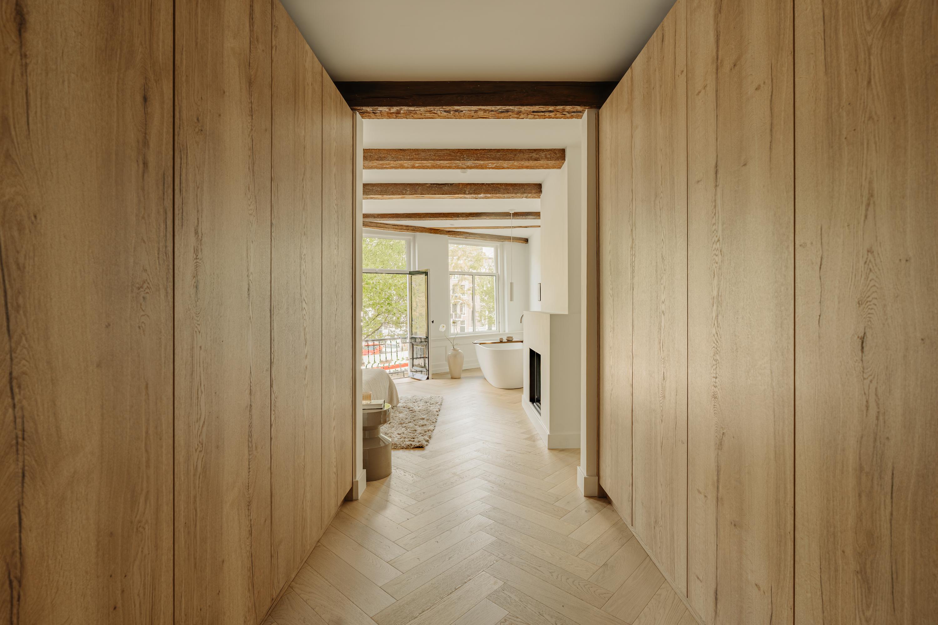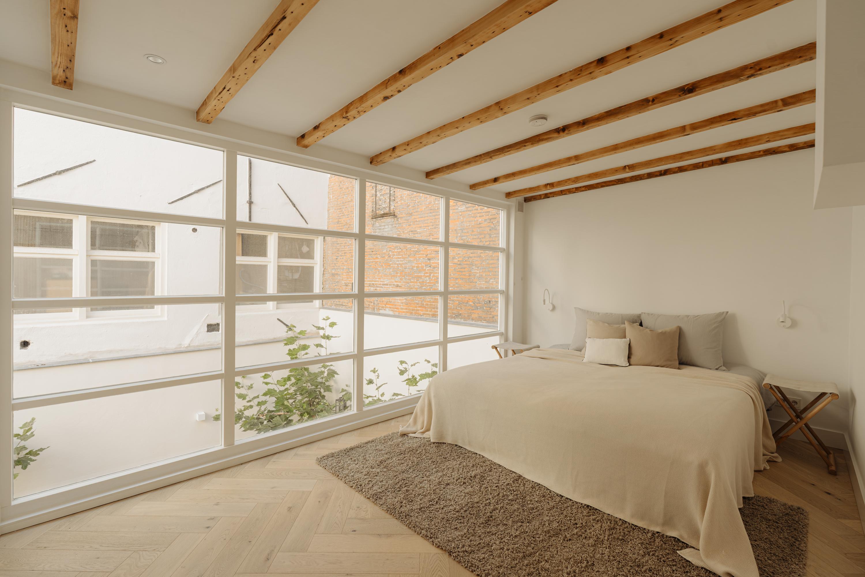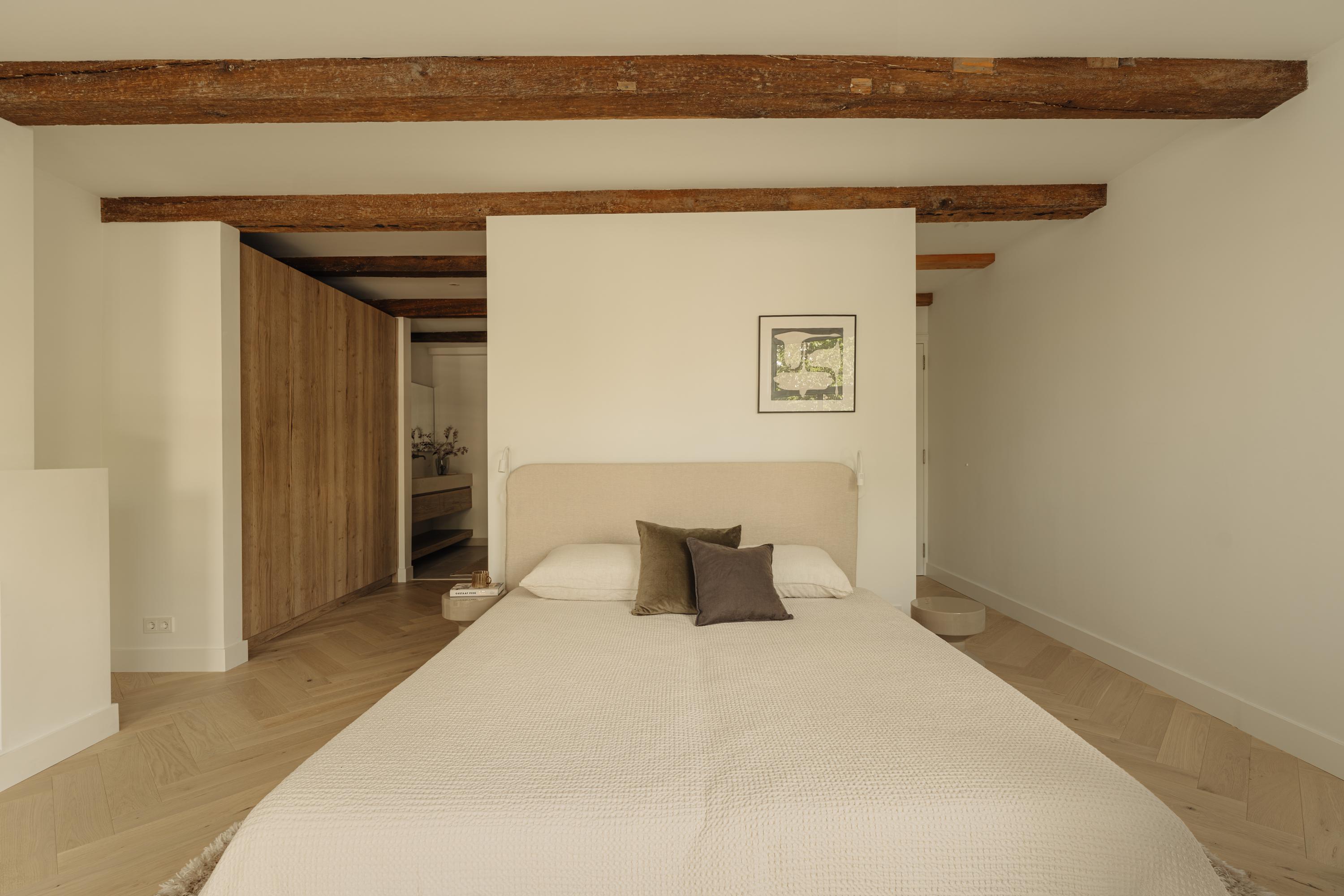 一层与二层为多间卧室,采用静谧材质并配备定制衣柜。主卧面朝运河,拥有法式阳台、独立浴缸及以天然石材与木饰精制的套间卫浴。其他卧室则面向内花园,适合宾客或多功能生活。顶层设有两间房,后部通往城市天际线一览无余的屋顶露台。