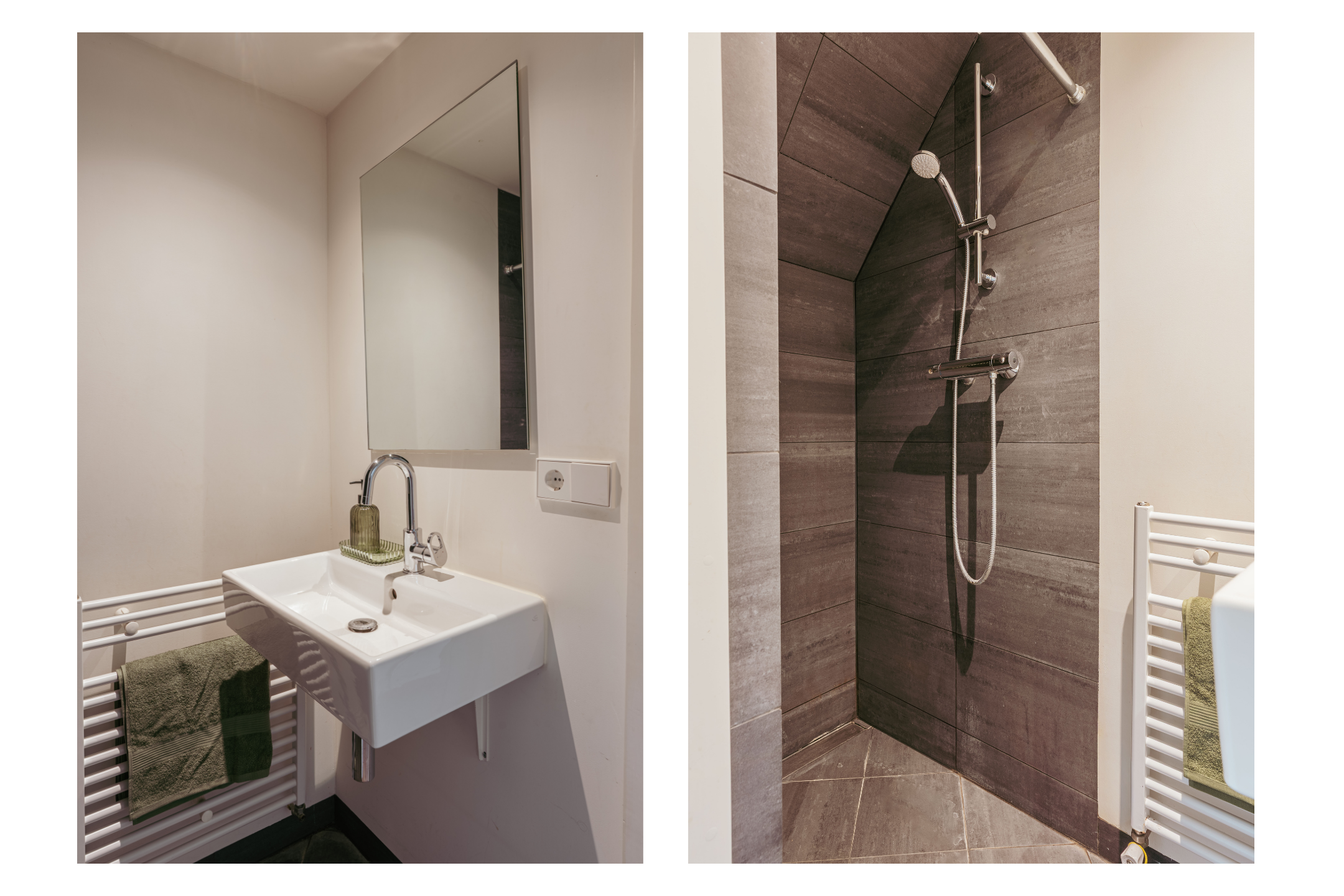 一楼与二楼通过共用及私人楼梯巧妙衔接,实现了生活空间的流畅贯通。宽敞的客厅与配备高端嵌入式家电的现代开放式厨房相连。两侧的大窗引入充足日光,简约壁炉为空间增添柔和焦点。主卧与客卧均配置定制衣柜,法式落地门通向阳光明媚的阳台,其中一处朝西南方向,适合午后小憩。