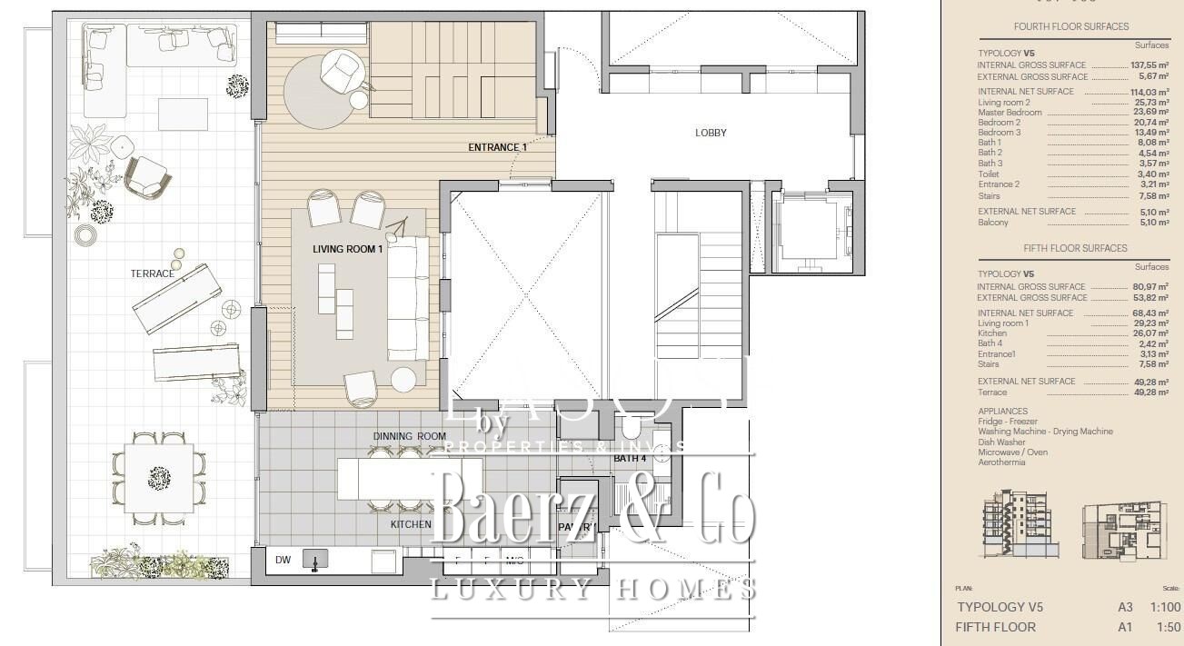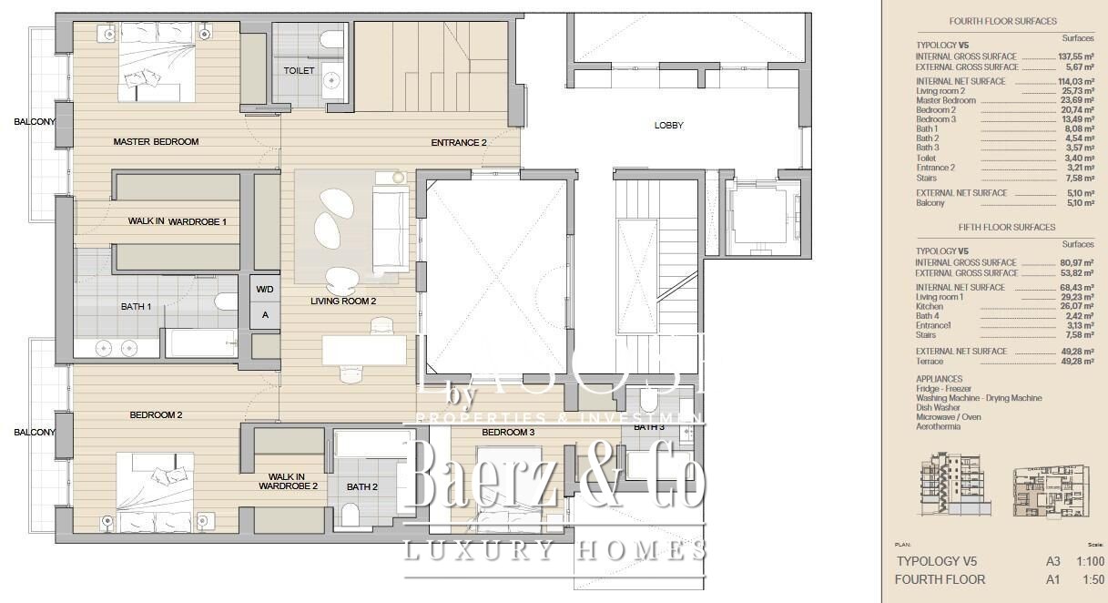 户型设有三间卧室和五间浴室,无论是私密生活还是优雅待客都能完美兼容。高端精致的饰面与现代家电、空调、供暖系统、可视对讲、安全便利的衣柜以及独立洗衣房相得益彰。