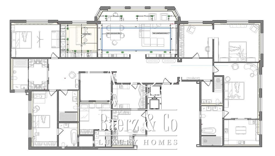 布局兼顾社交与私密,公共生活空间与私人区域合理分隔。宽敞的起居与餐饮区域享有无阻视野,俯瞰Turó Park的绿意盎然与日光静谧。独立厨房既满足家庭私享,也适合优雅待客。五间卧室中有三间为外向式设计,采光充沛。六间浴室,包括四间全卫与两间套间浴室,为家人及宾客带来舒适和私密。